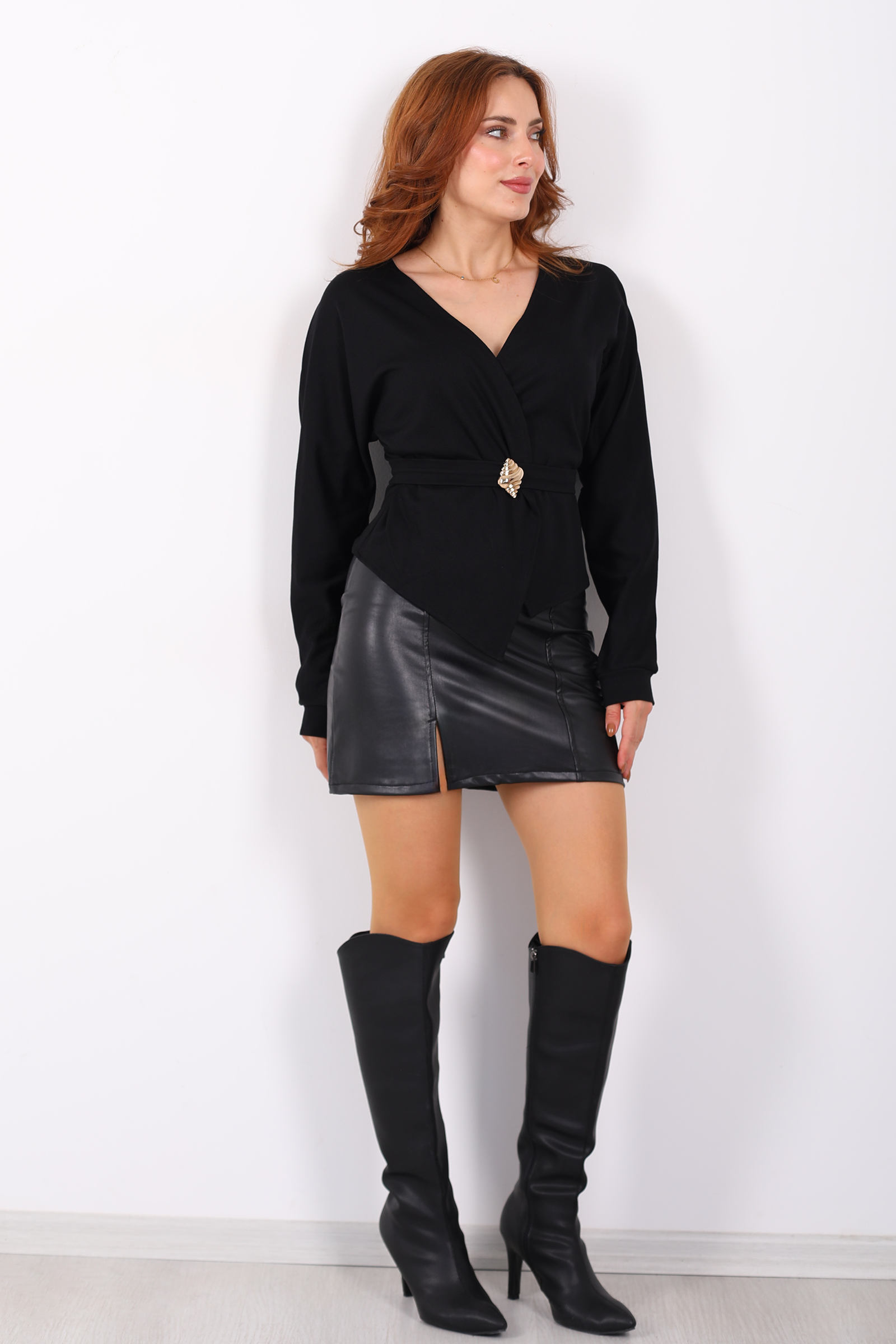 Kruvaze Yaka Kemer Aksesuarlı Siyah Kadın Bluz
