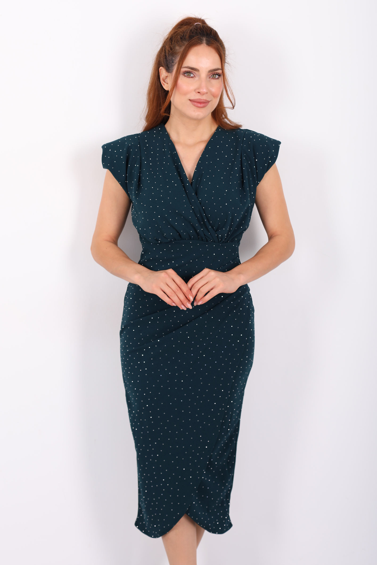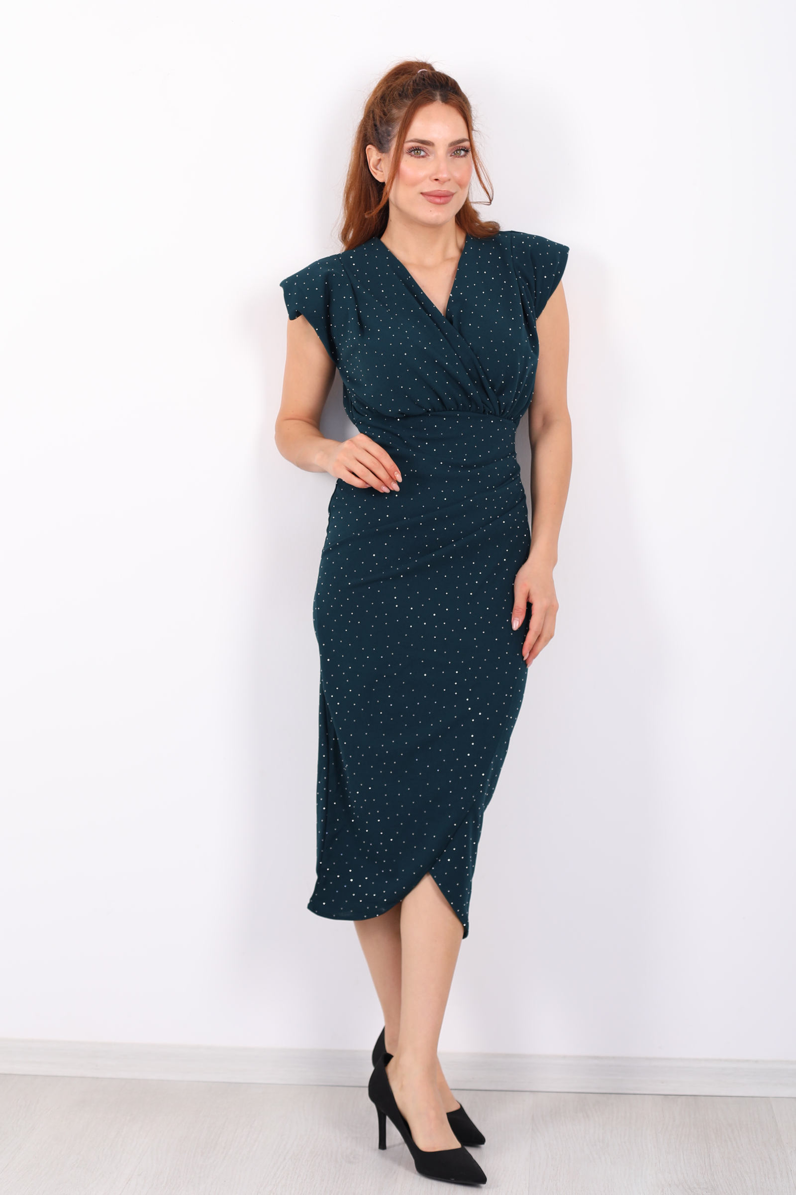 Kruvaze Yaka Taşlı Vatkalı Petrol Yeşili Kadın Midi Elbise