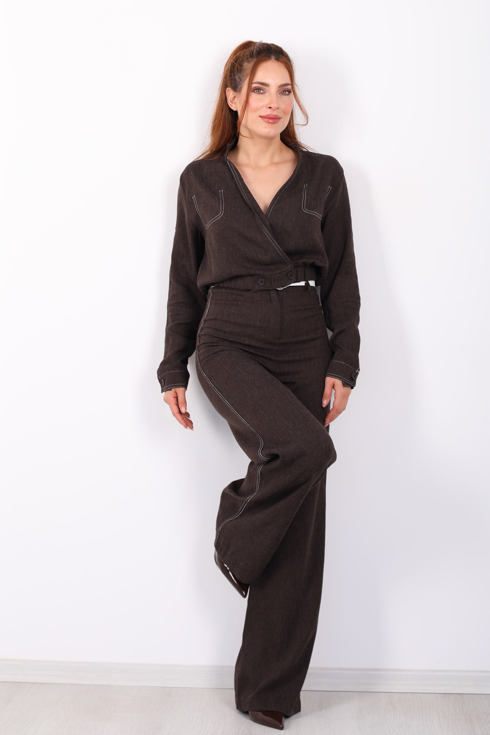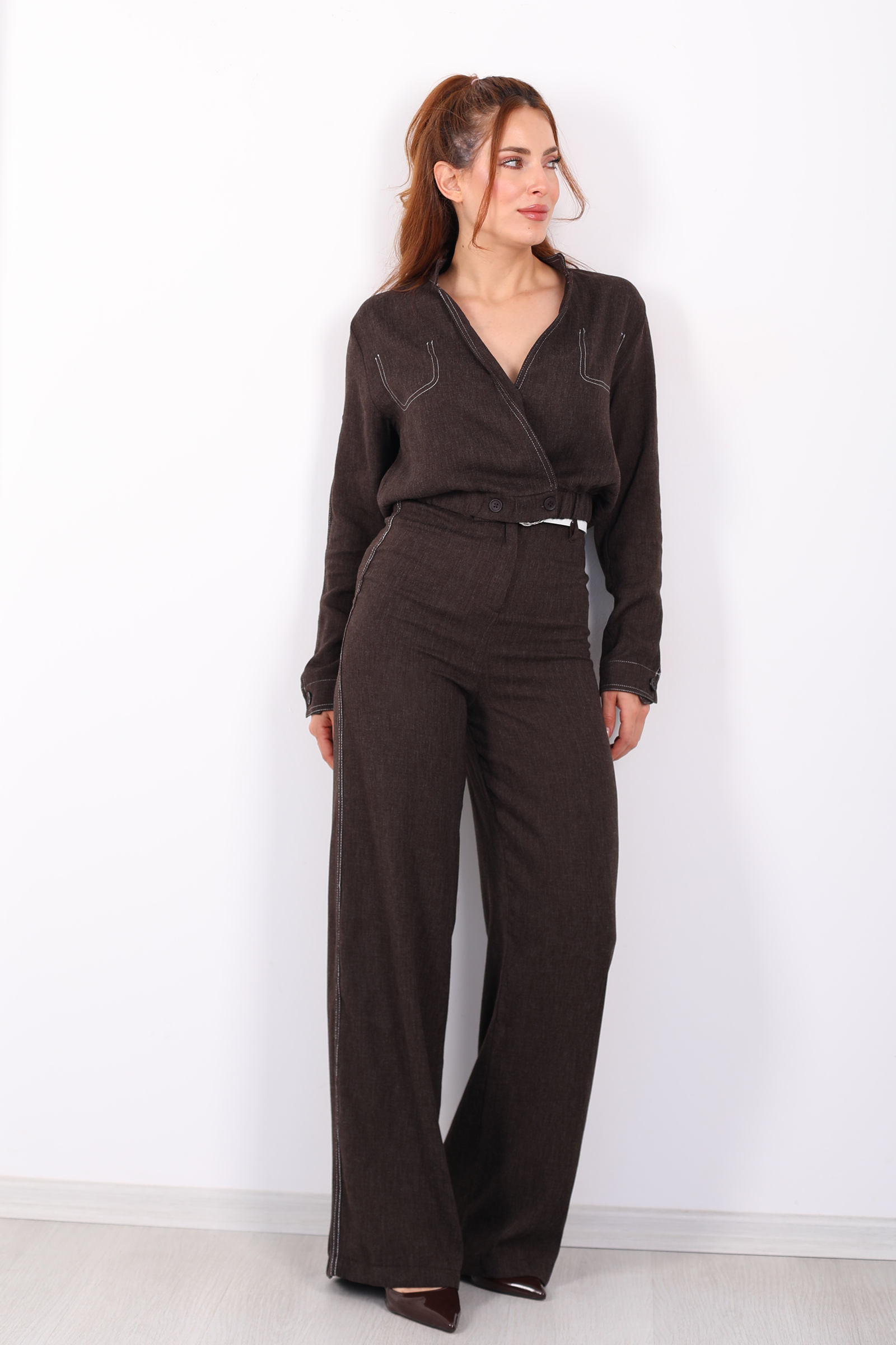 Kruvaze Yaka Ters Dikişli Kemerli Bol Paça Kahverengi Kadın Takım