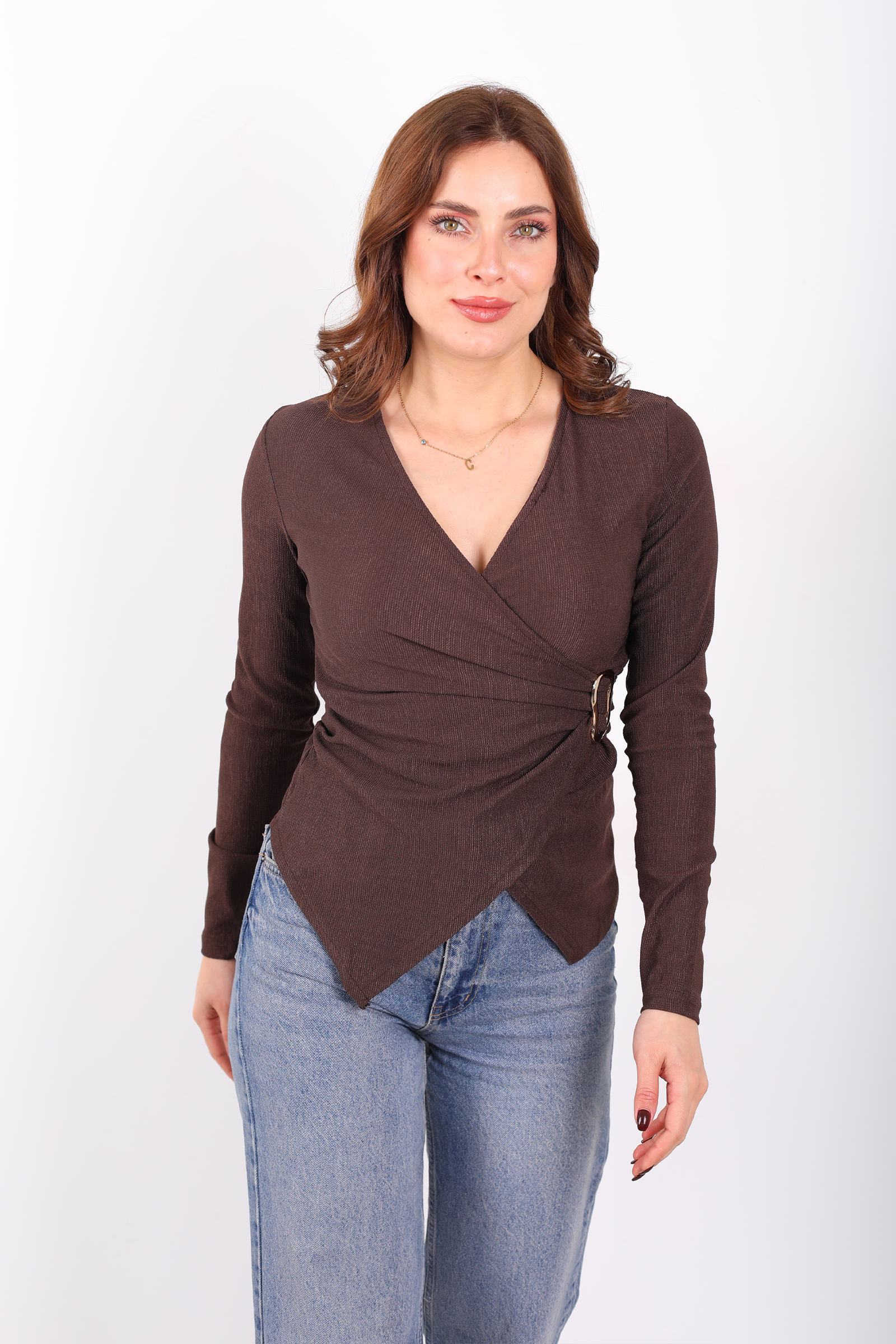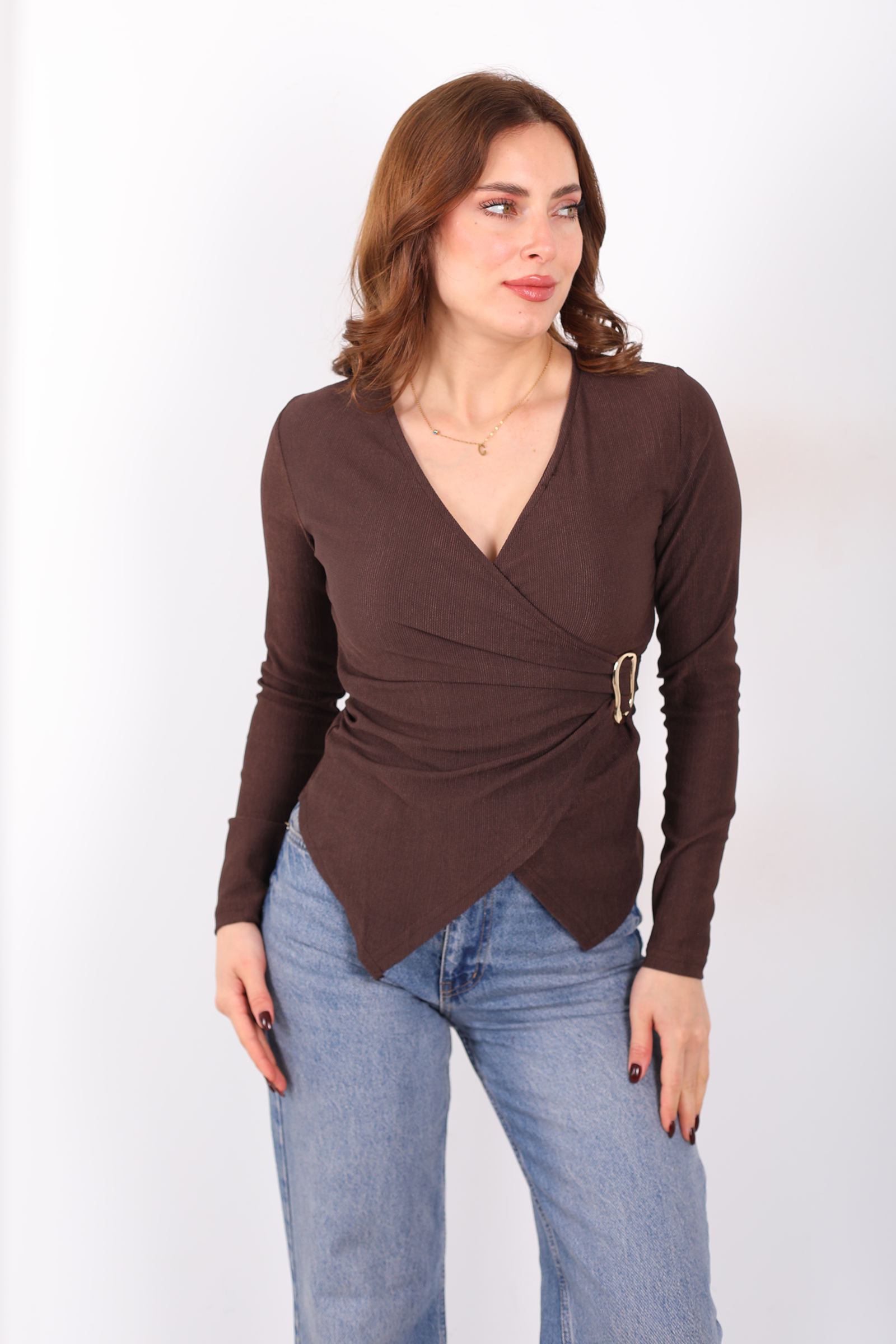Kruvaze Yaka Toka Detaylı Acı Kahve Kadın Bluz