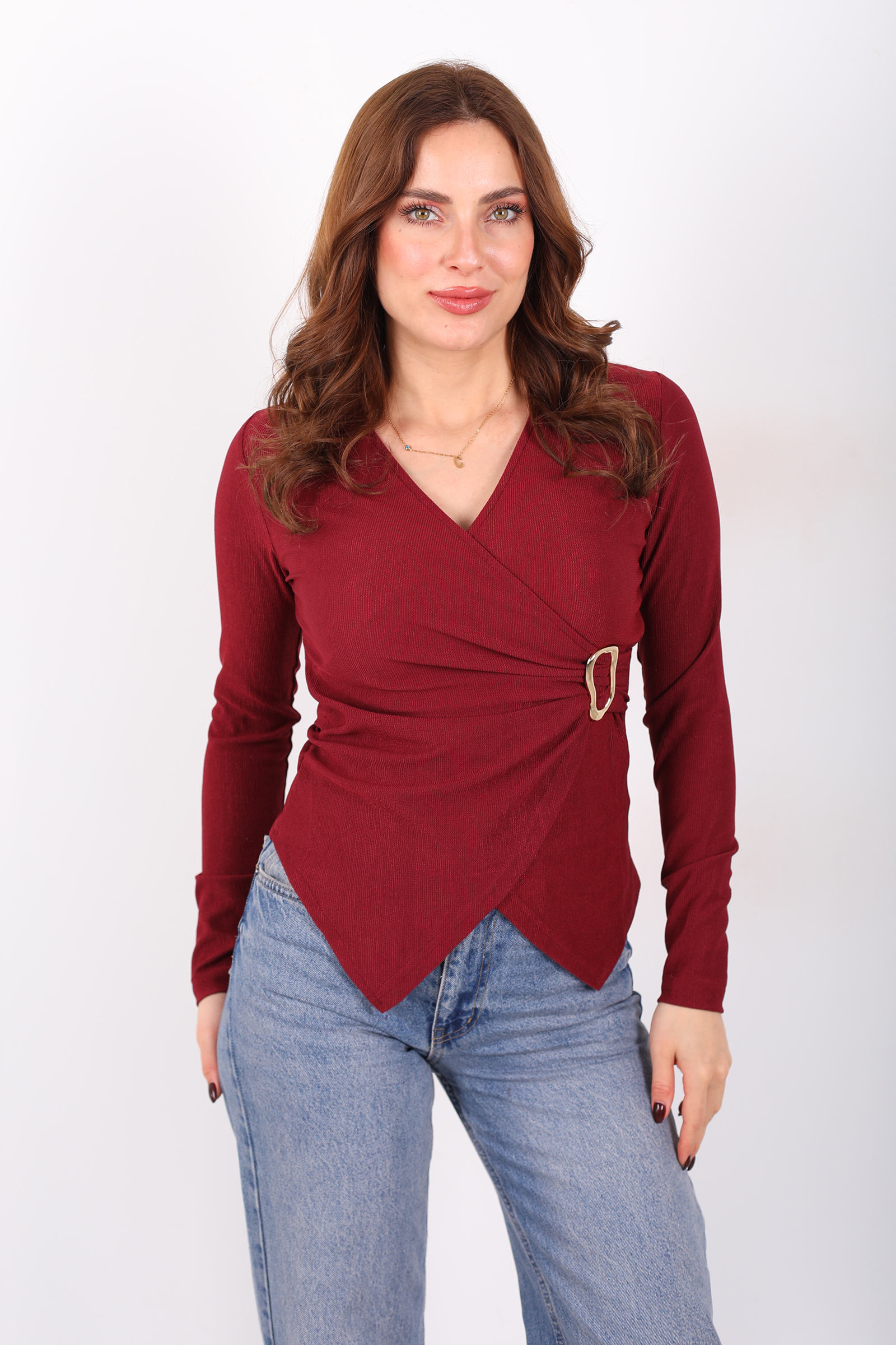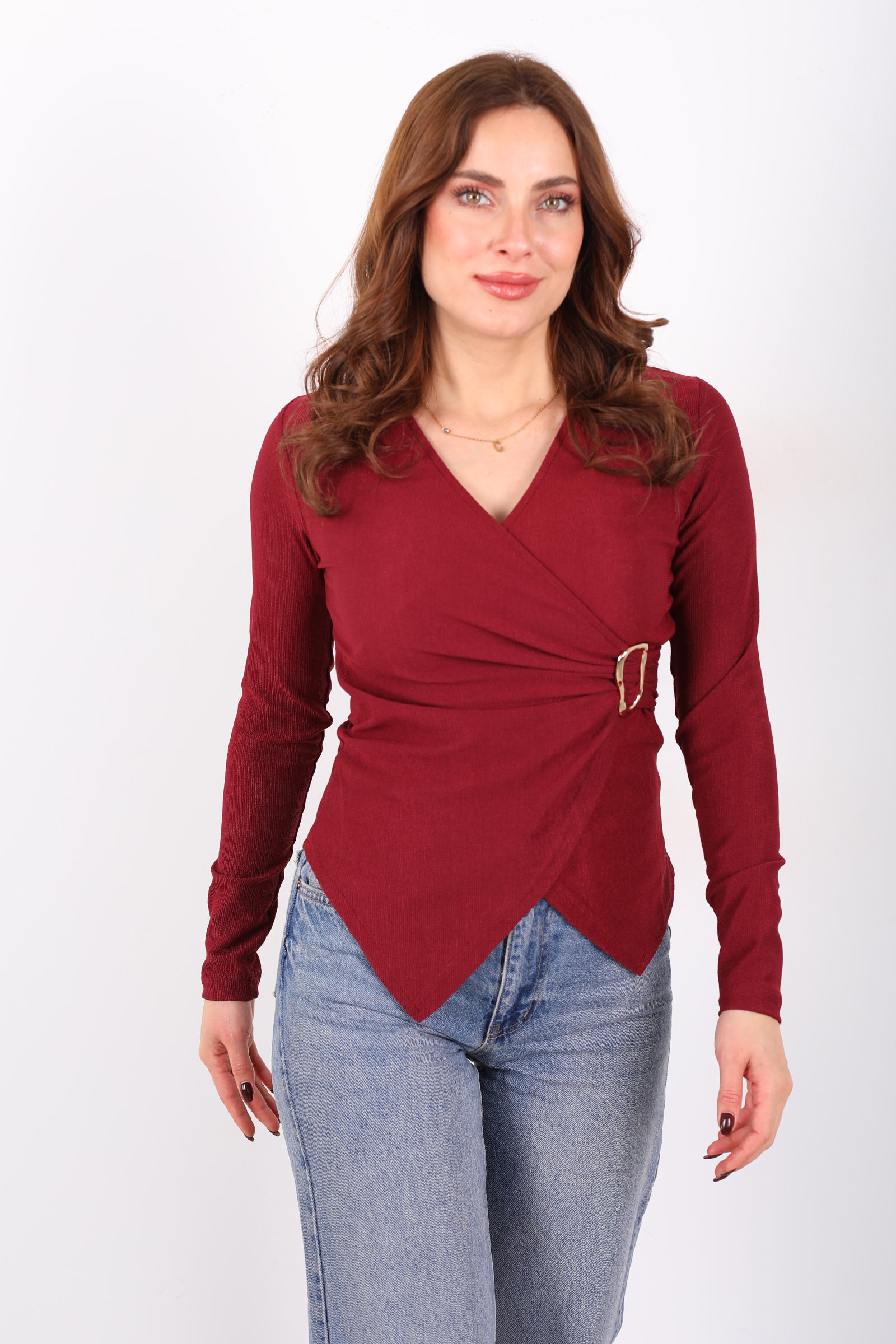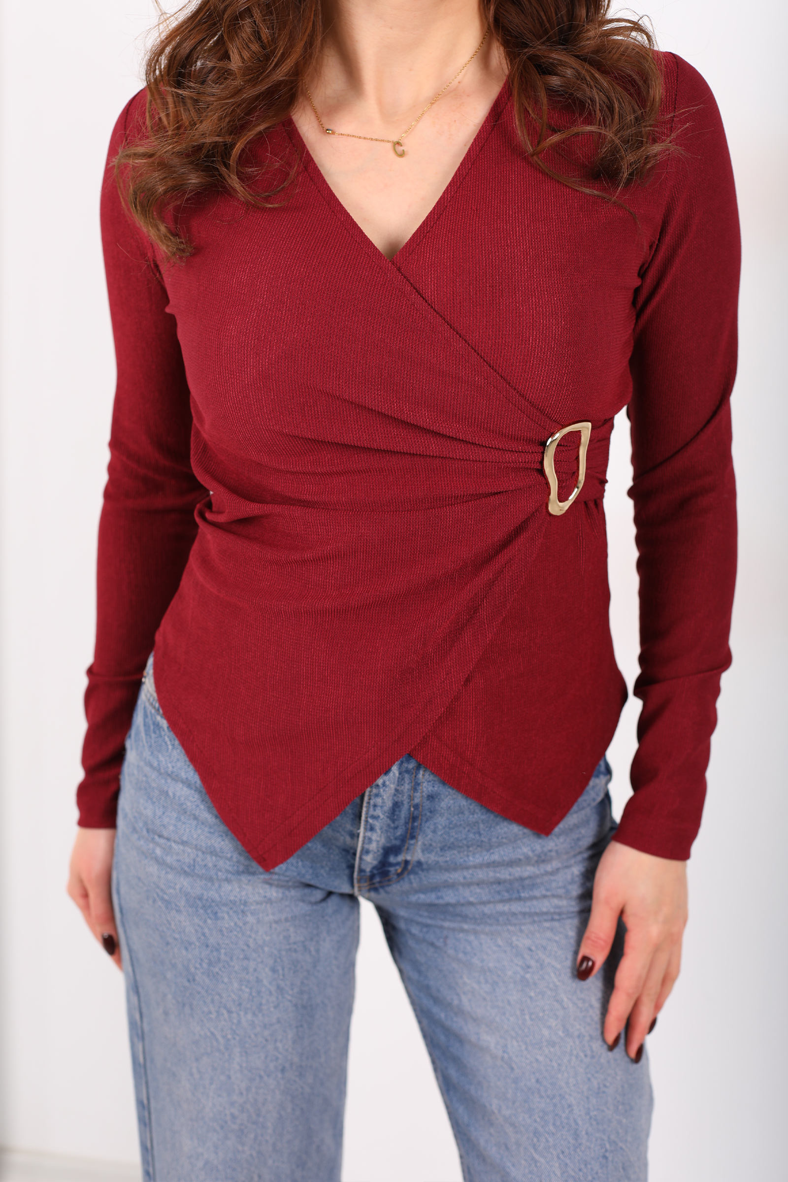 Kruvaze Yaka Toka Detaylı Bordo Kadın Bluz