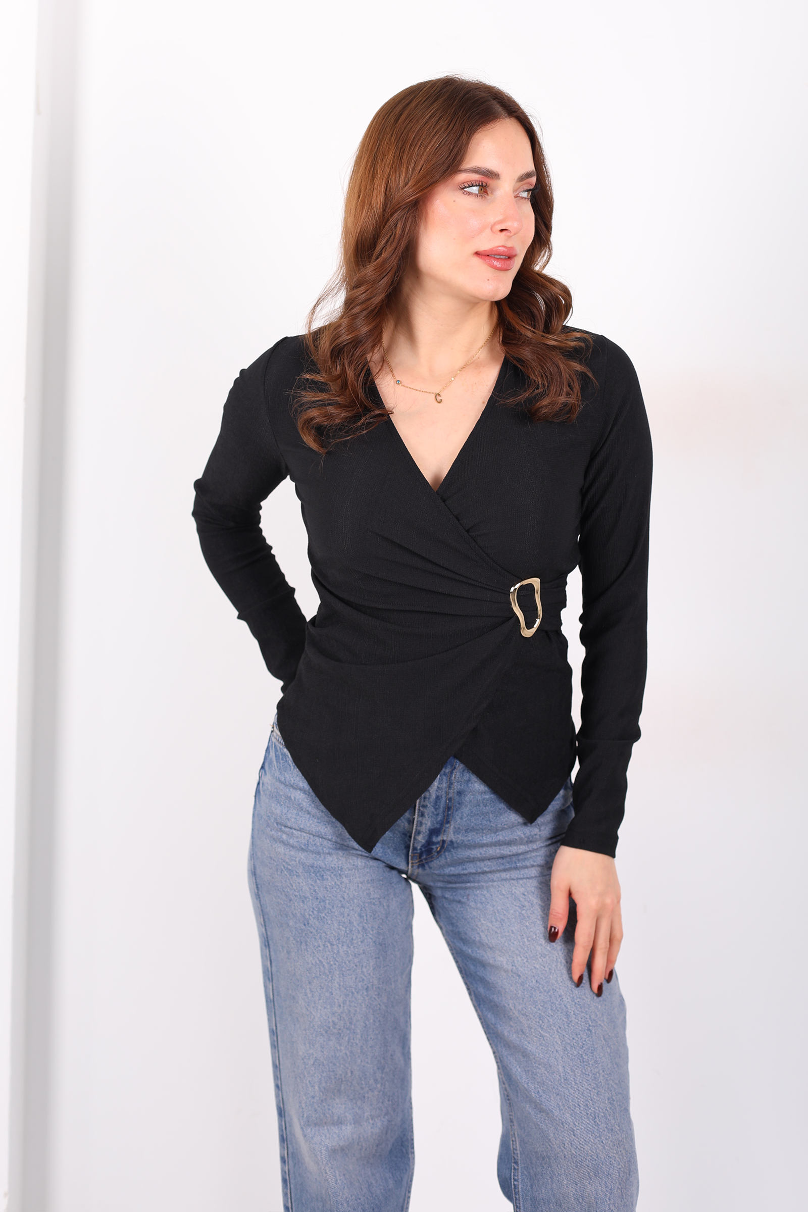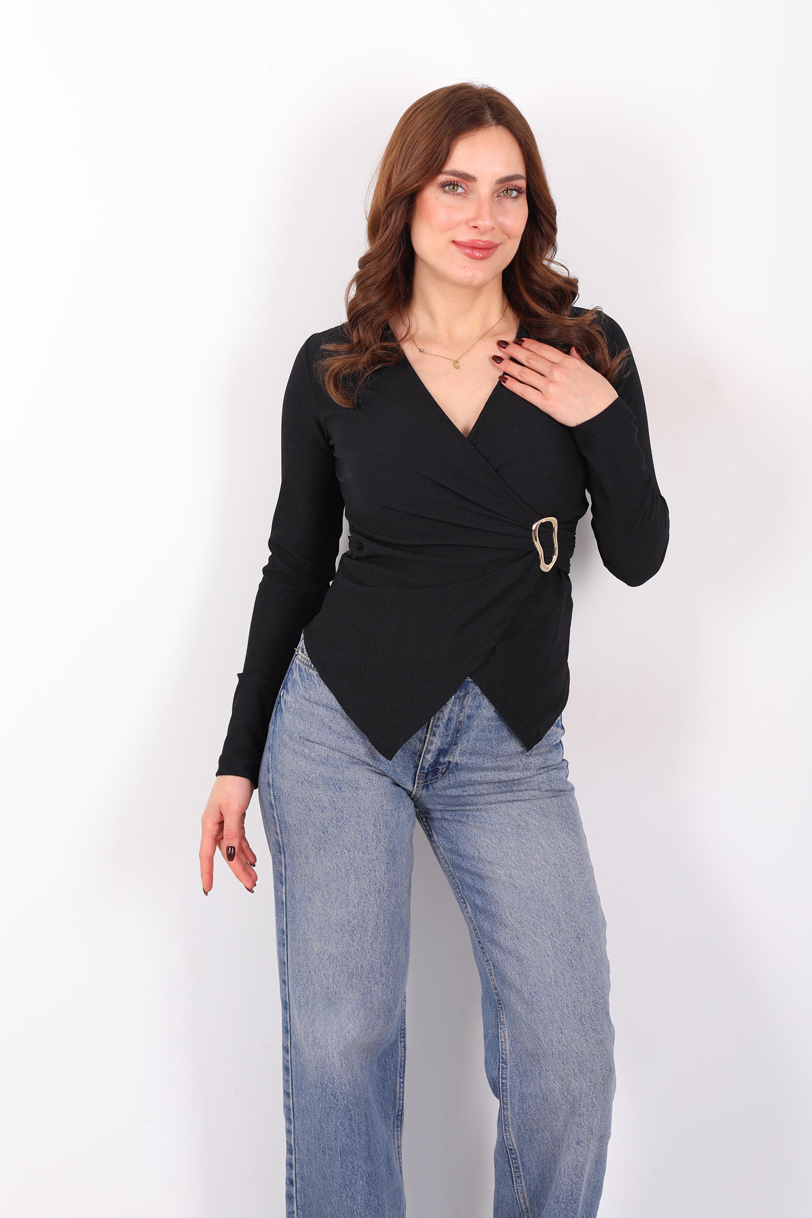 Kruvaze Yaka Toka Detaylı Siyah Kadın Bluz