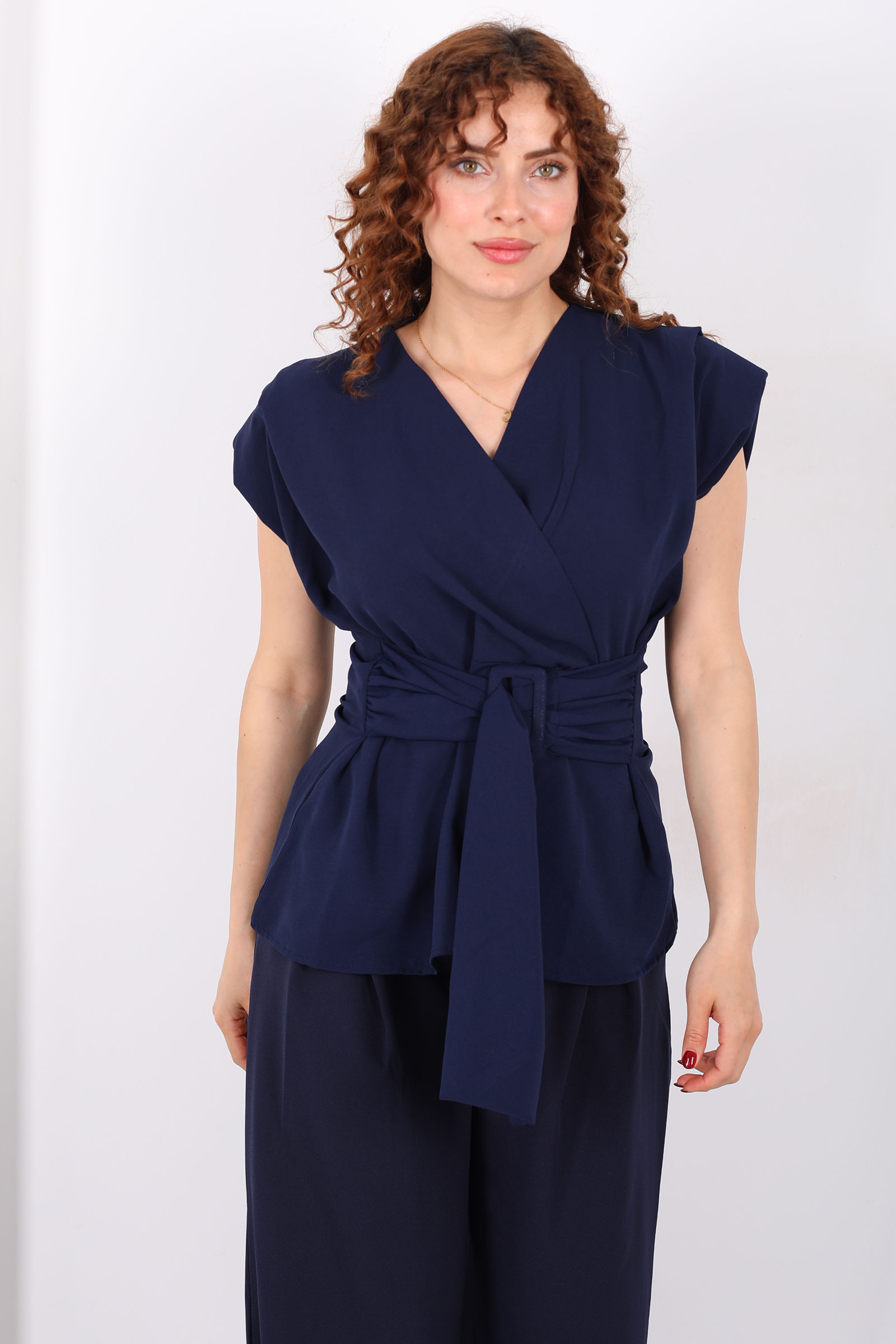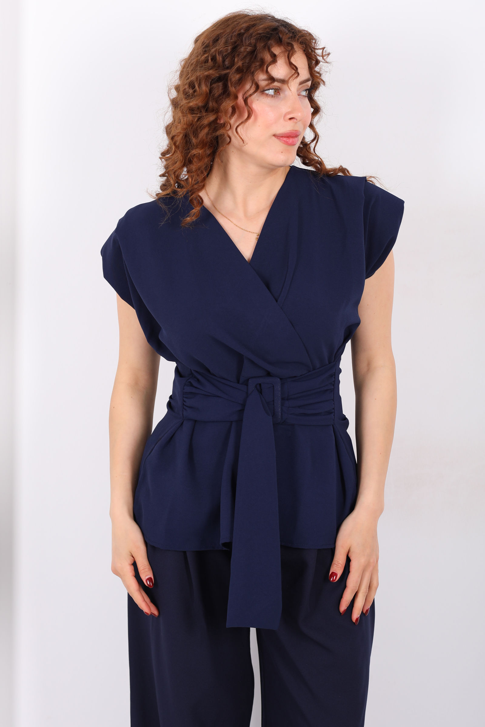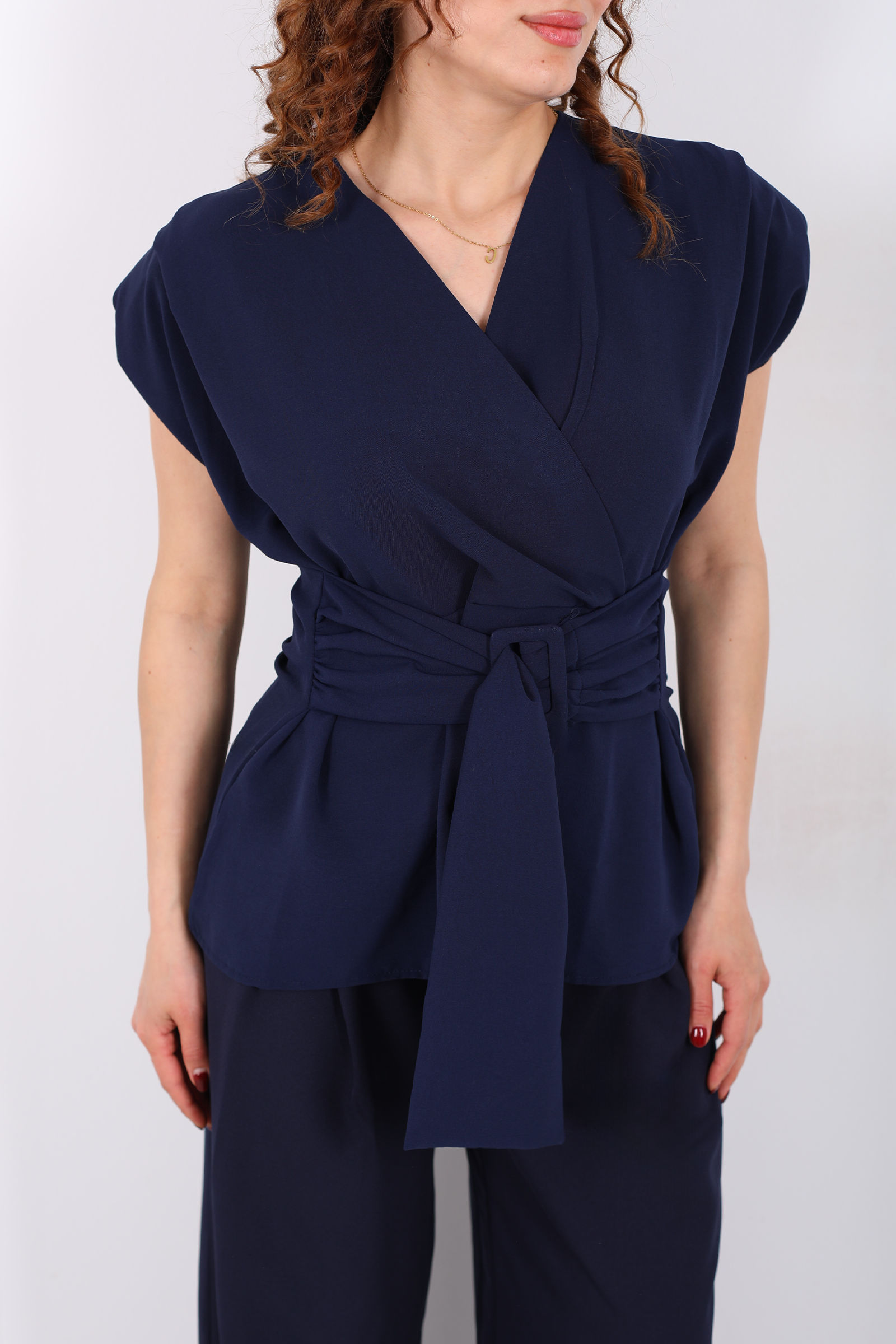 Kruvaze Yaka Yandan Bağlamalı Kadın Lacivert Vatkalı Bluz
