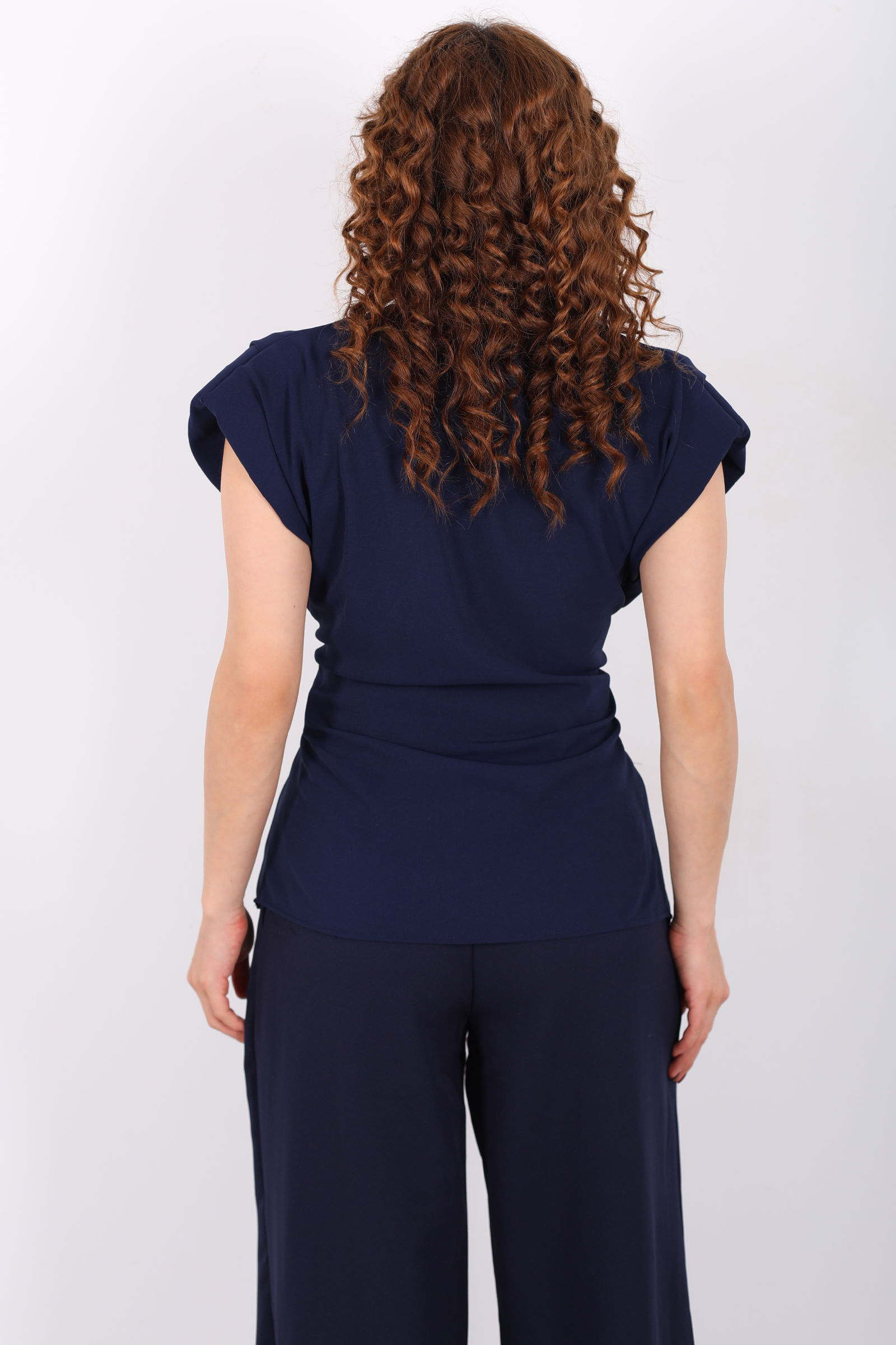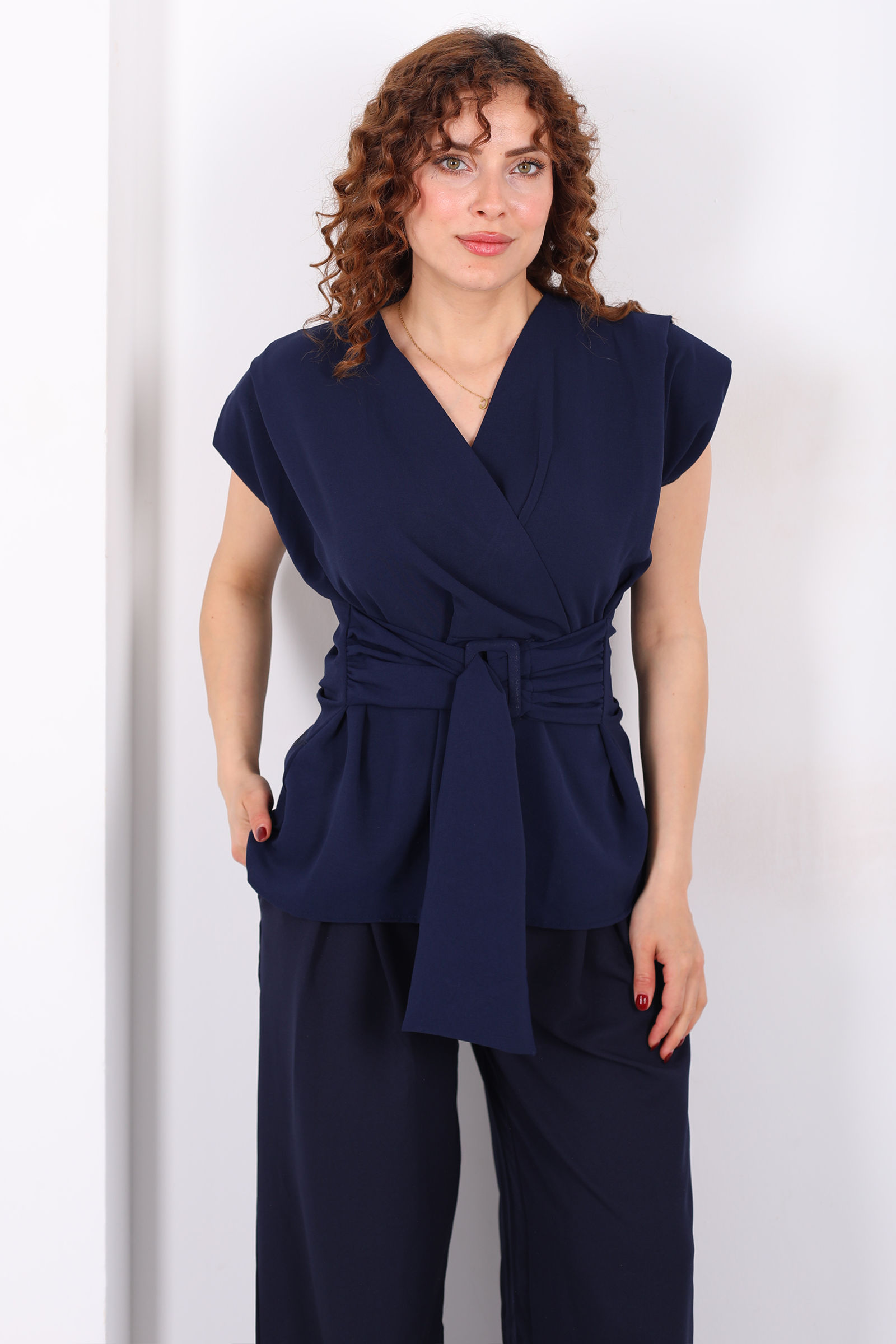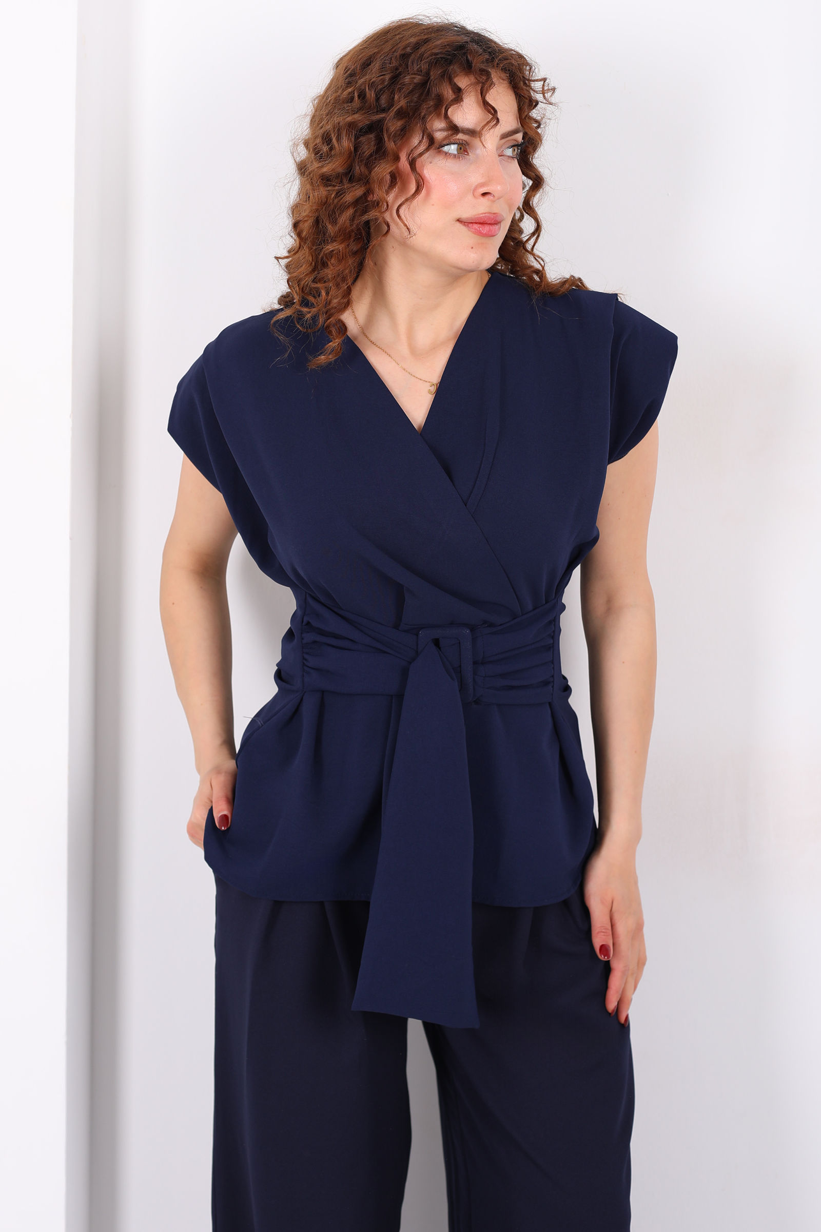 Kruvaze Yaka Yandan Bağlamalı Kadın Lacivert Vatkalı Bluz