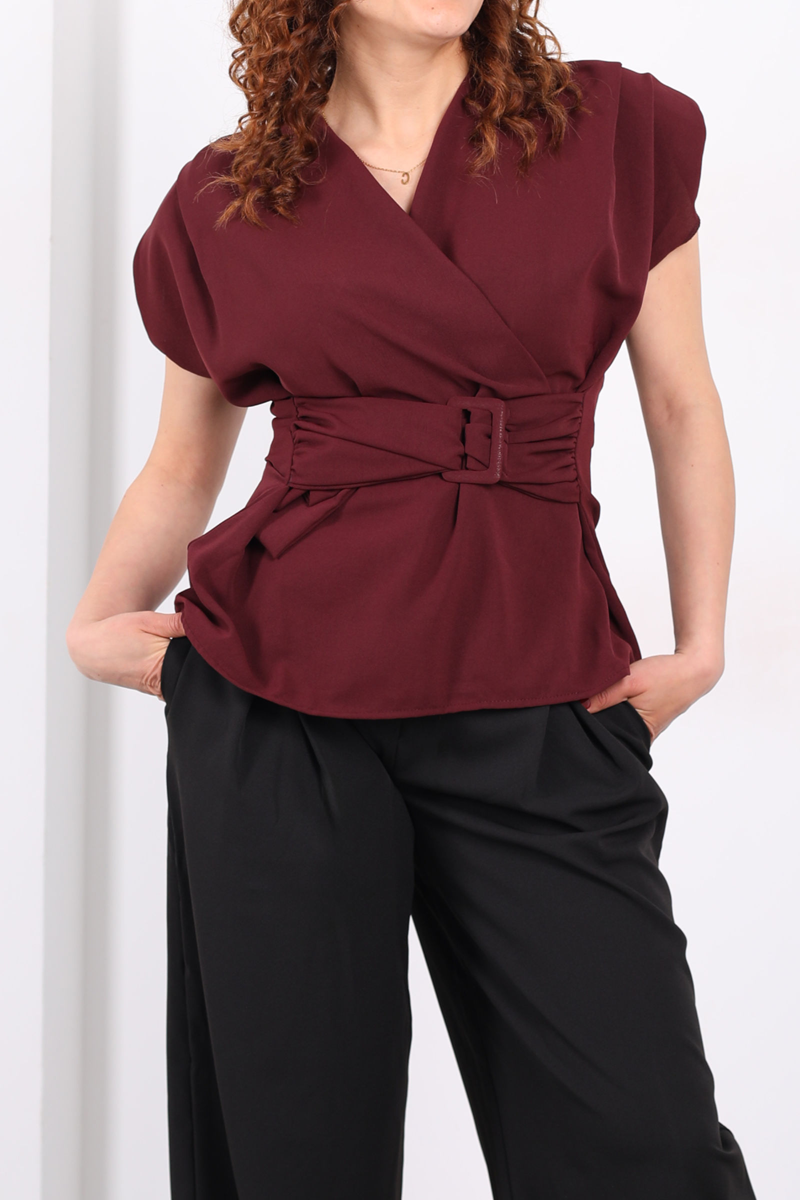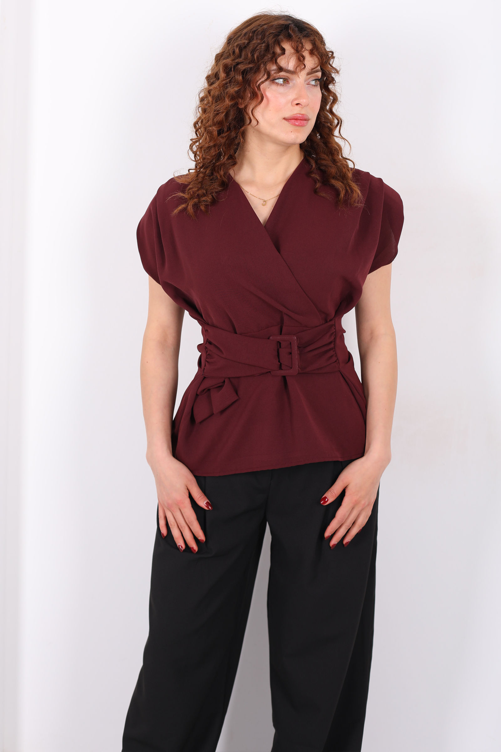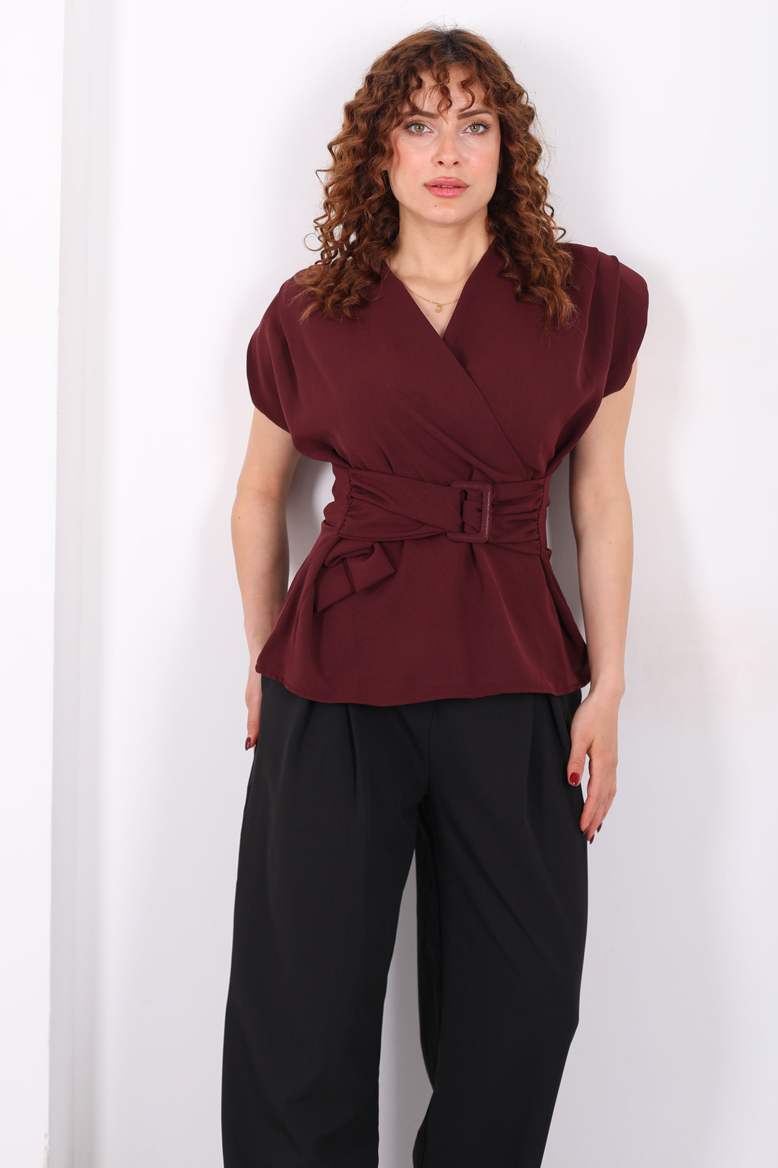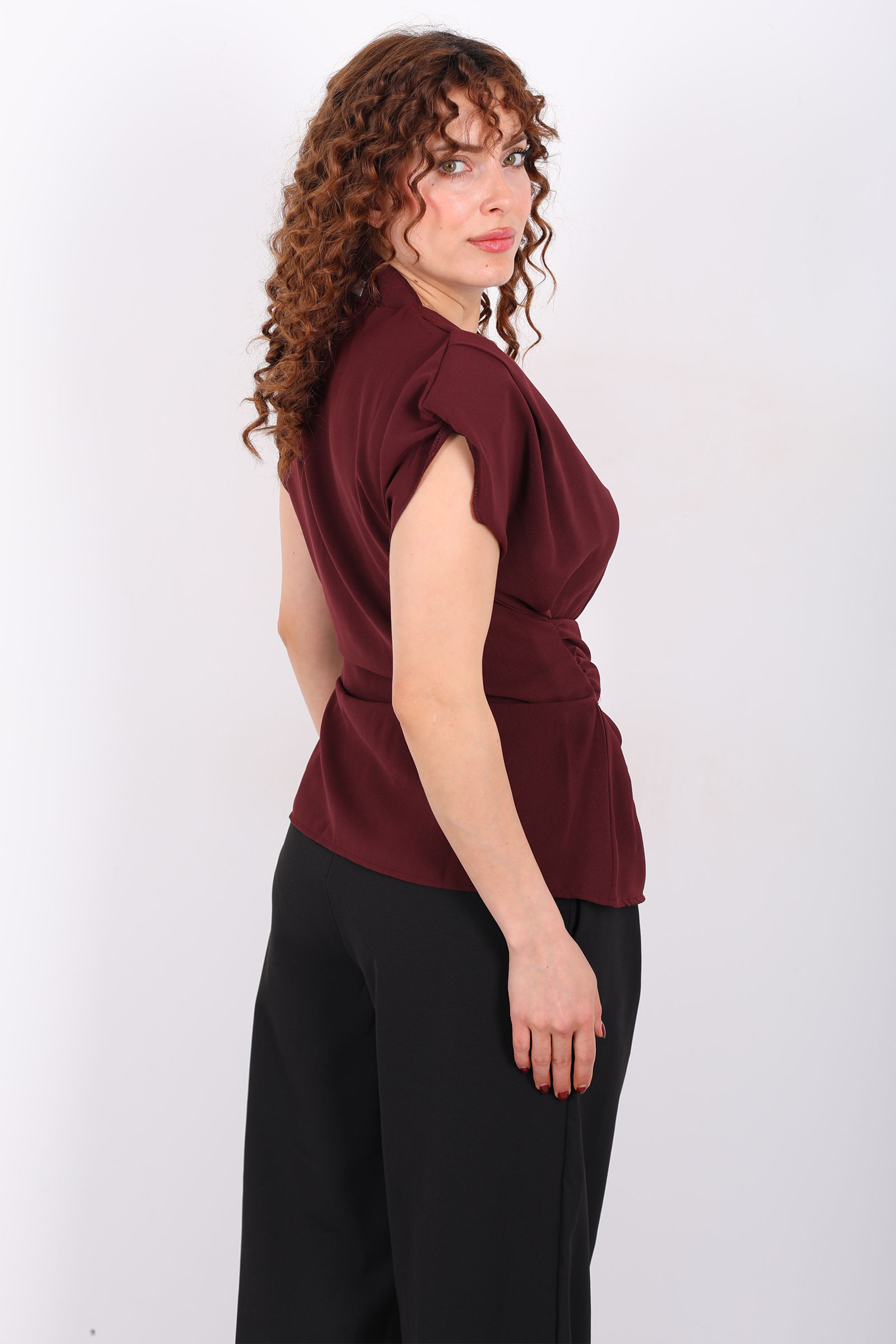 Kruvaze Yaka Yandan Bağlamalı Kadın Mürdüm Vatkalı Bluz
