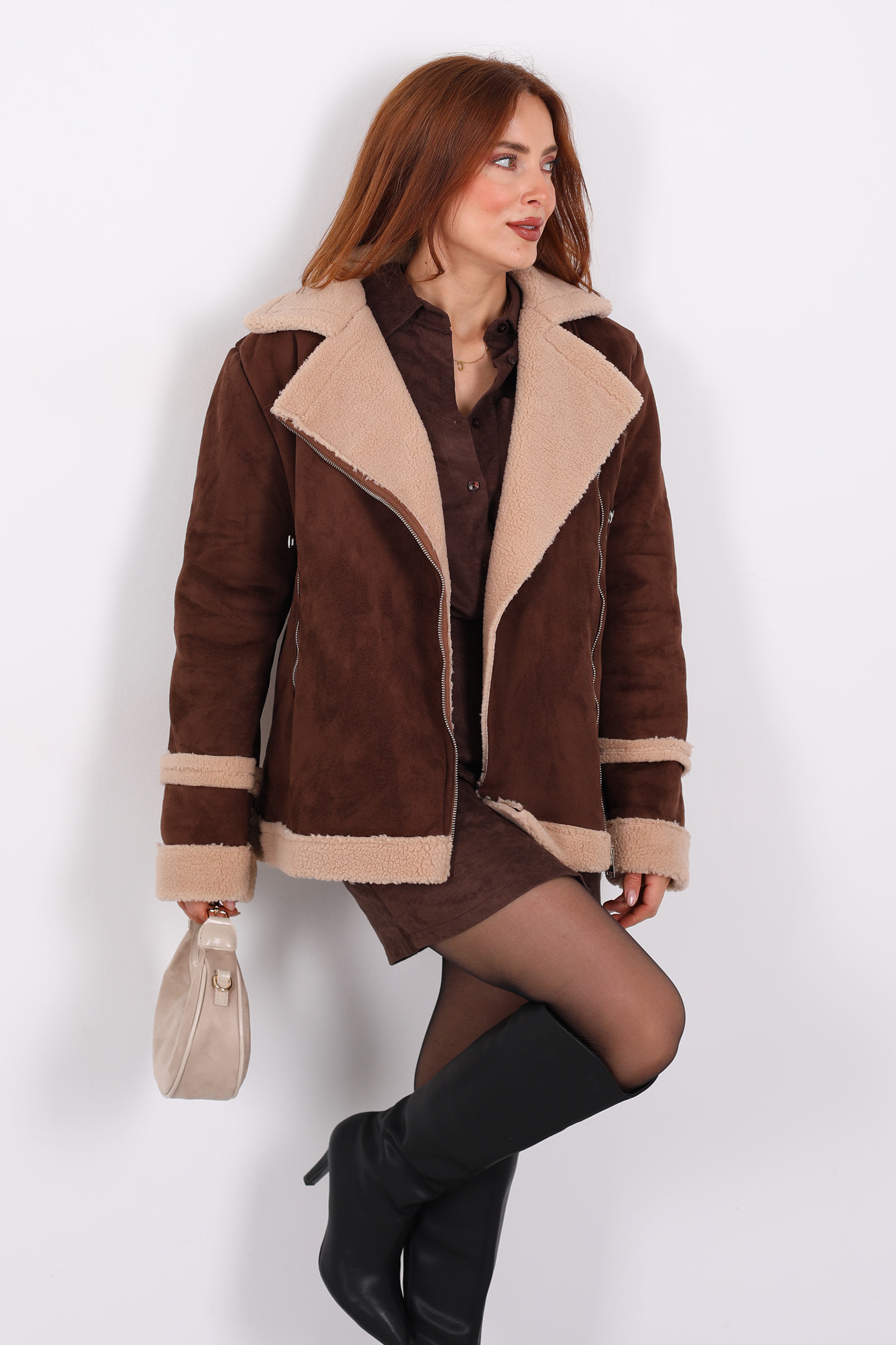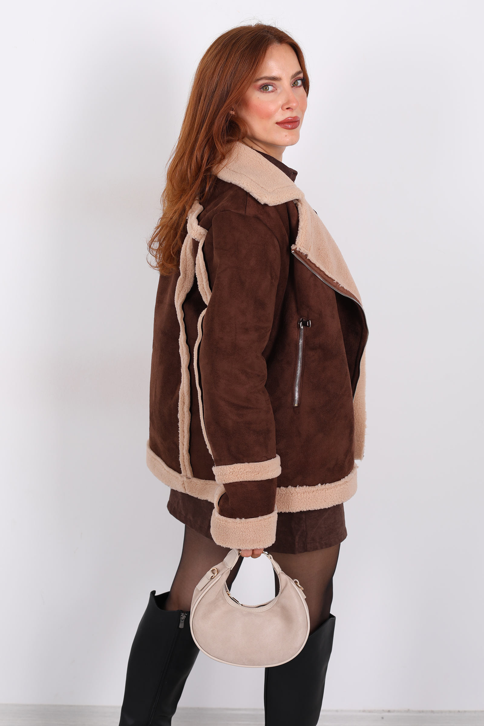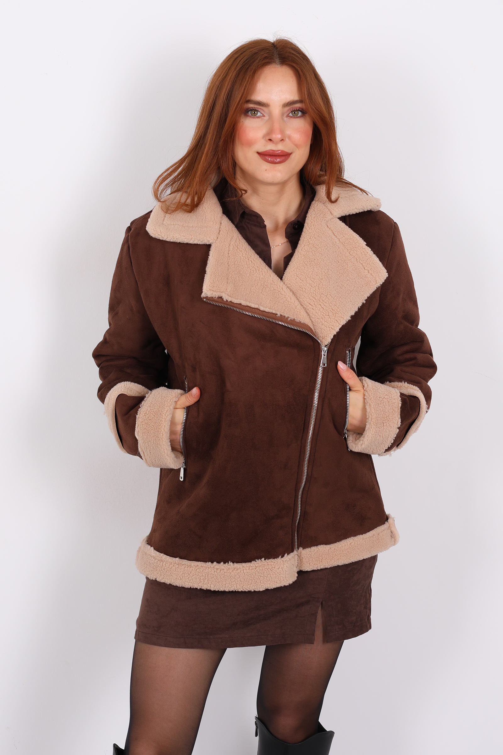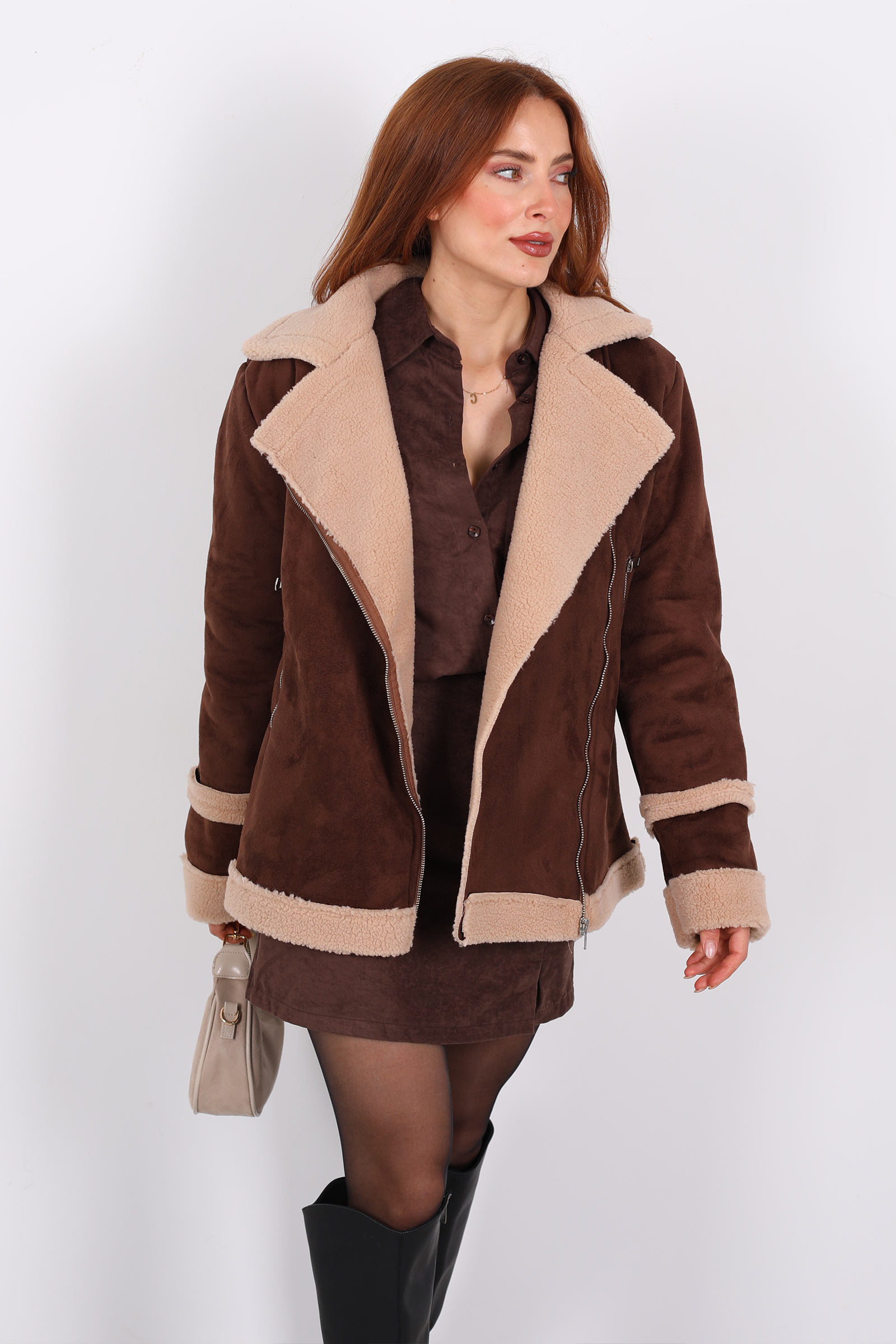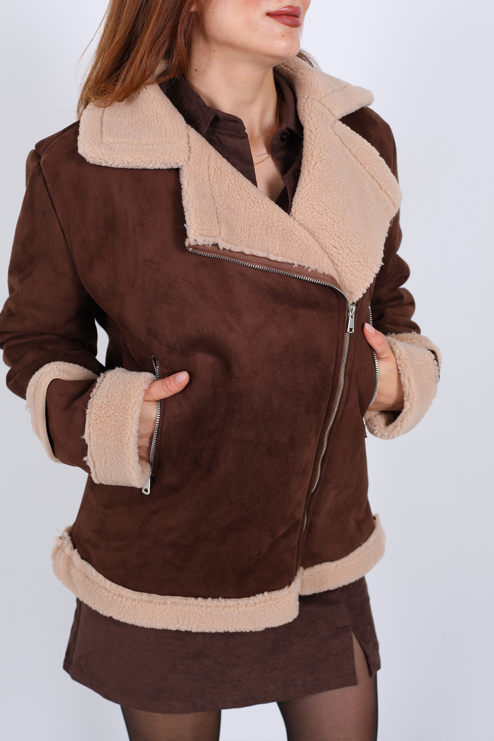 Montun gövdesinde kullanılan süet , hem estetik hem dokunsal olarak lüks bir his verir. Bu tip kumaş, çoğunlukla polyester ya da pamuk karışımı olabilir ve dayanıklı bir yapıya sahiptir. Süet yüzey, ışığı yakalayıp yumuşak bir matlık oluşturur.Kürk biyeli yaka, hem stil hem fonksiyon açısından öne çıkar: Yakanın etrafındaki kürk, soğuk havalarda ek bir koruma sağlar ve montun duruşuna zarafet katar. Fermuar sistemiyle montu kapatmak kolaydır ve görünümü dengeler.