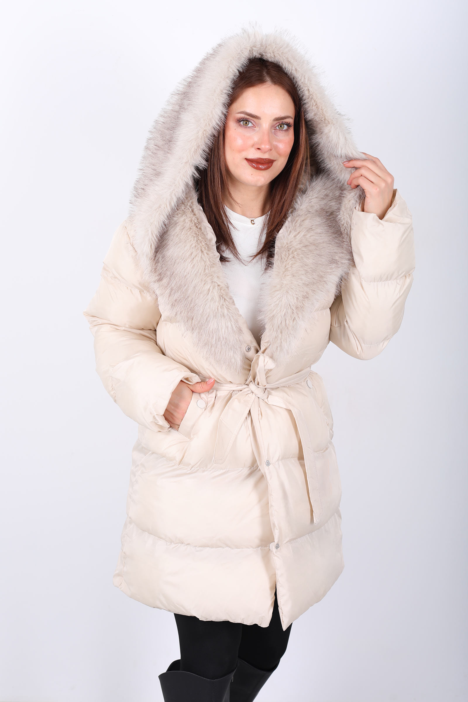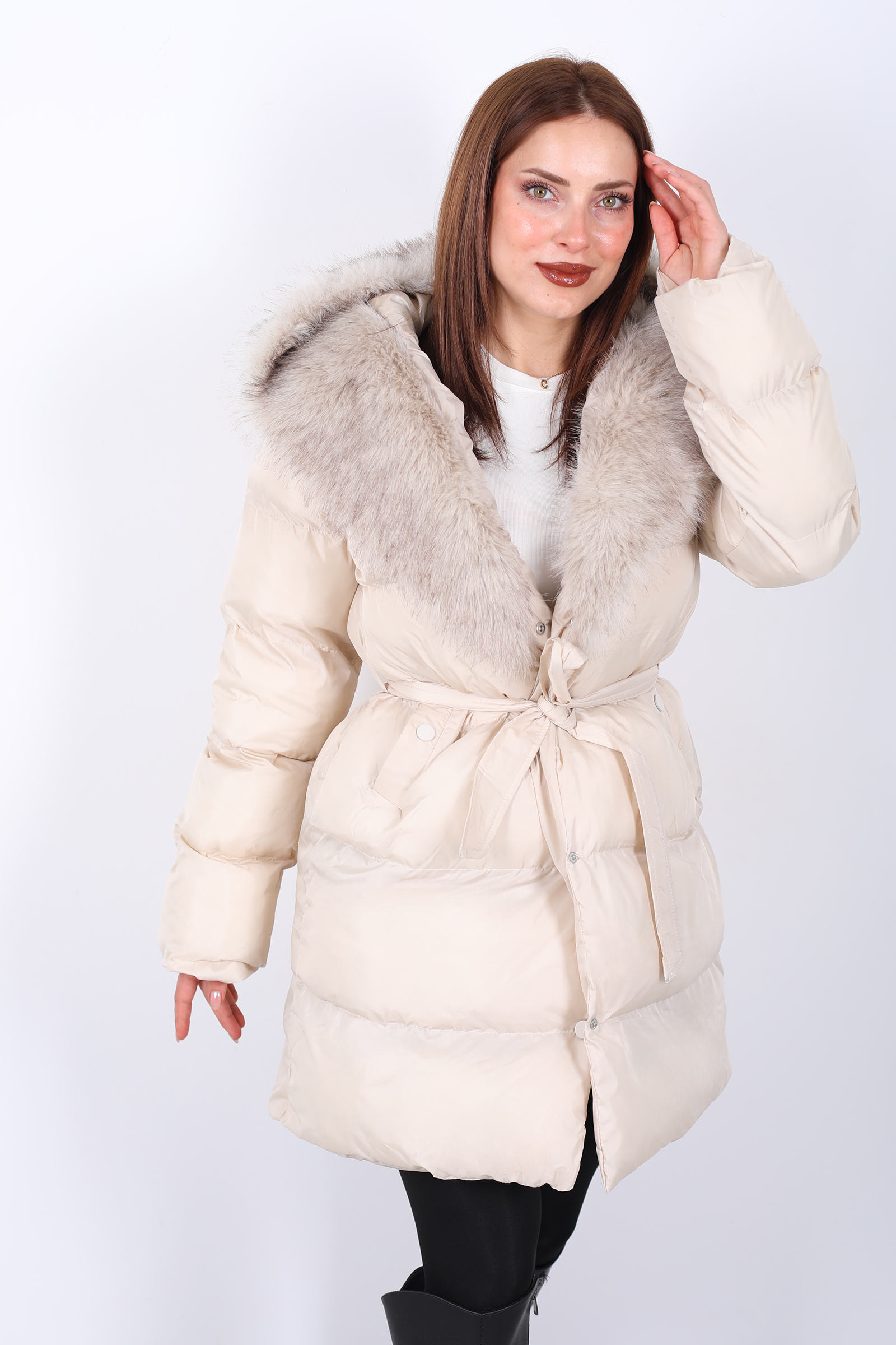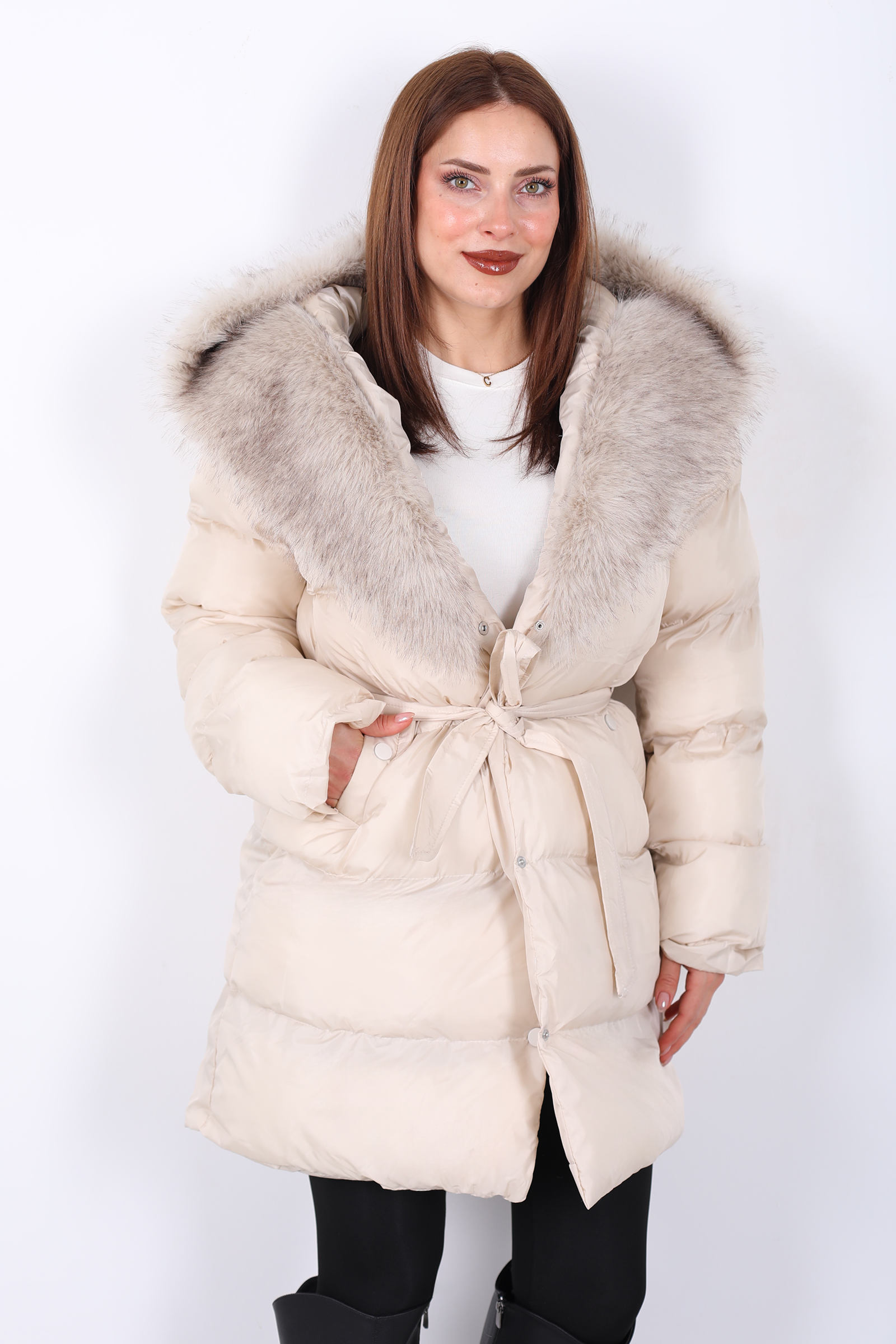 Bu kürk detaylı bağlamalı krem şişme mont, kış günlerinde şıklığı ve sıcaklığı bir arada sunar. Yumuşak kürk detayı, montun yakasına zarif bir dokunuş katarken, bağlamalı beli vurgular ve beden hatlarını inceltir. Hafif şişme yapısı, soğuk havalarda maksimum ısıyı sağlarken, krem tonu her türlü alt giysiyle mükemmel uyum gösterir. Günlük kullanıma uygun olan bu mont, şık bir duruş sergilerken aynı zamanda rahatlık da sunar. Kış aylarında stilinize sofistike bir dokunuş ekler.