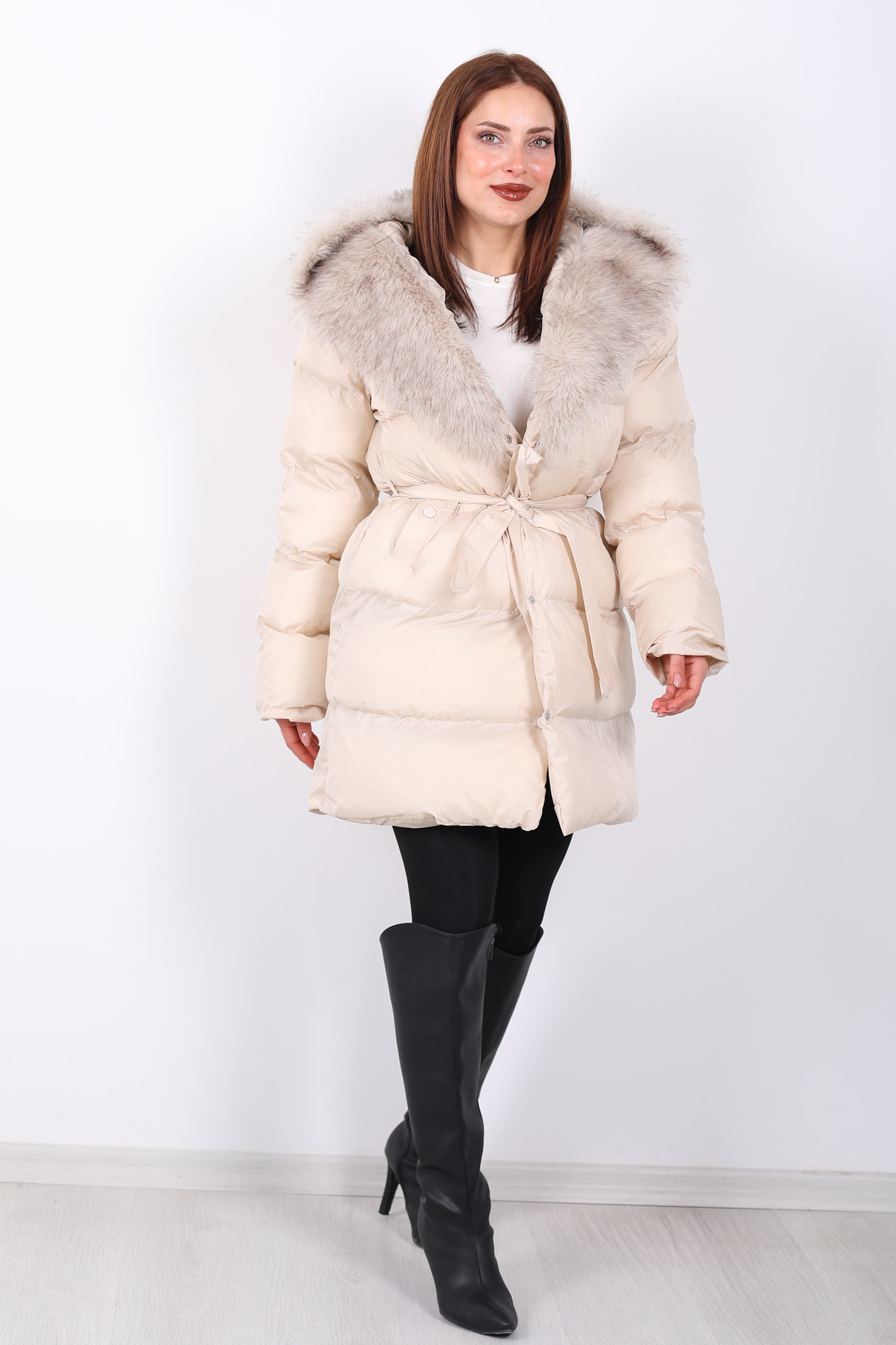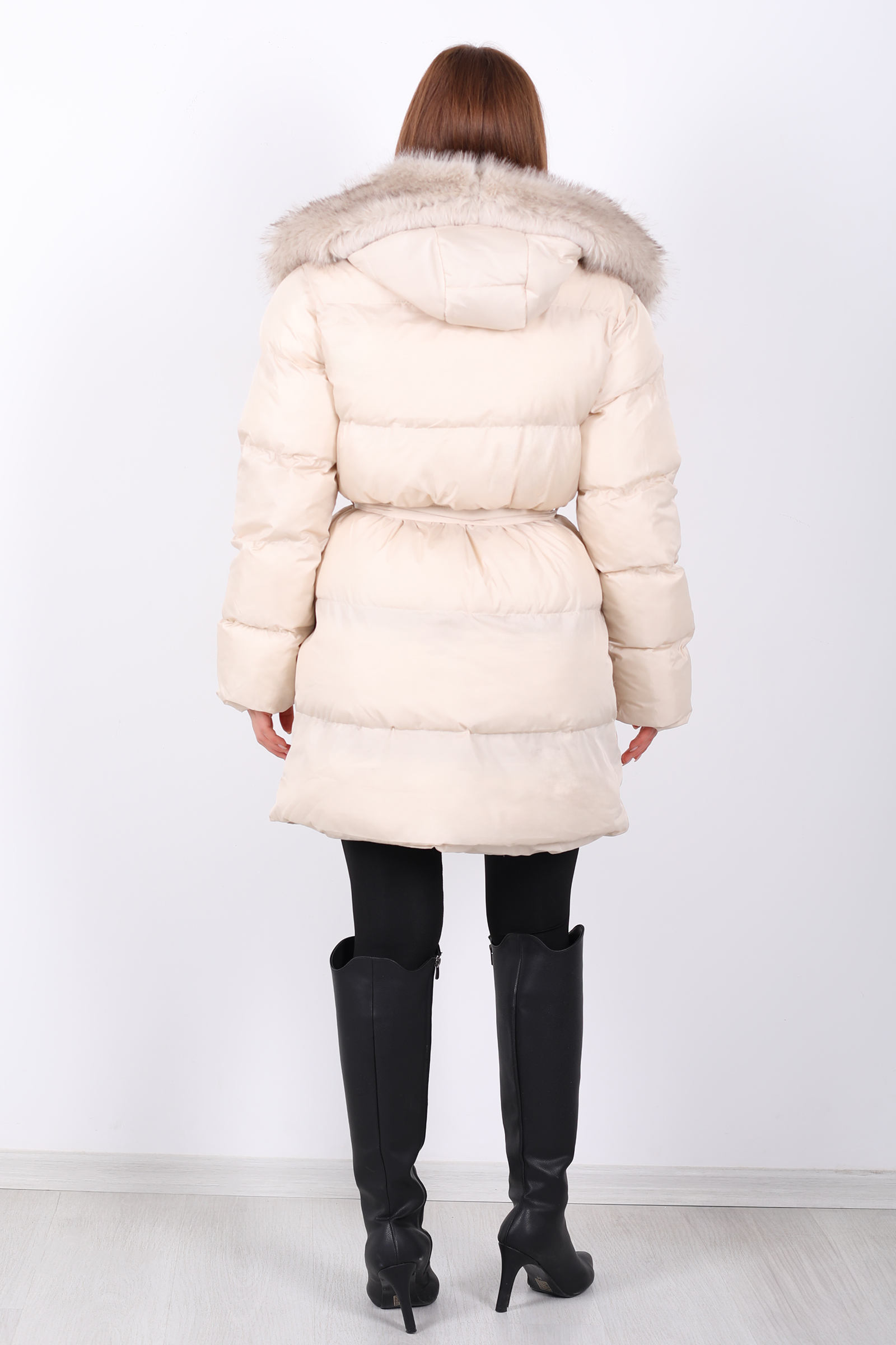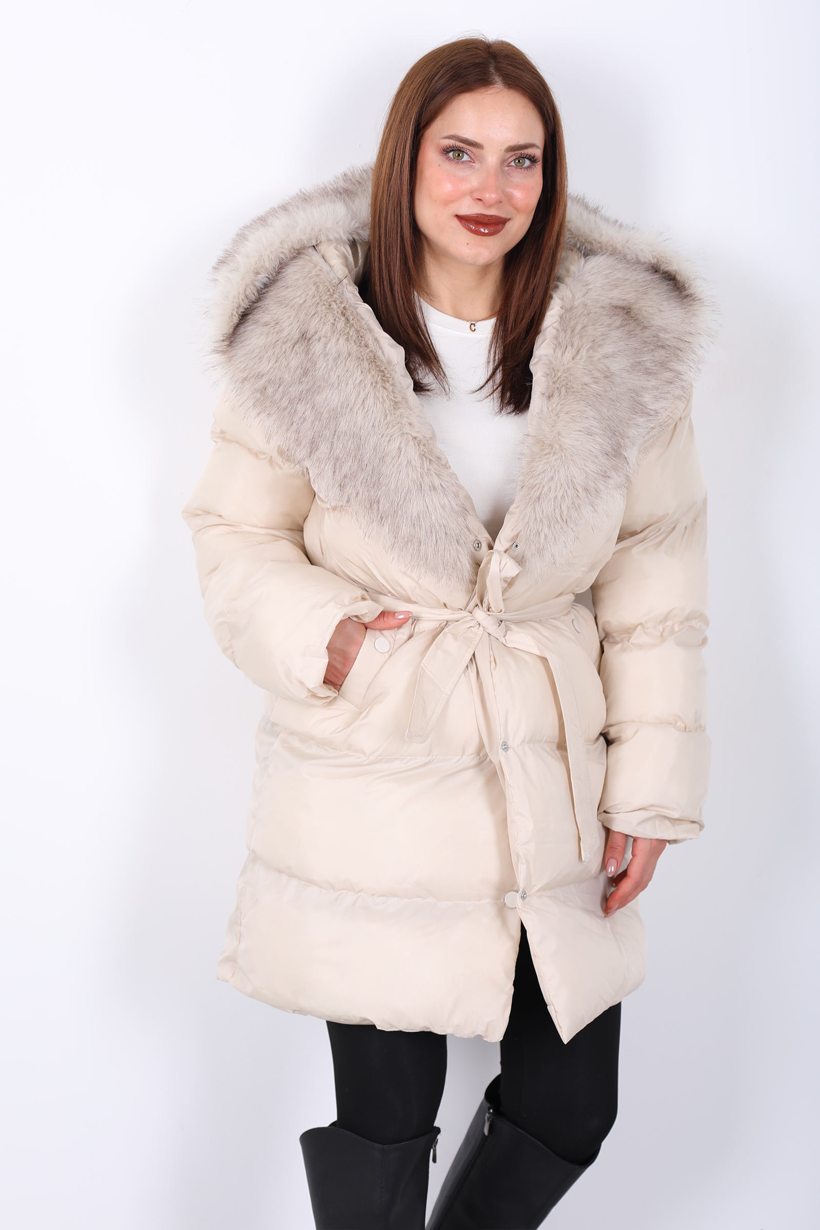 Bu kürk detaylı bağlamalı krem şişme mont, kış günlerinde şıklığı ve sıcaklığı bir arada sunar. Yumuşak kürk detayı, montun yakasına zarif bir dokunuş katarken, bağlamalı beli vurgular ve beden hatlarını inceltir. Hafif şişme yapısı, soğuk havalarda maksimum ısıyı sağlarken, krem tonu her türlü alt giysiyle mükemmel uyum gösterir. Günlük kullanıma uygun olan bu mont, şık bir duruş sergilerken aynı zamanda rahatlık da sunar. Kış aylarında stilinize sofistike bir dokunuş ekler.