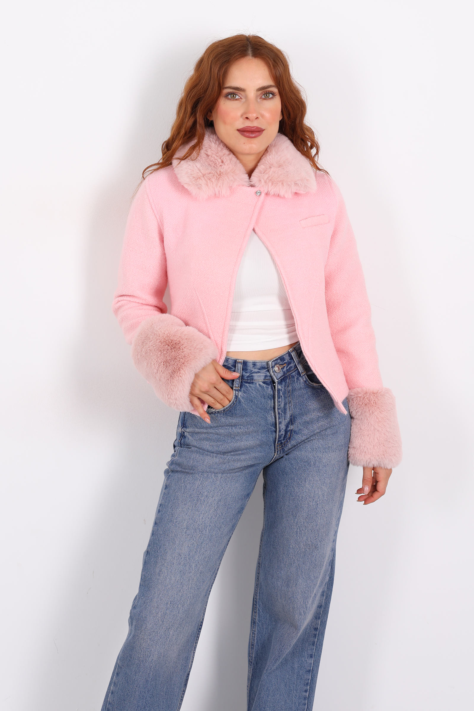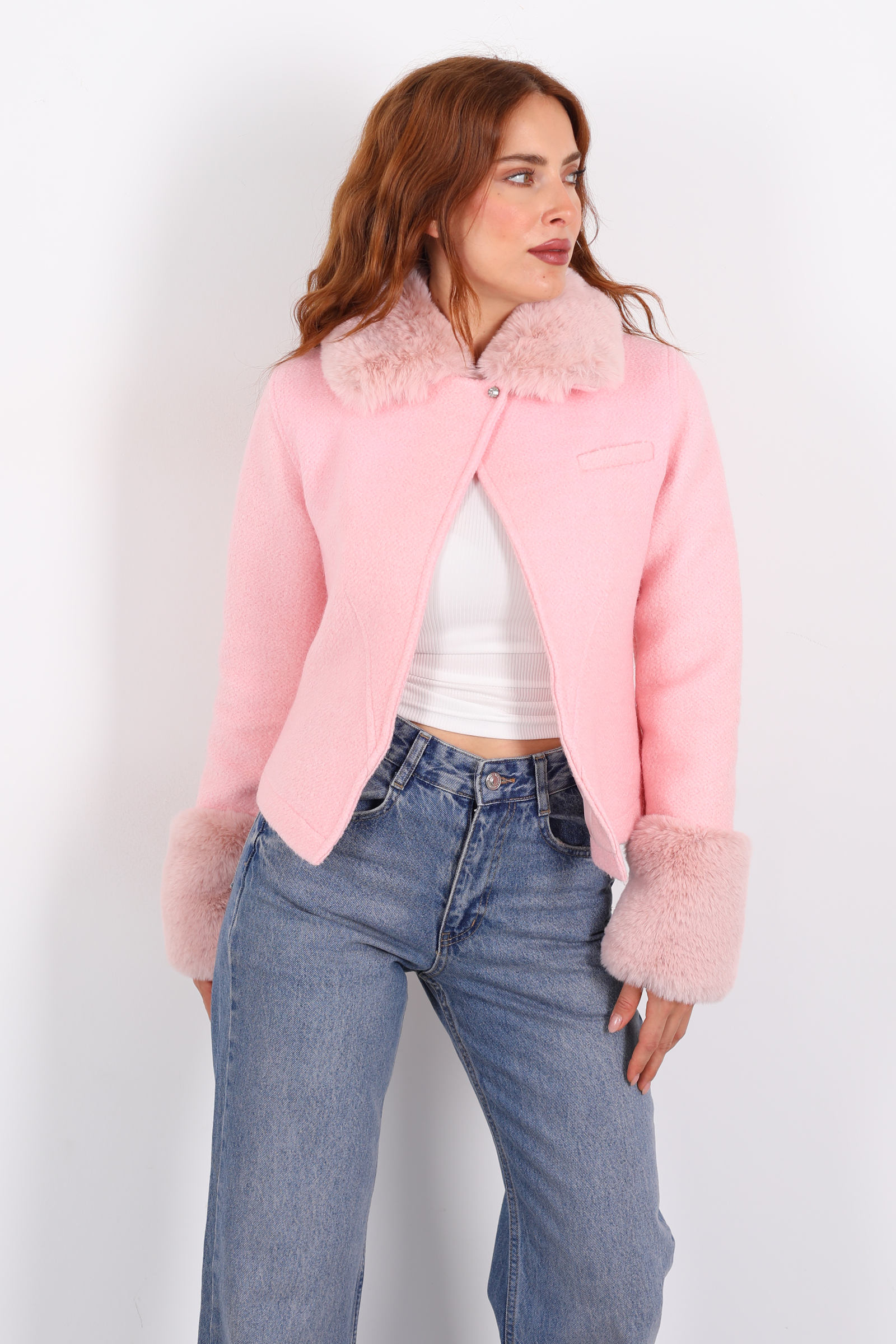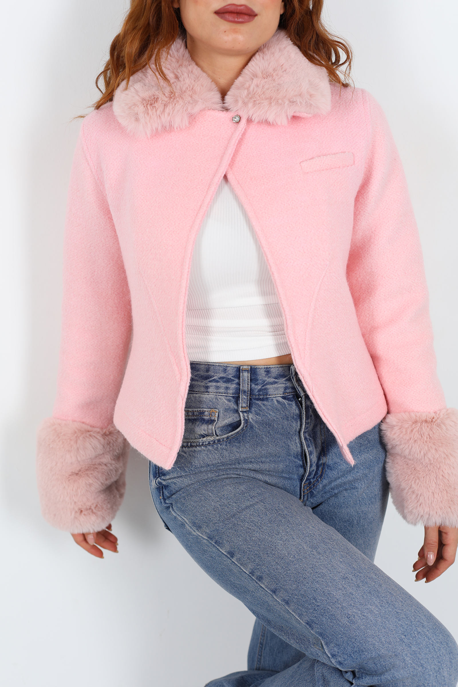 Kadife gibi yumuşak bir dokuyla pembe tonlarının zarafetini sunan bu kürk detaylı kaşe ceket, hem feminen hem de sıcak bir duruş sağlıyor. Kaşe kumaşın sık dokusu, tok yapısıyla soğuk havalarda konfor sunarken kürk yakası cekete lüks ve zarif bir hava katıyor.Bu ceketi, açık renkli dar jean ve krem triko ile kombinleyerek romantik bir hafta sonu stiline dönüştürebilirsiniz. Veya siyah deri pantolon ve zarif botlarla birleştirerek daha dikkat çekici ve iddialı bir görünüm elde edebilirsiniz. Üstüne uzun bir şal ya da fular eklemek, stilinize ekstra bir katman katmanıza yardımcı olur.