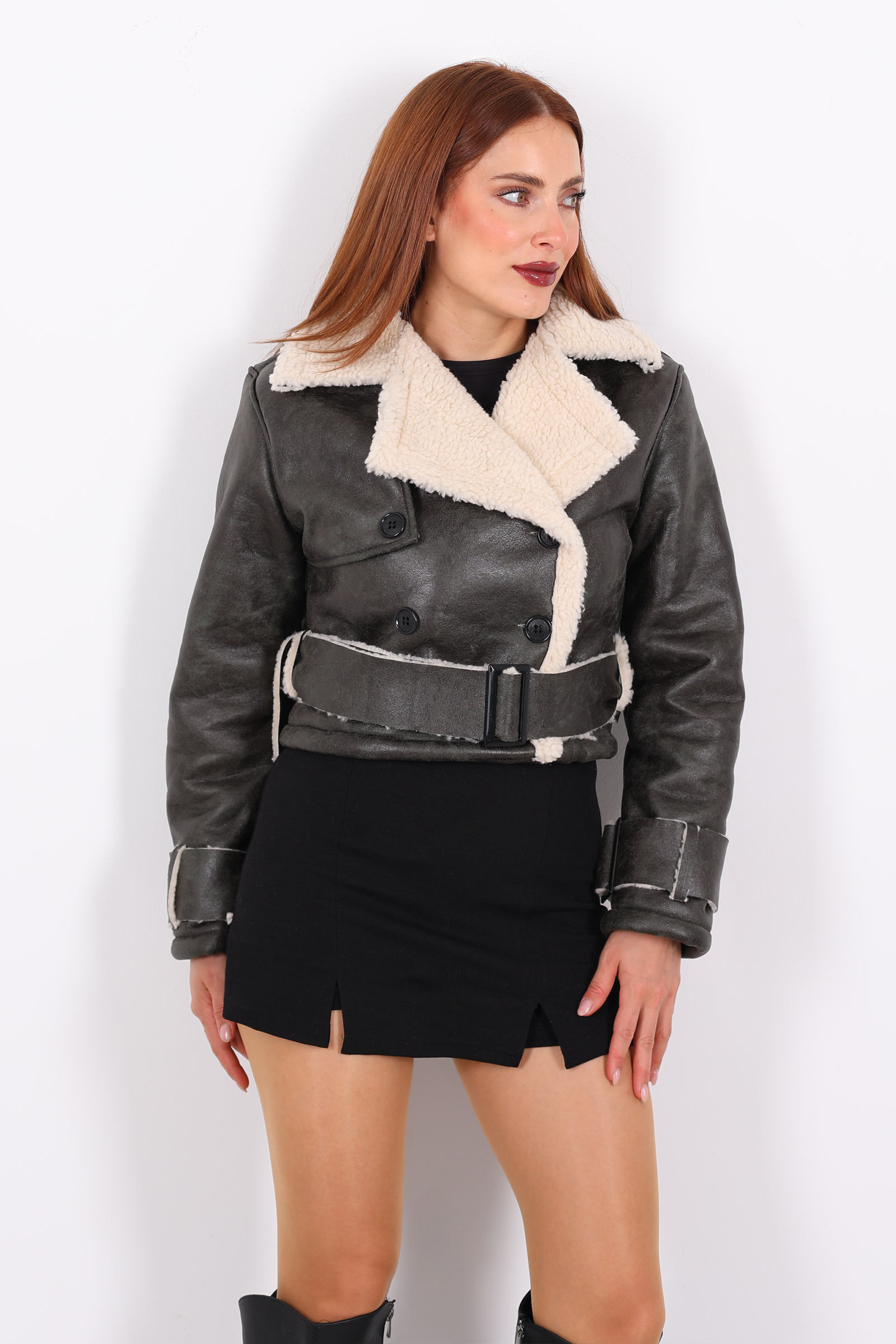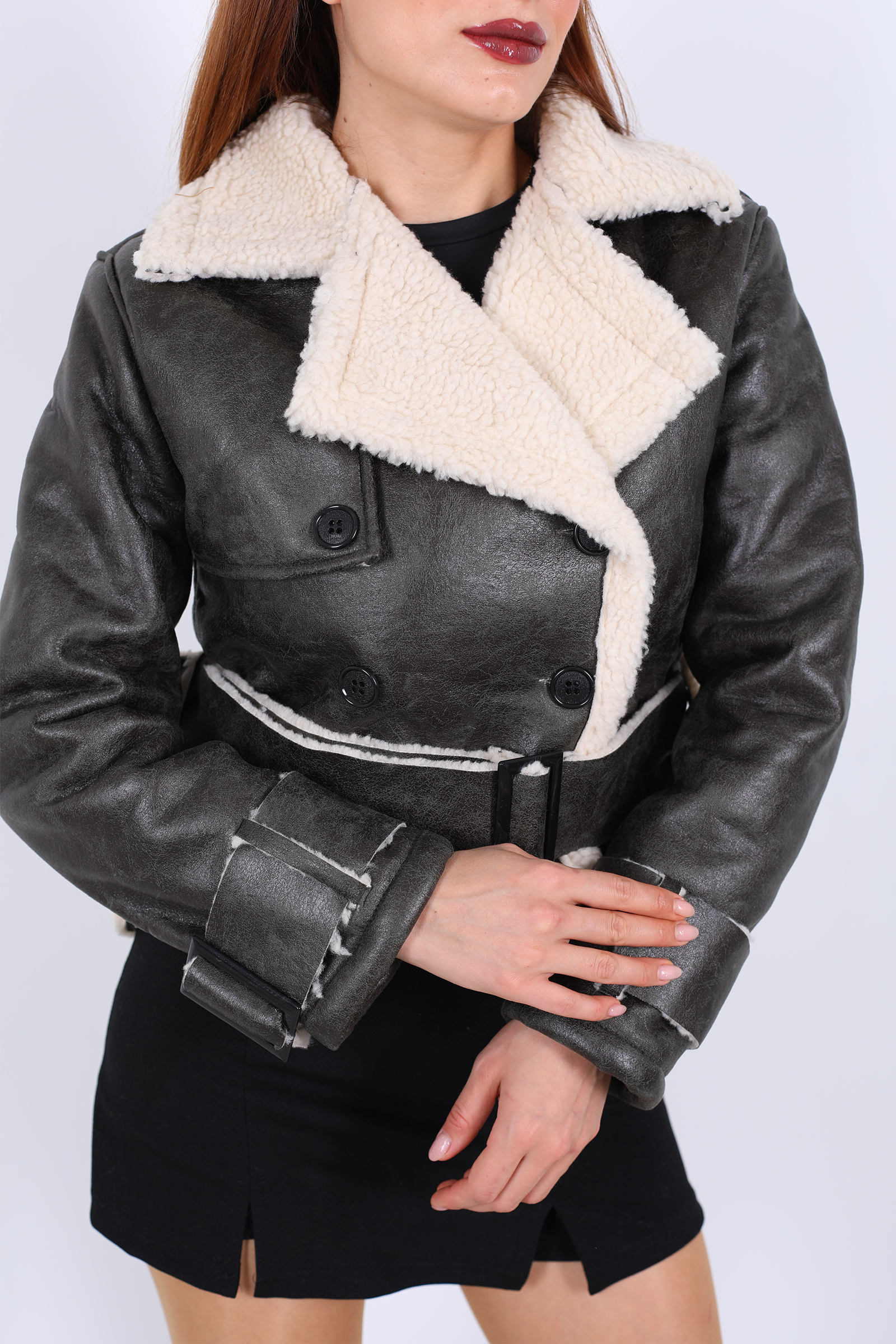 Doğadan ilham alan haki tonuyla tasarlanan bu kısa mont, şehir stiline taze ve özgün bir dokunuş getiriyor. Suni deri ve kürk kombinasyonu, soğuk havalarda hem sıcak hem modern bir görünüm sunuyor. Kemer detayı ise montun hatlarını zarifçe vurguluyor ve stilinize sportif bir şıklık katıyor.Beldeki kemer detayı, montun formunu şekillendirirken aynı zamanda isteğe göre sıkılıp gevşetilerek kişiselleştirilebilir bir kullanım sunuyor. Kemer tokası, montun stilini tamamlayan şık bir detay olarak öne çıkıyor. Omuz ve kol dikiş detayları, montun modern ve sportif çizgisine hareket katıyor.
