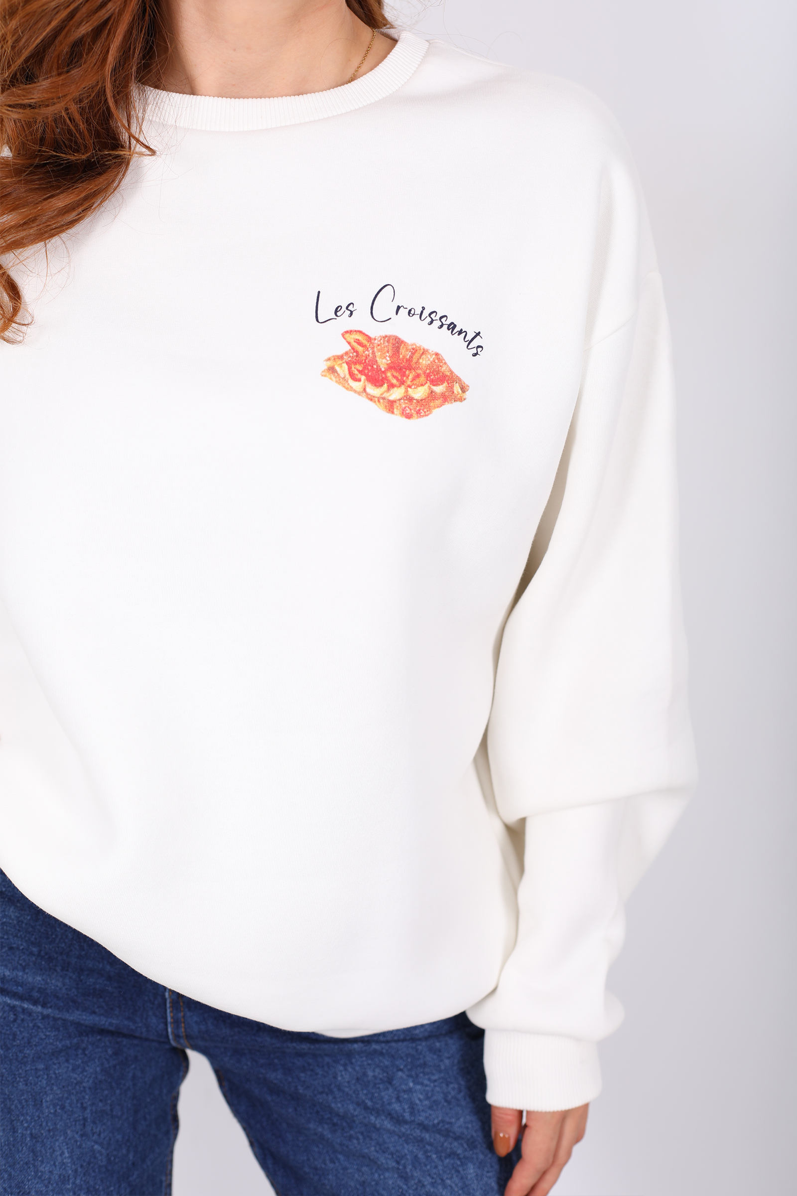 Kruvasan Baskılı Oversize Kadın Ekru Sweat