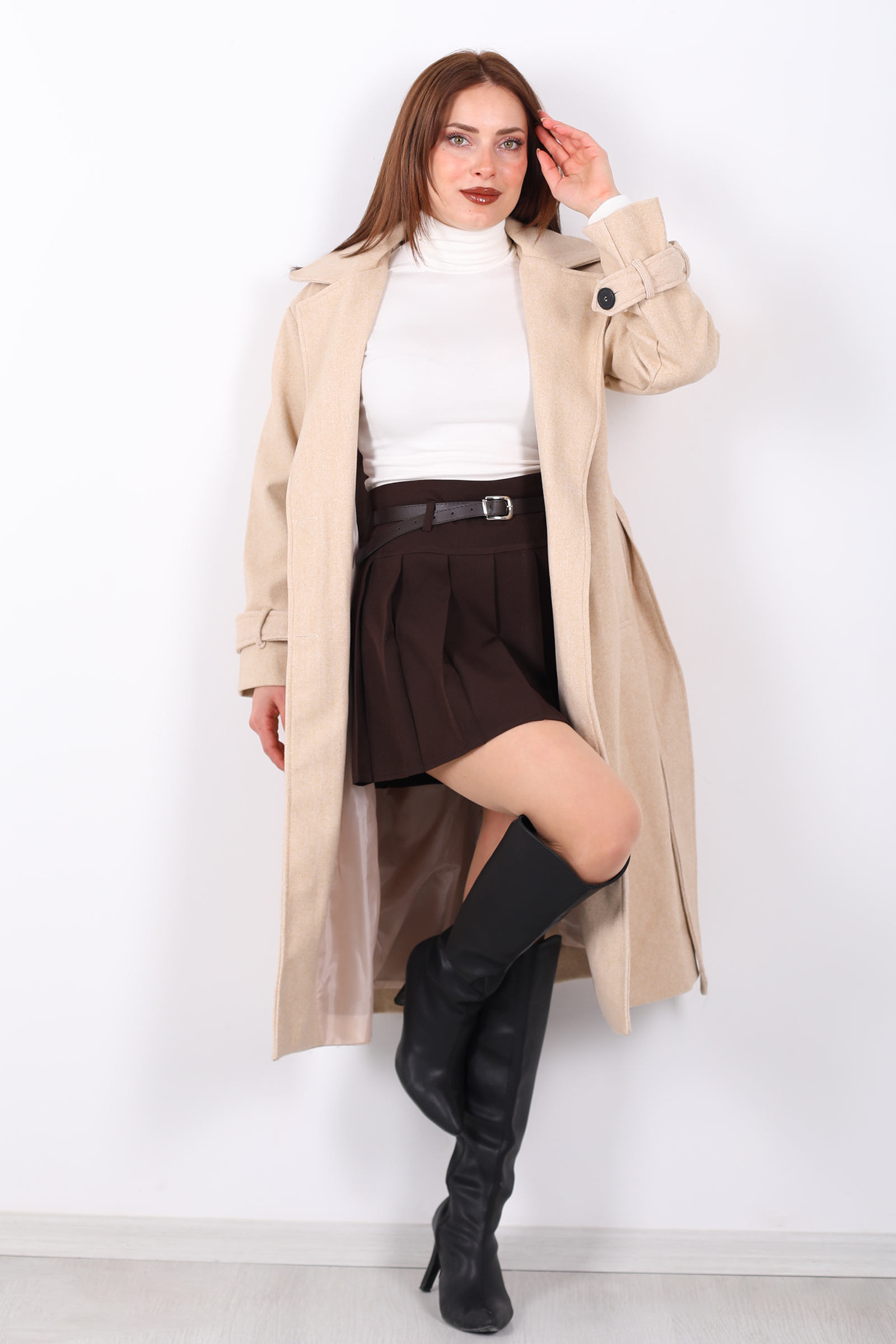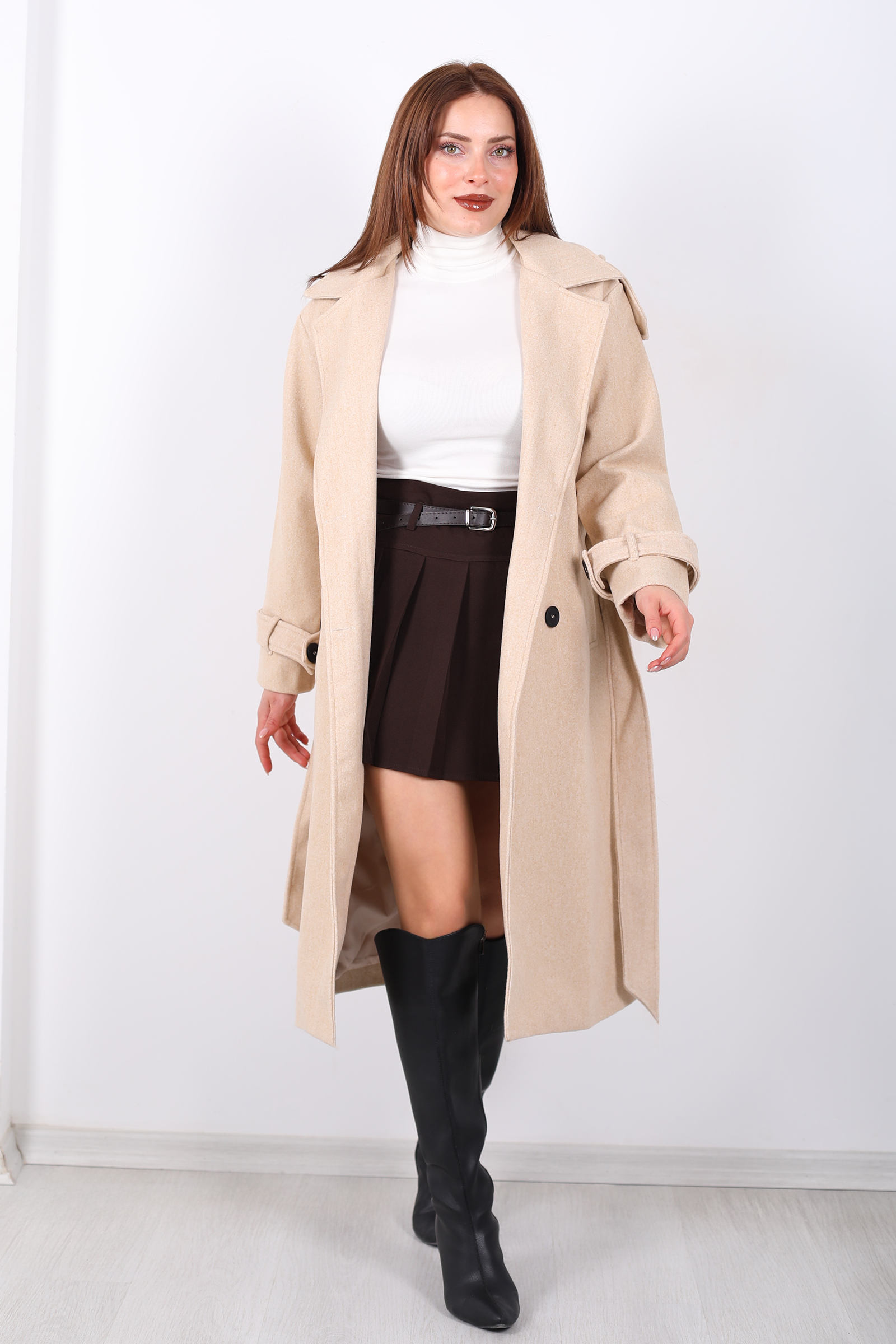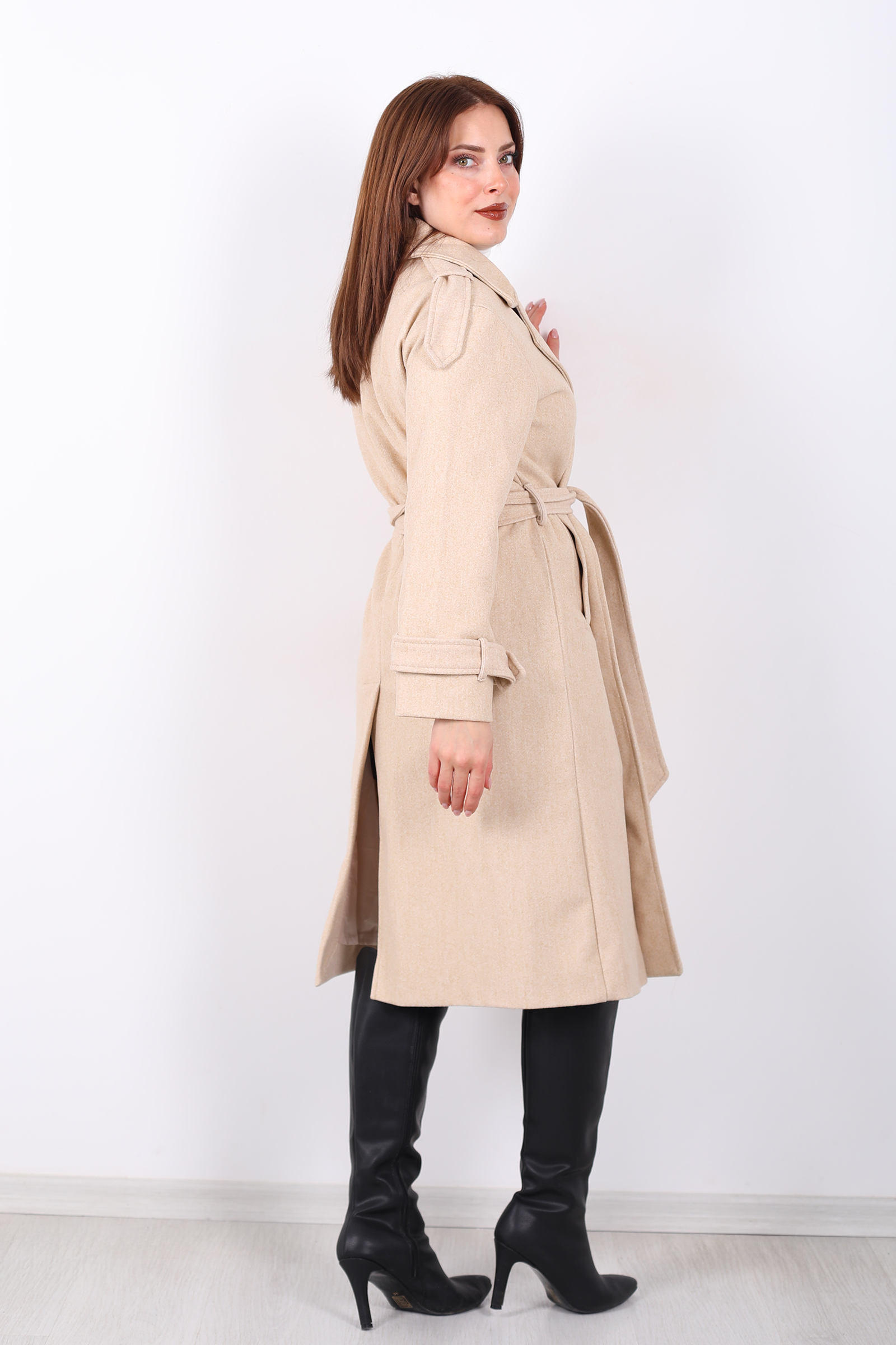 Krem rengiyle zarif ve şık bir görünüm elde edin! Kuşaqlı düğme detaylı kadın kase kaban, soğuk havalarda stilinizi ön plana çıkarırken, rahatlık sunar. Kabanın kuşağı, belinizi ince gösterirken, düğme detayları ona modern bir hava katar. Kaliteli kumaşı ve vücuda oturan kesimi ile kış aylarında sıcak tutarken, şıklığınızdan ödün vermezsiniz. Hem günlük kullanımda hem de özel etkinliklerde rahatça kombinlenebilecek bu kaban, zarif ve sofistike bir dokunuş sağlar.