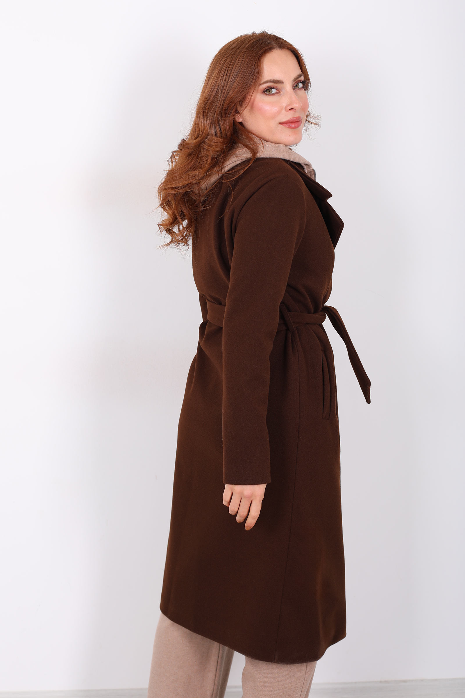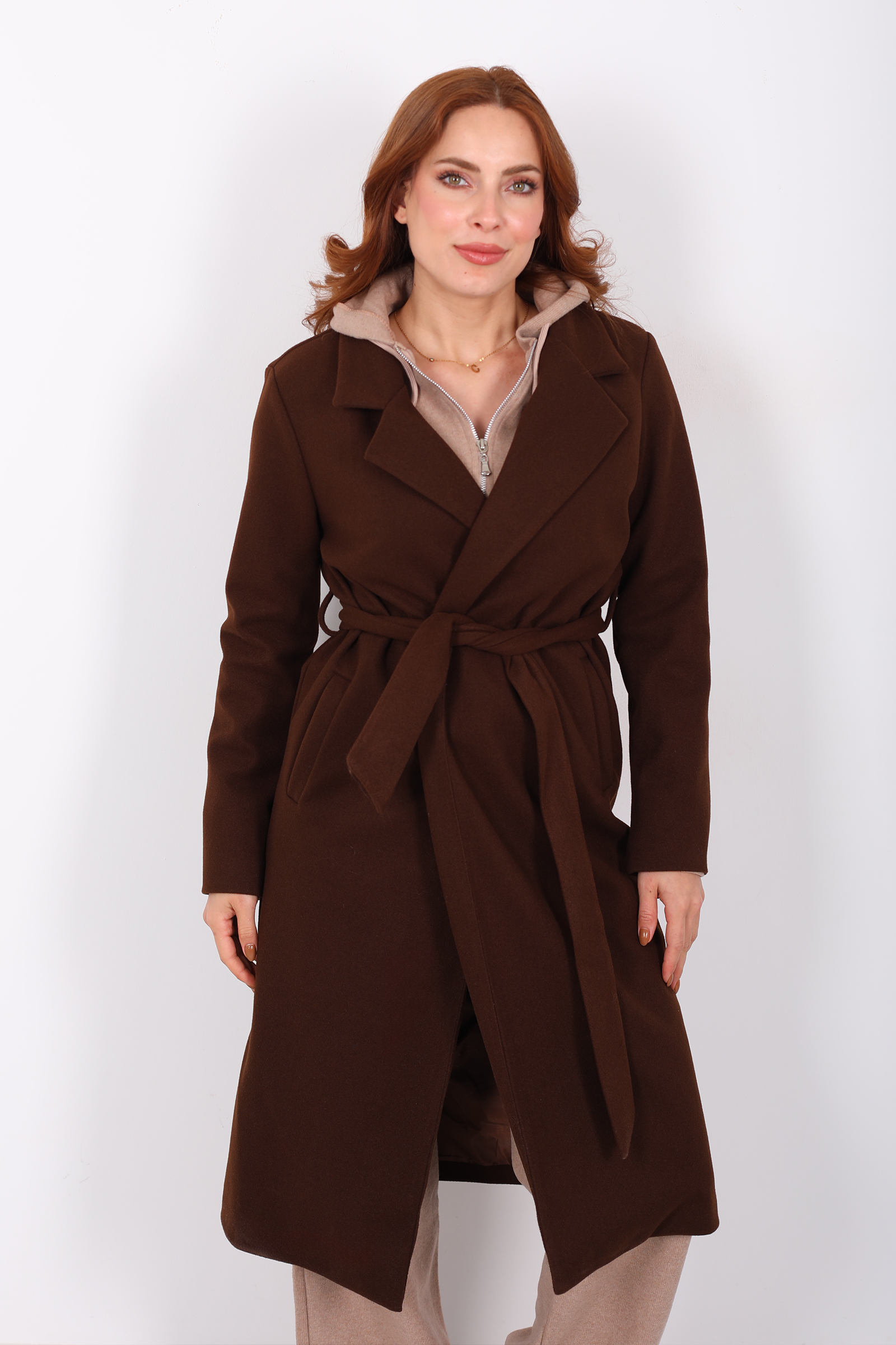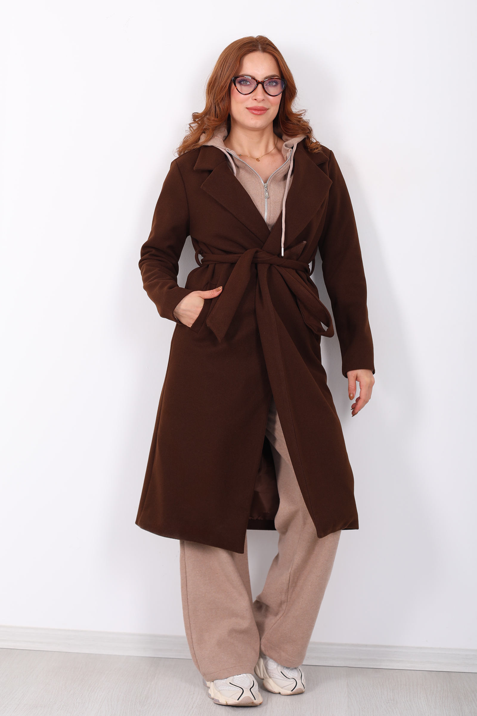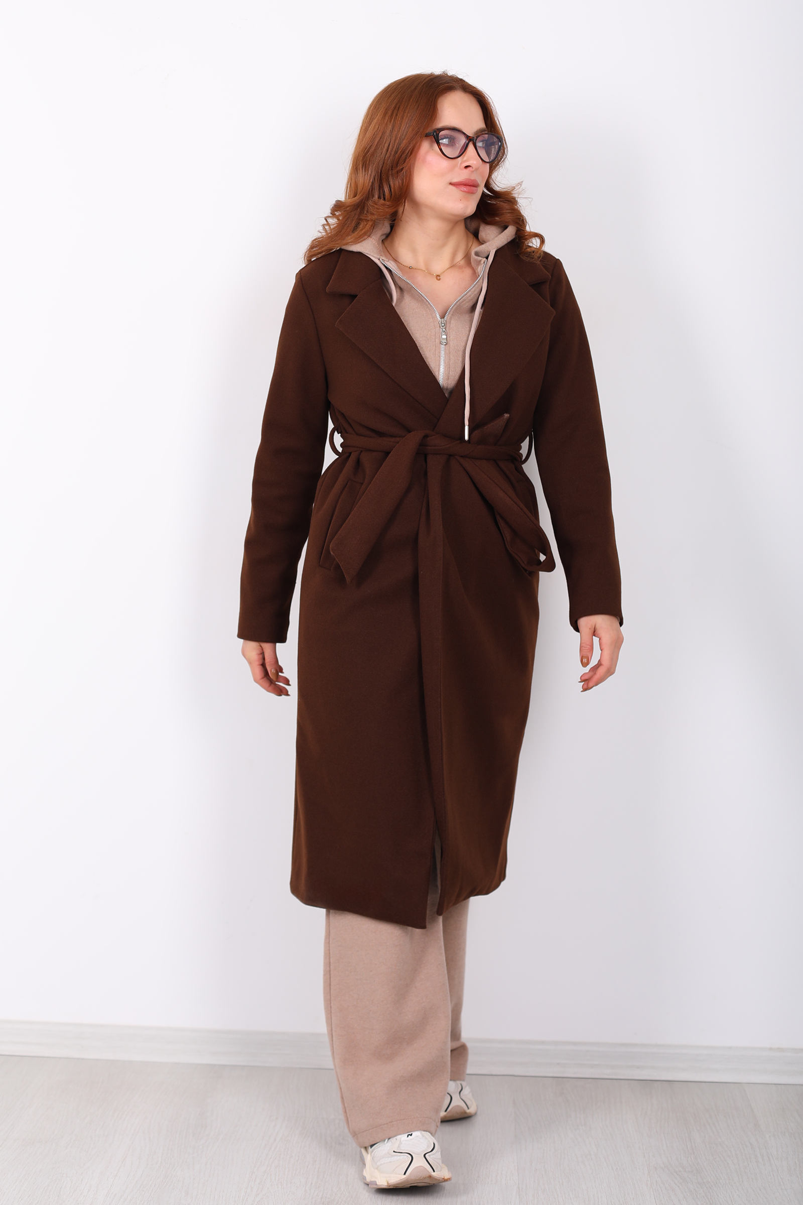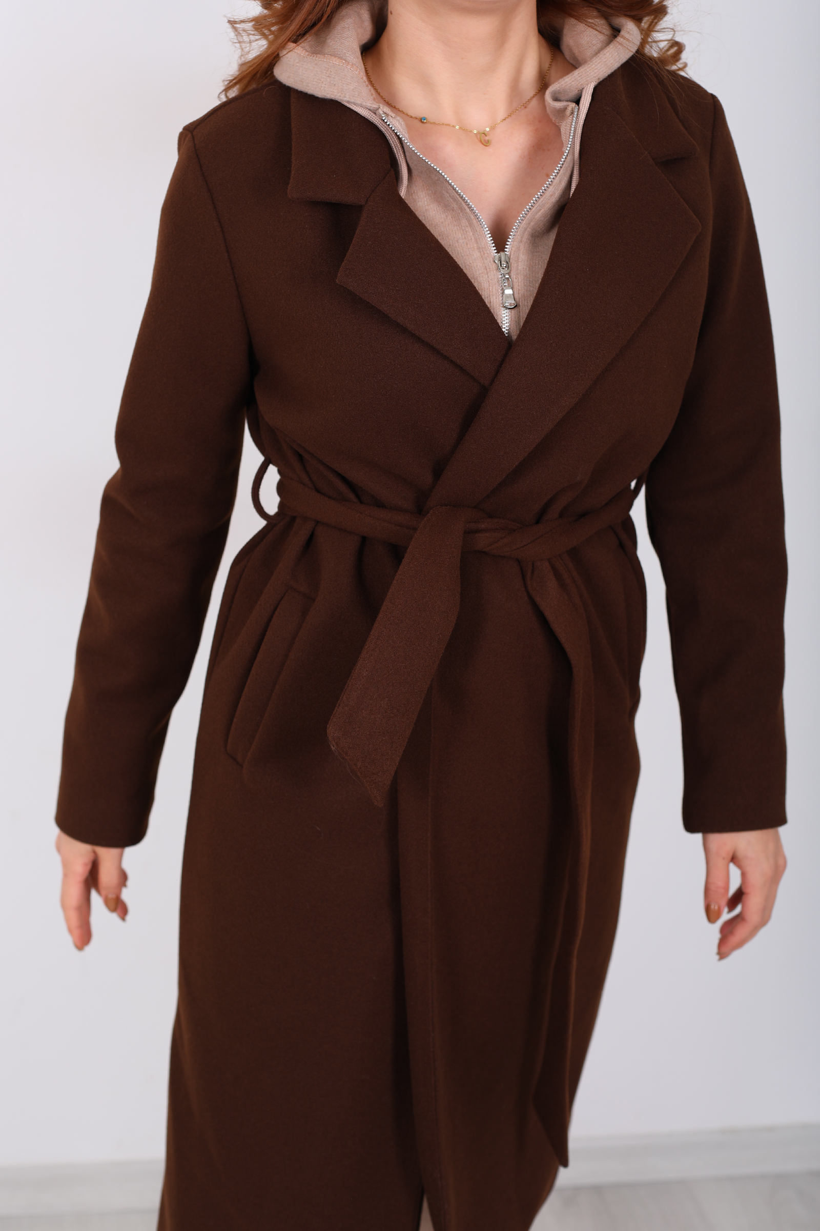 Kuşaklı Kaşe Kahverengi Kadın Kaban
