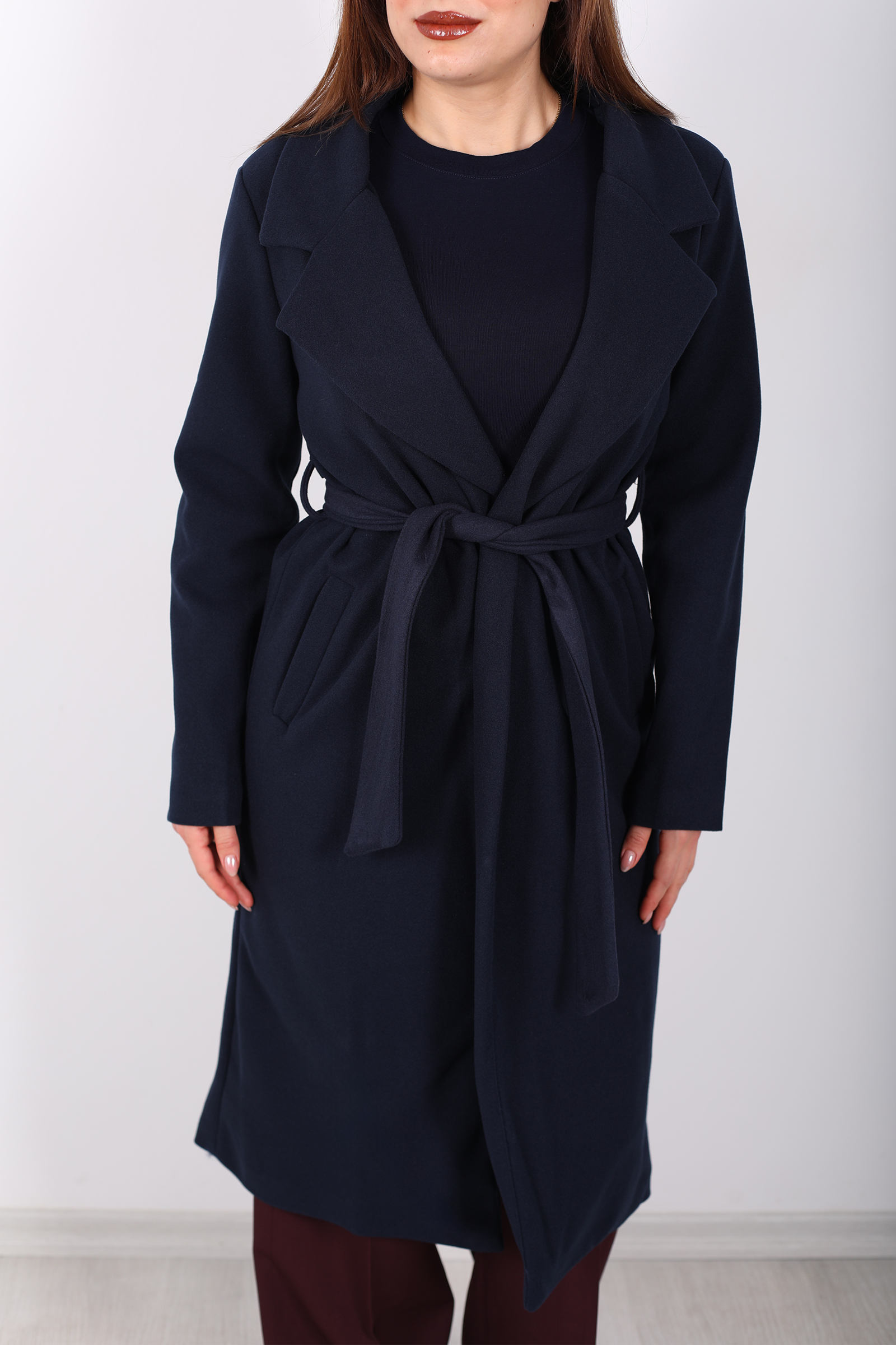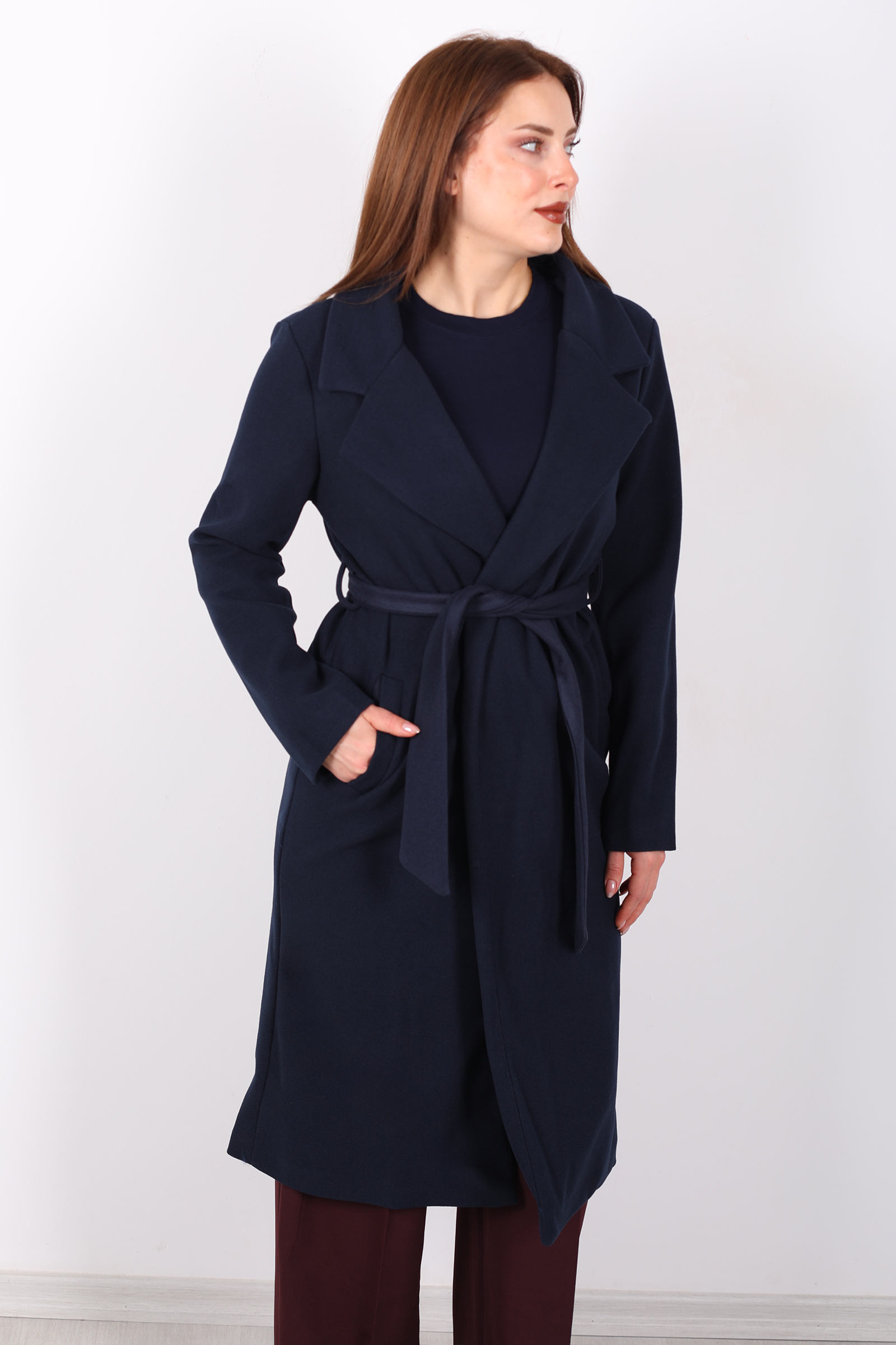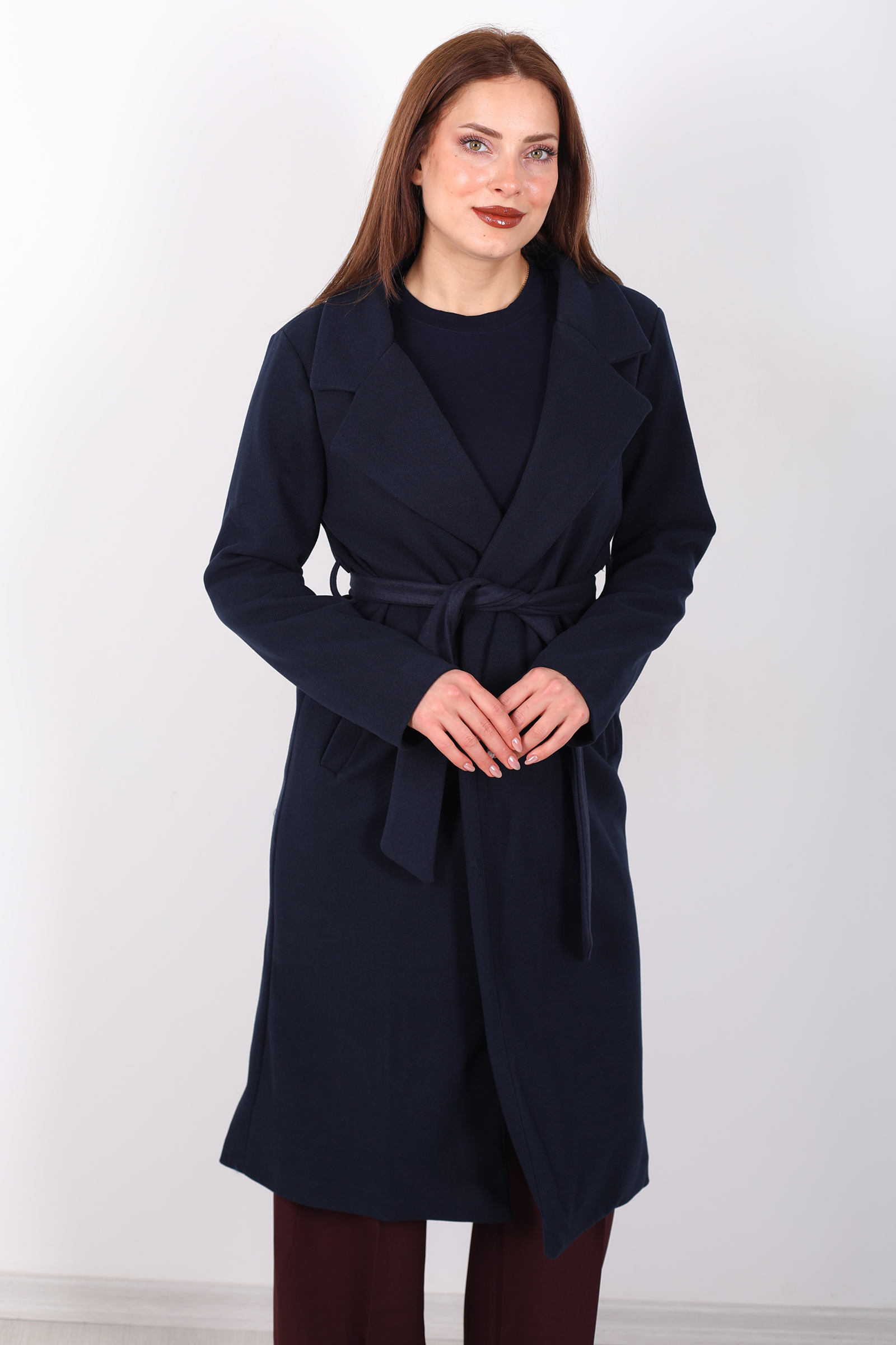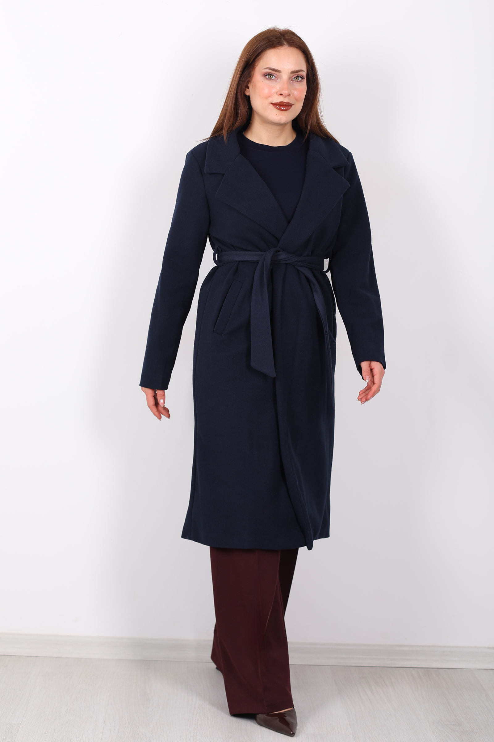 Lacivertin zarif tonlarıyla şıklığınızı yansıtın! Kuşaklı kase kesim lacivert kadın kaban, modern tasarımı ve bel kısmındaki kuşak detayı ile zarif bir siluet sunar. Soğuk havalarda sizi sıcak tutacak kaliteli kumaşı, şıklığınızı korurken rahatlık da sağlar. Hem günlük kullanımda hem de özel davetlerde rahatlıkla tercih edebileceğiniz bu kaban, zarif ve sofistike bir kış parçasıdır. Lacivert rengi, her kombine uyum sağlayarak stilinize modern bir dokunuş ekler.