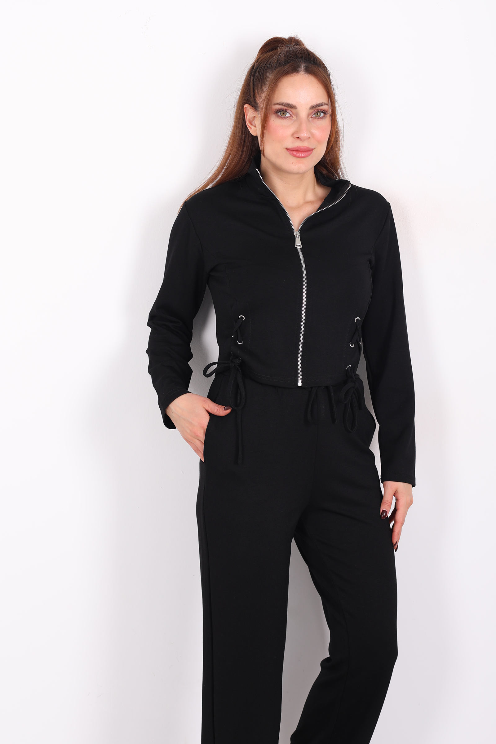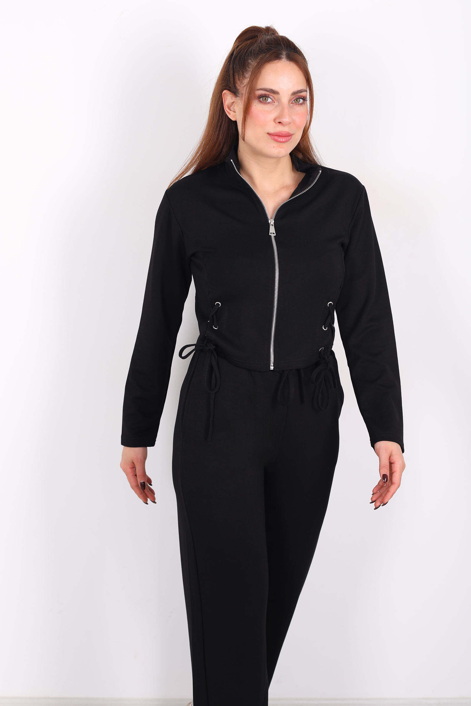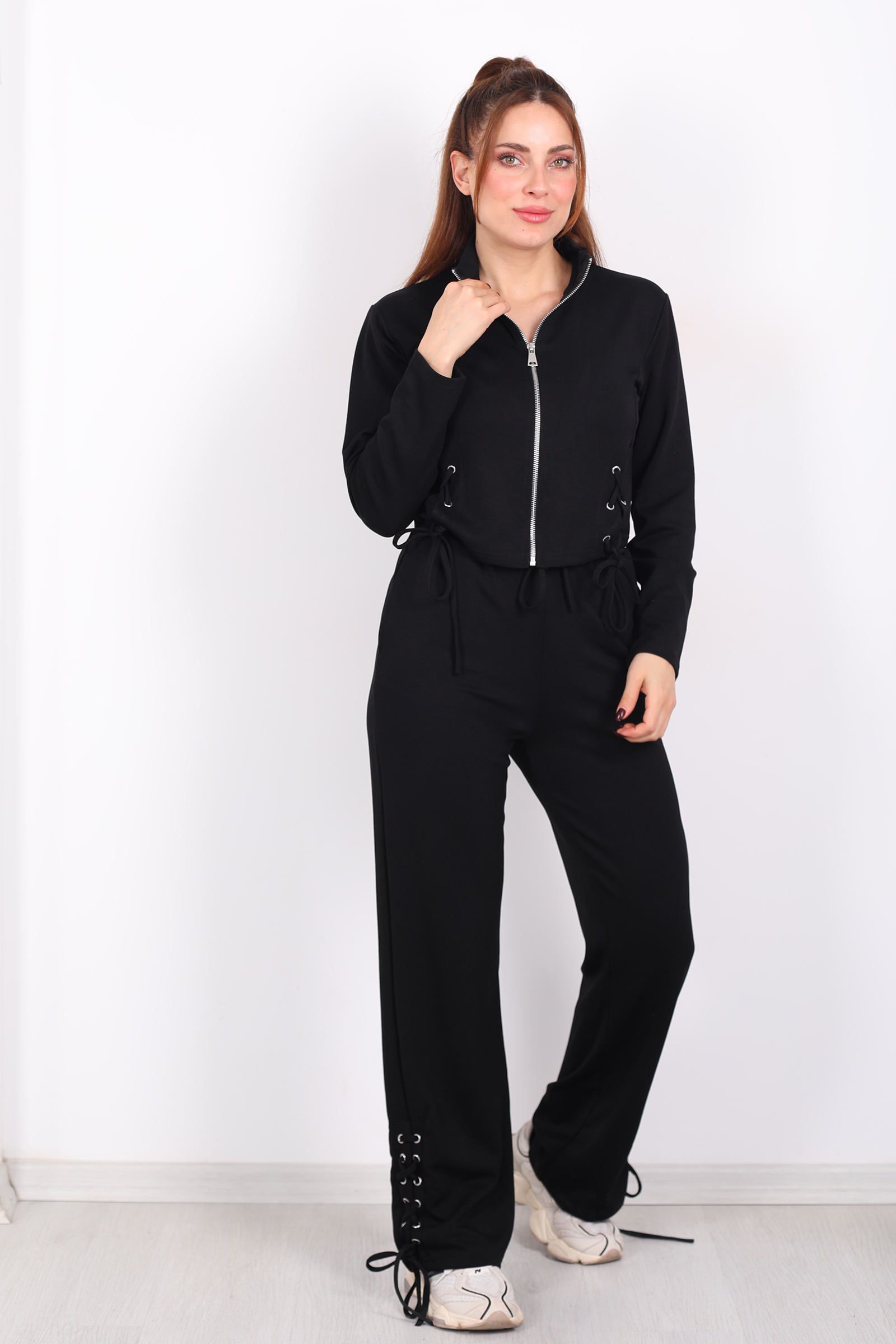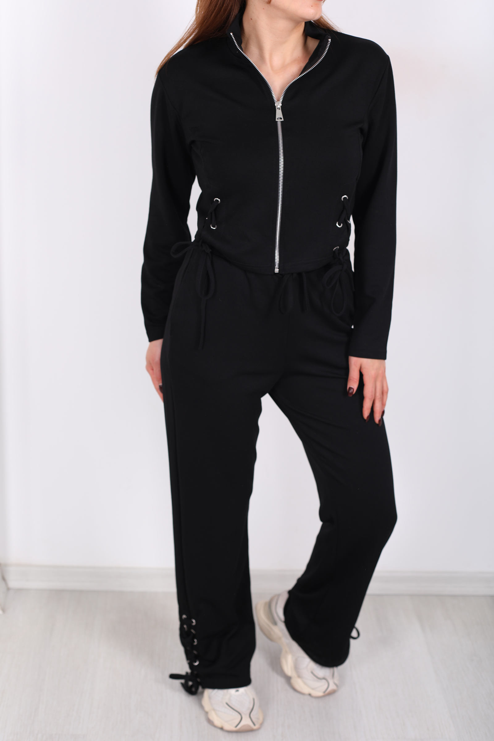 Rahatlık ve modern şıklığı bir arada sunan kuşgözü bağcıklı siyah kadın modal takım, günlük stilinde konforundan ödün vermek istemeyenler için ideal bir seçenektir. Yumuşak dokulu modal kumaşı sayesinde cilde nazik bir his verirken, nefes alabilen yapısıyla gün boyu rahat kullanım sağlar. Üst parçada yer alan kuşgözü ve bağcık detayları tasarıma dinamik bir hava katarken, sade siyah rengi zamansız bir şıklık sunar. Günlük kullanımda sneaker’larla spor bir görünüm elde edebilir, aksesuarlarla kombinleyerek daha şehirli bir stil yaratabilirsin. Ev giyimi ve dış giyim için çok yönlü olarak tercih edilebilir.