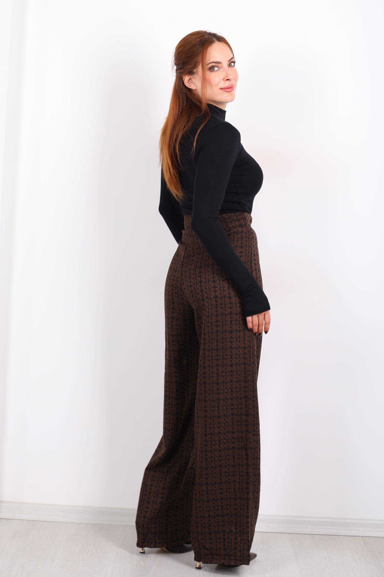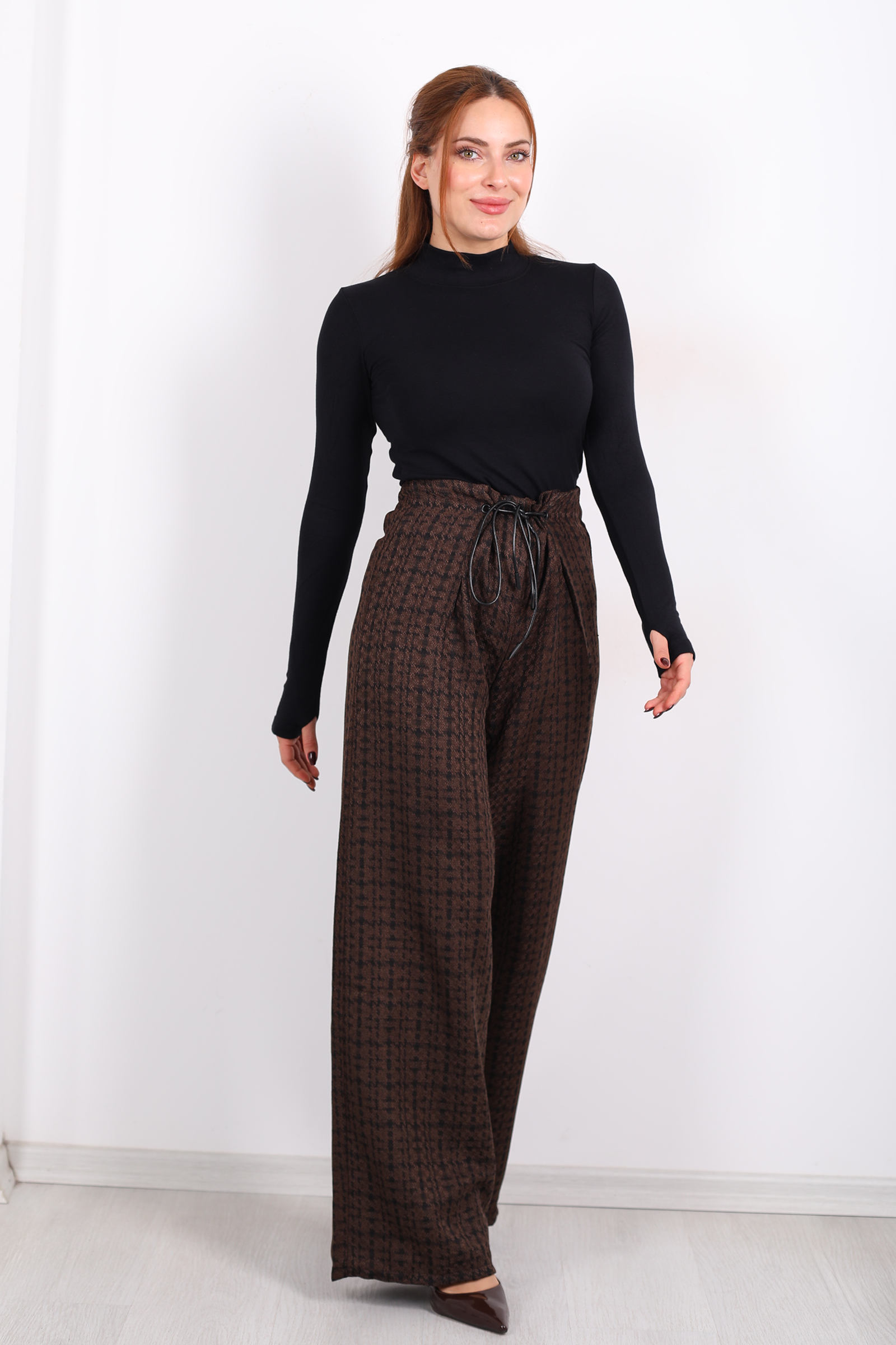 Lastik Detaylı Geniş Paça Acı Kahve Kadın Ekose Pantolon