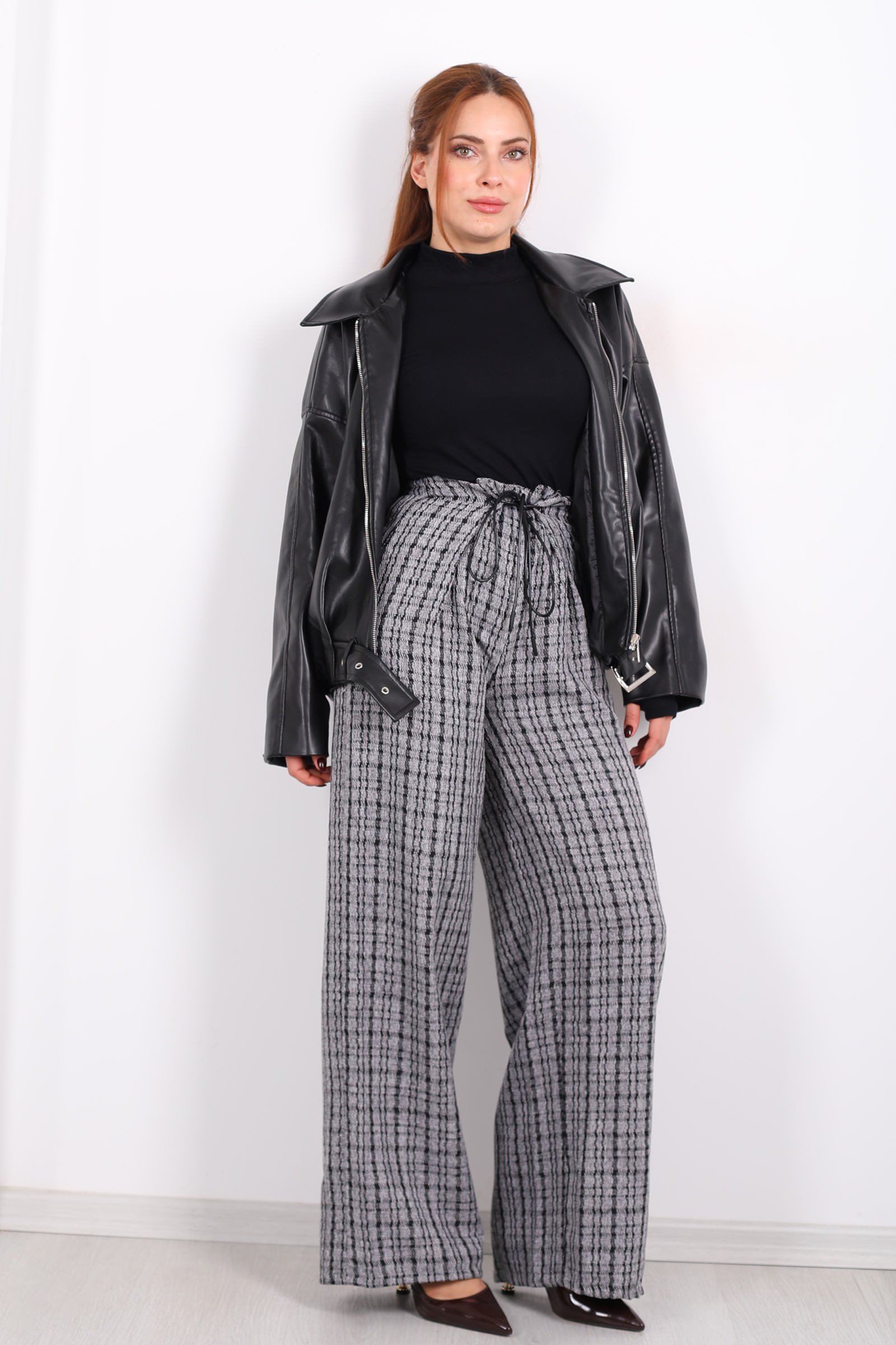 Lastik Detaylı Geniş Paça Gri Kadın Ekose Pantolon