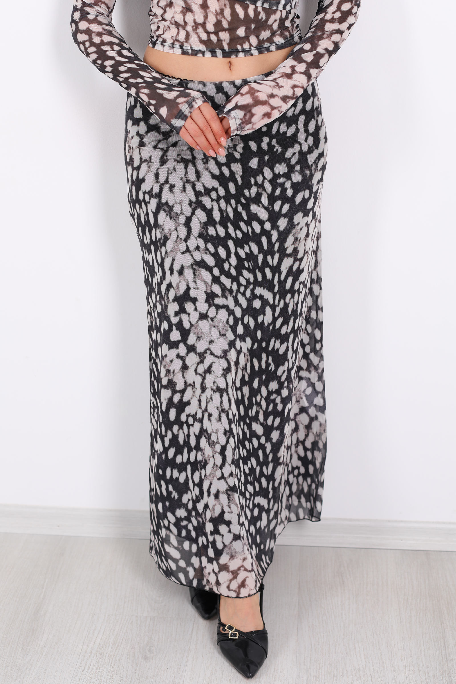 Siyah zemin üzerinde cesur ve dikkat çekici leopar deseniyle bezenmiş bu maxi etek, vahşi zarafeti modern bir siluetle sunuyor. Uzun boyuyla zarafet katarken, deseniyle iddialı ve kendinden emin bir duruş yaratıyor.Kumaş yapısı olarak büyük olasılıkla poliviskon gibi akıcı ve dökümlü bir karışım kullanılmış. Poliviskon kumaşlar, hem polyesterin dayanıklılığı hem de viskonun akıcılığını bir arada sunar; ayrıca canlı baskılar için oldukça idealdir.
