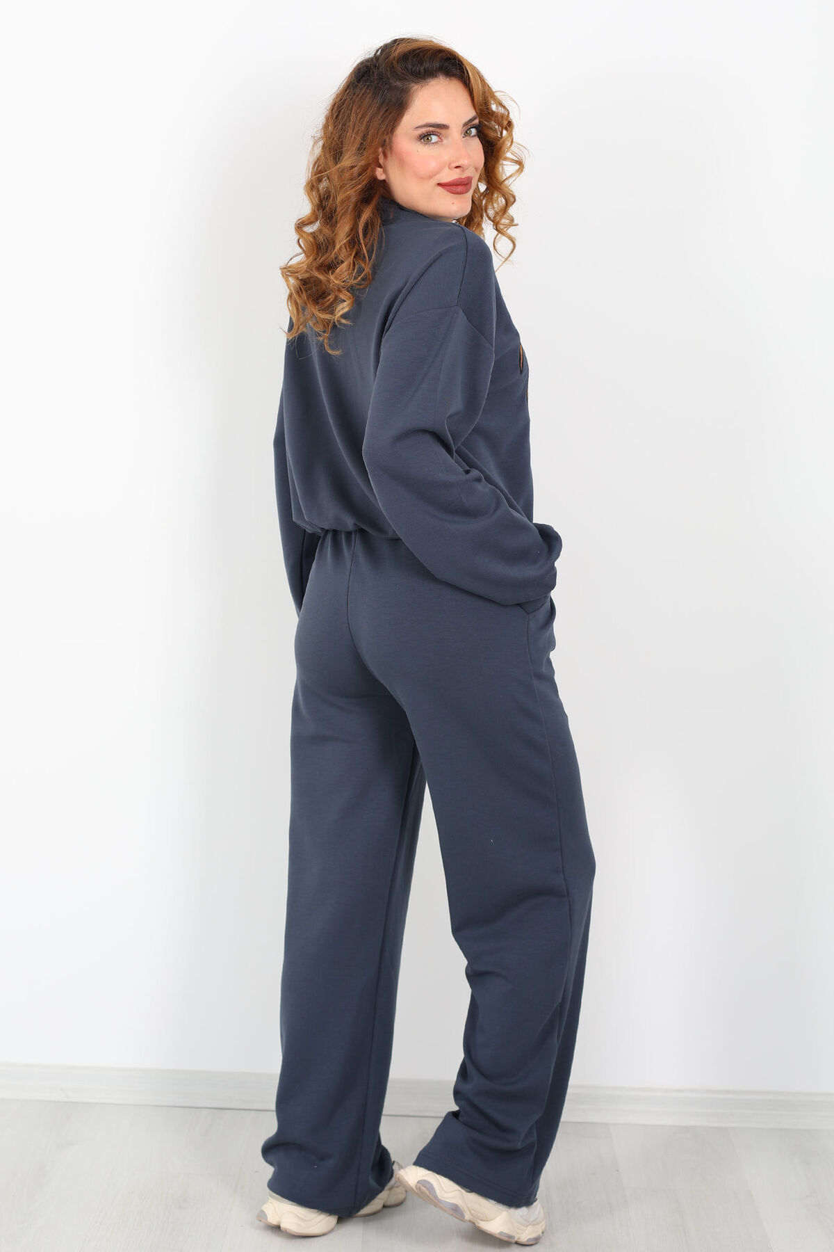 Yanları Şeritli Bol Paça Saks Mavisi Kadın Yumoş Pantolon