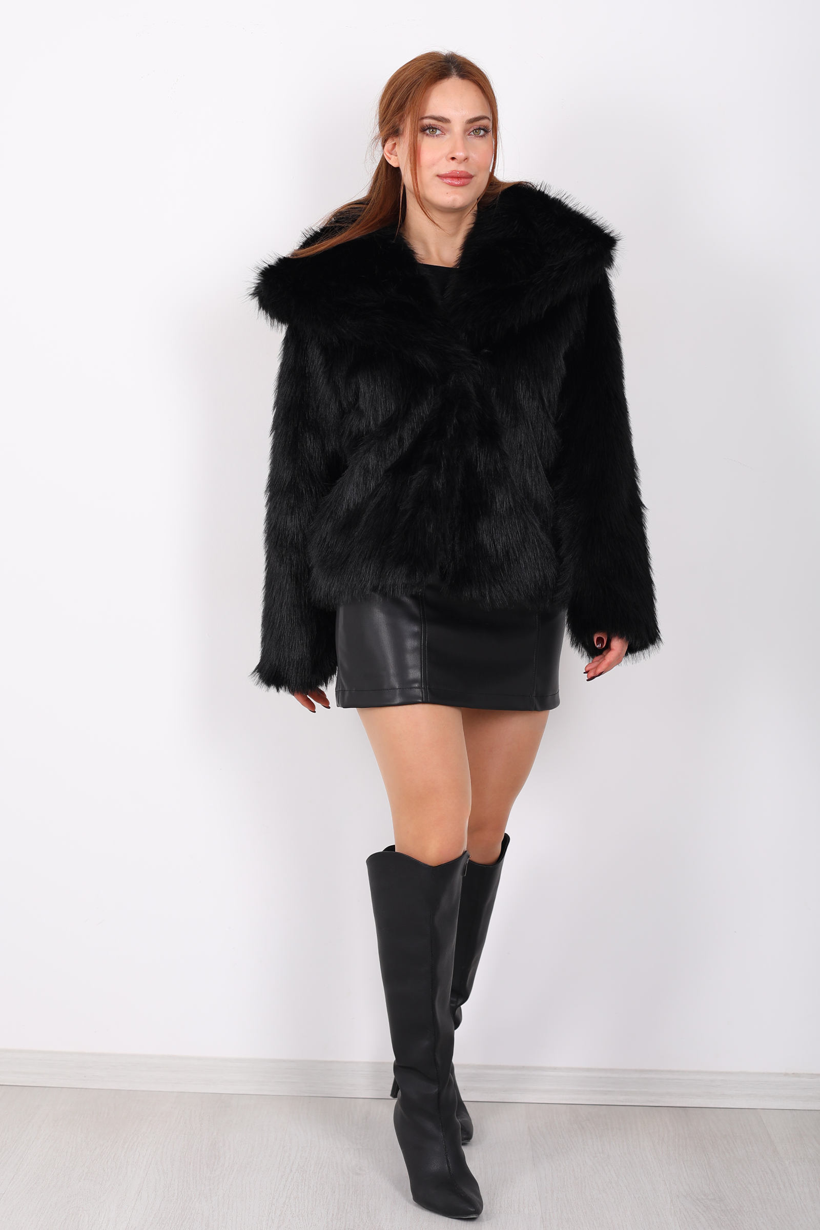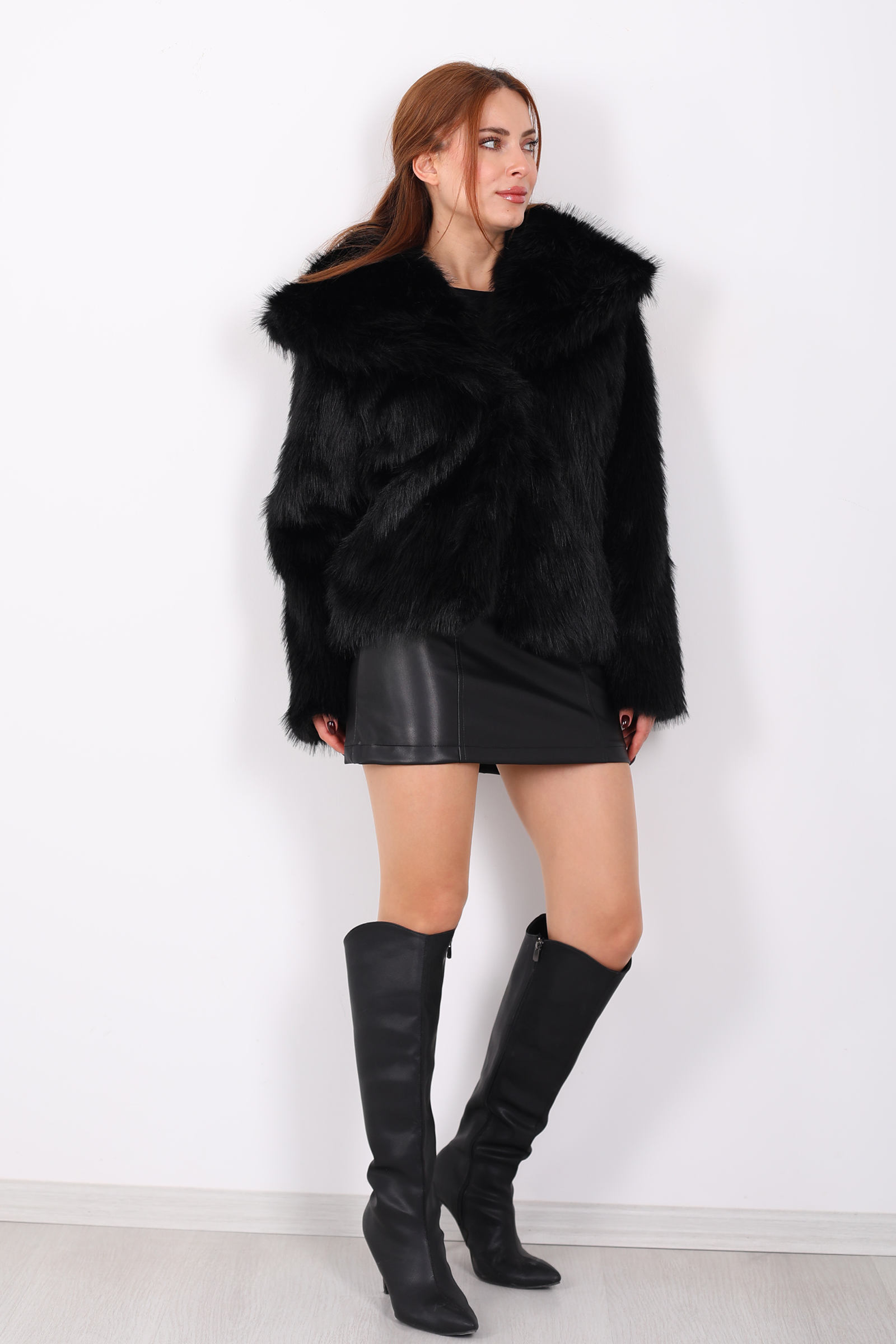 Uzun Kürklü Siyah Kadın Kemerli Lolita Mont