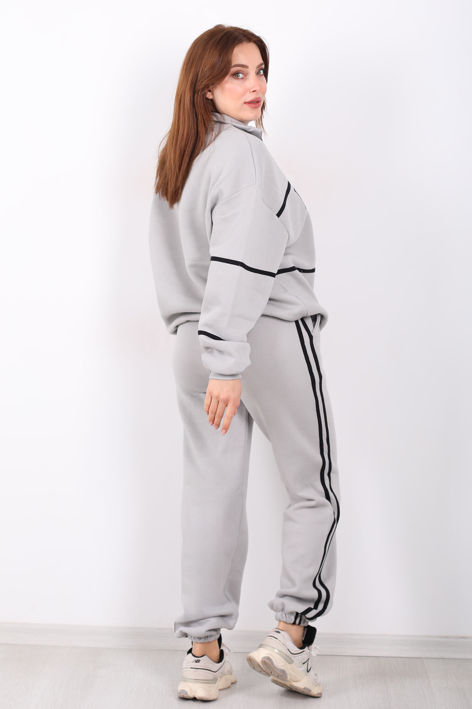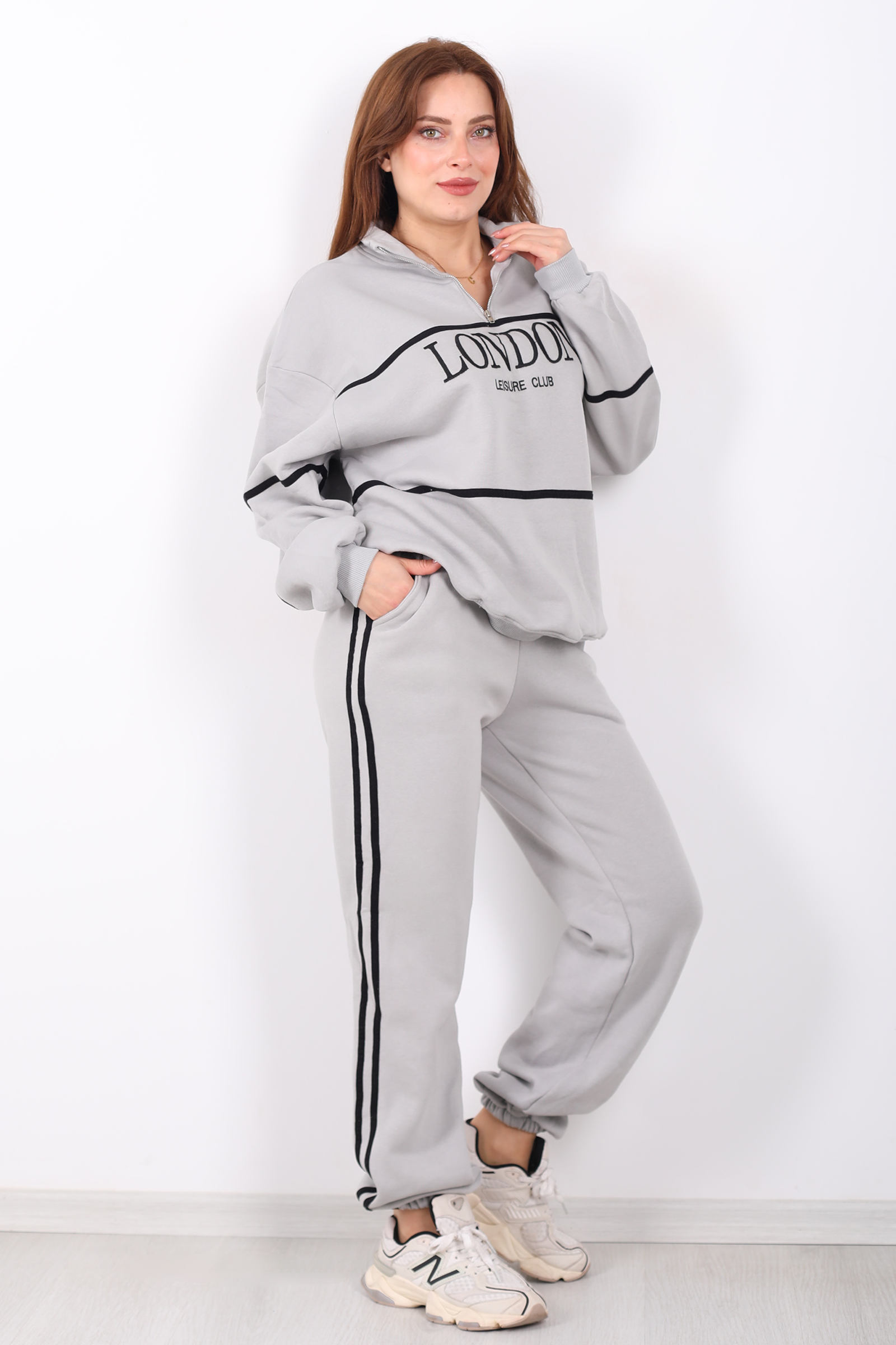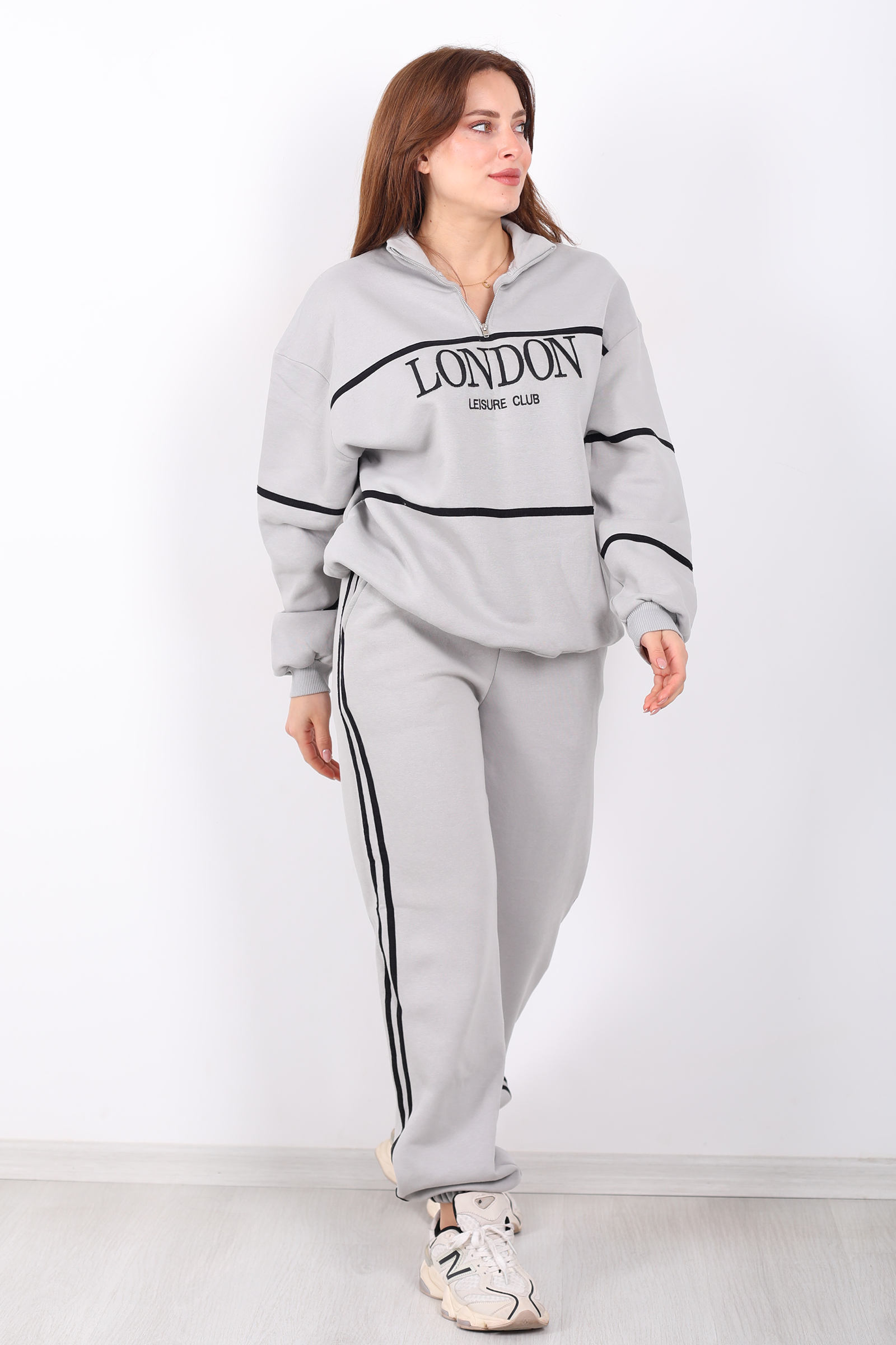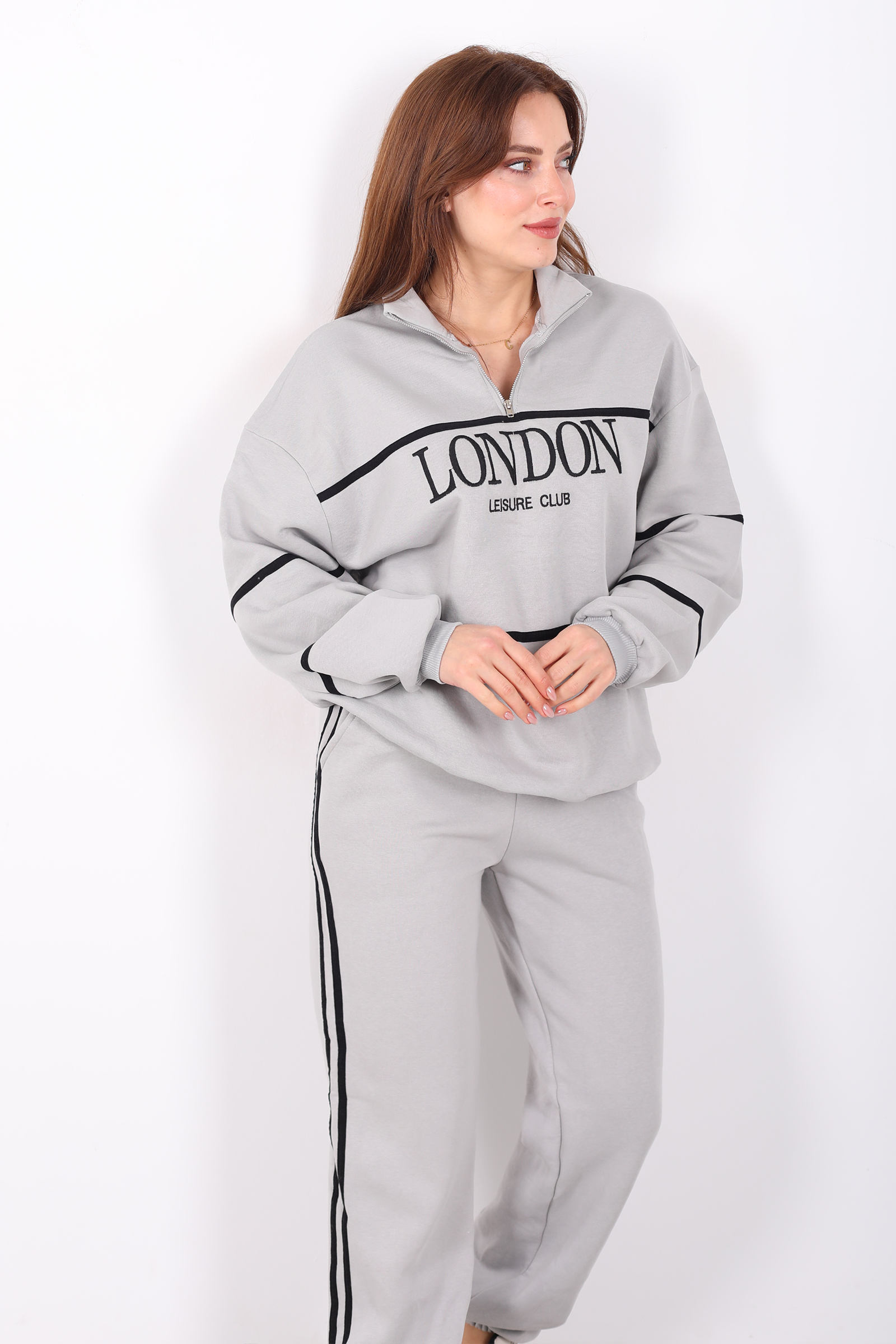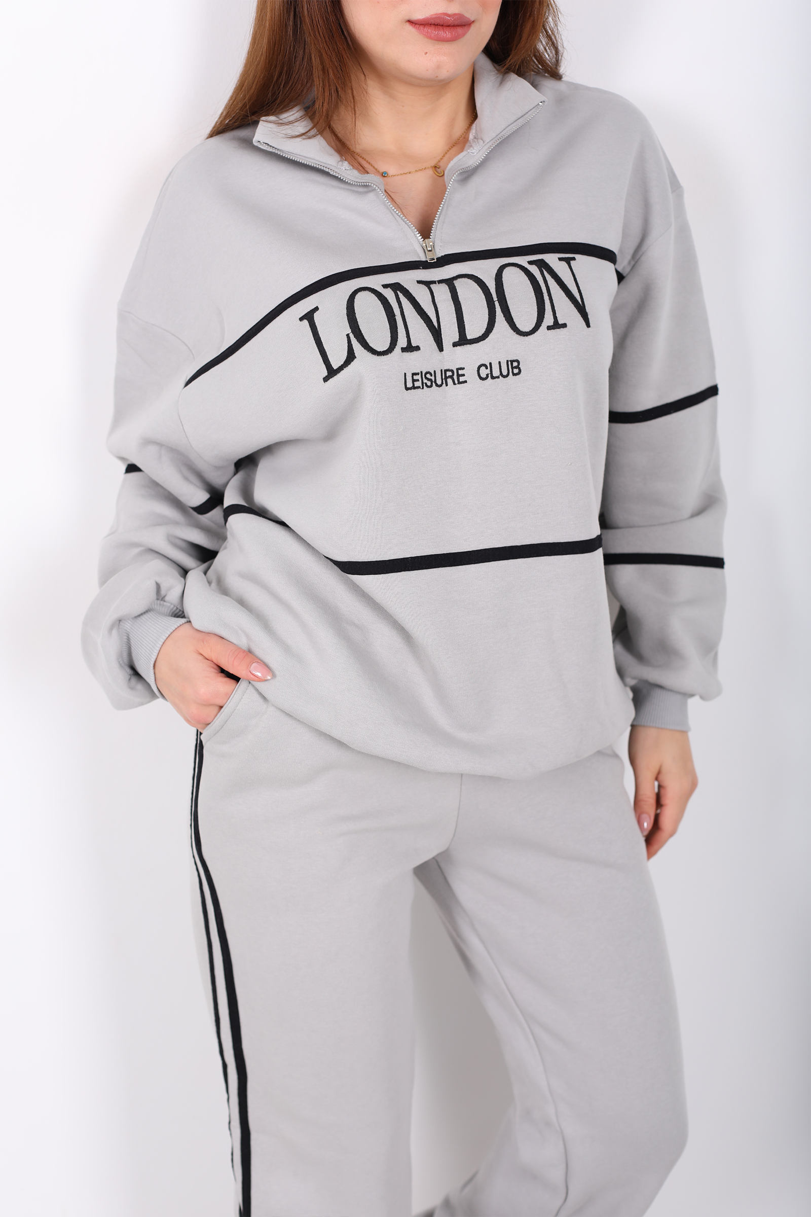 London nakışlı dik yaka gri üç iplik kadın takım, modern ve minimalist bir spor şıklık sunar. Yumuşak ve dayanıklı üç iplik kumaştan üretilen bu takım, dik yaka detayı ile sportif bir hava yaratırken nakışlı tasarımıyla da zarif bir detay ekler. Gri tonuyla kolay kombinlenebilir bir stil sunar; günlük hayatta konforlu ve şık bir görünüm isteyenler için idealdir. Türkiye’de üretilmiş olup, normal kalıp yapısıyla rahat kullanım sağlar.