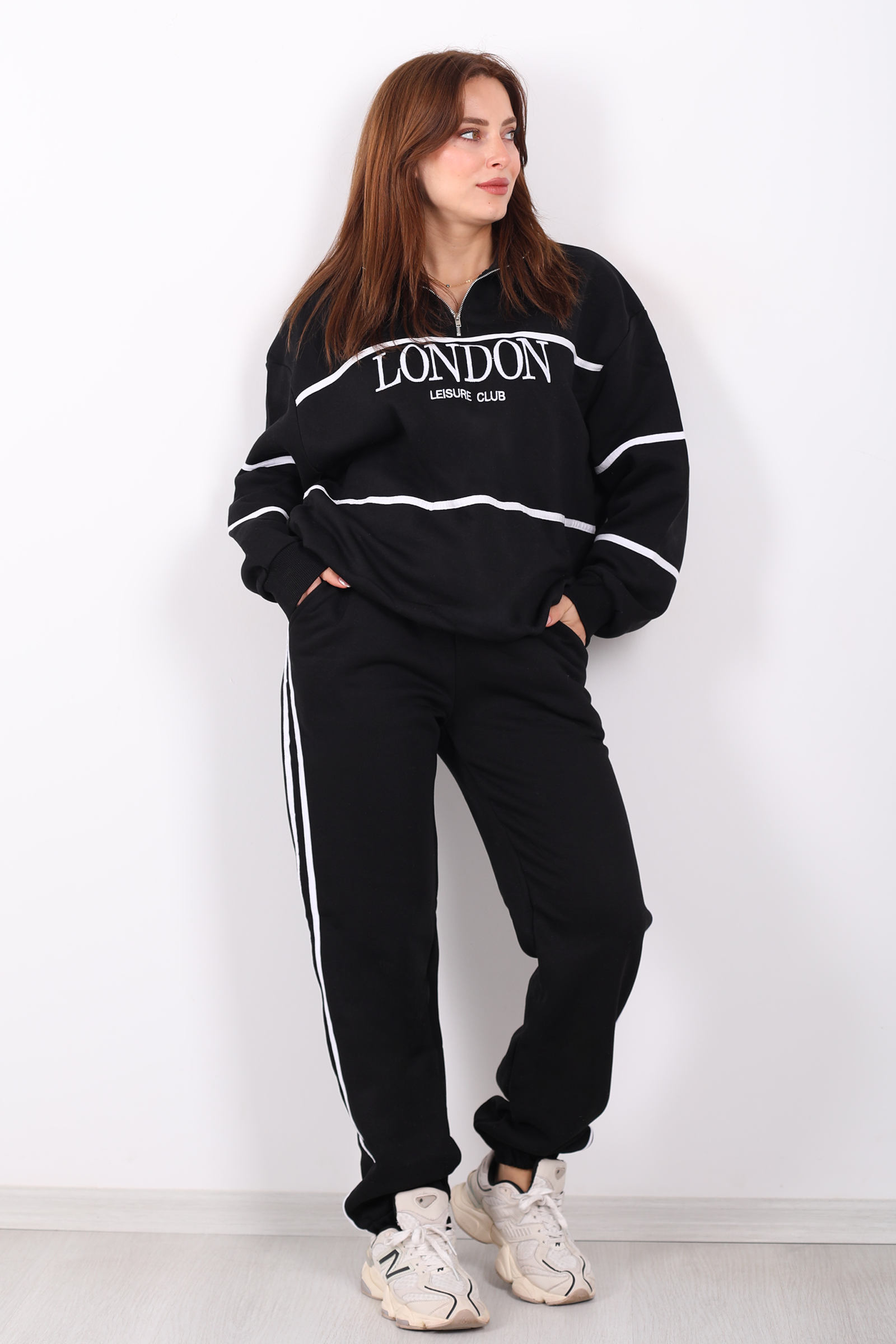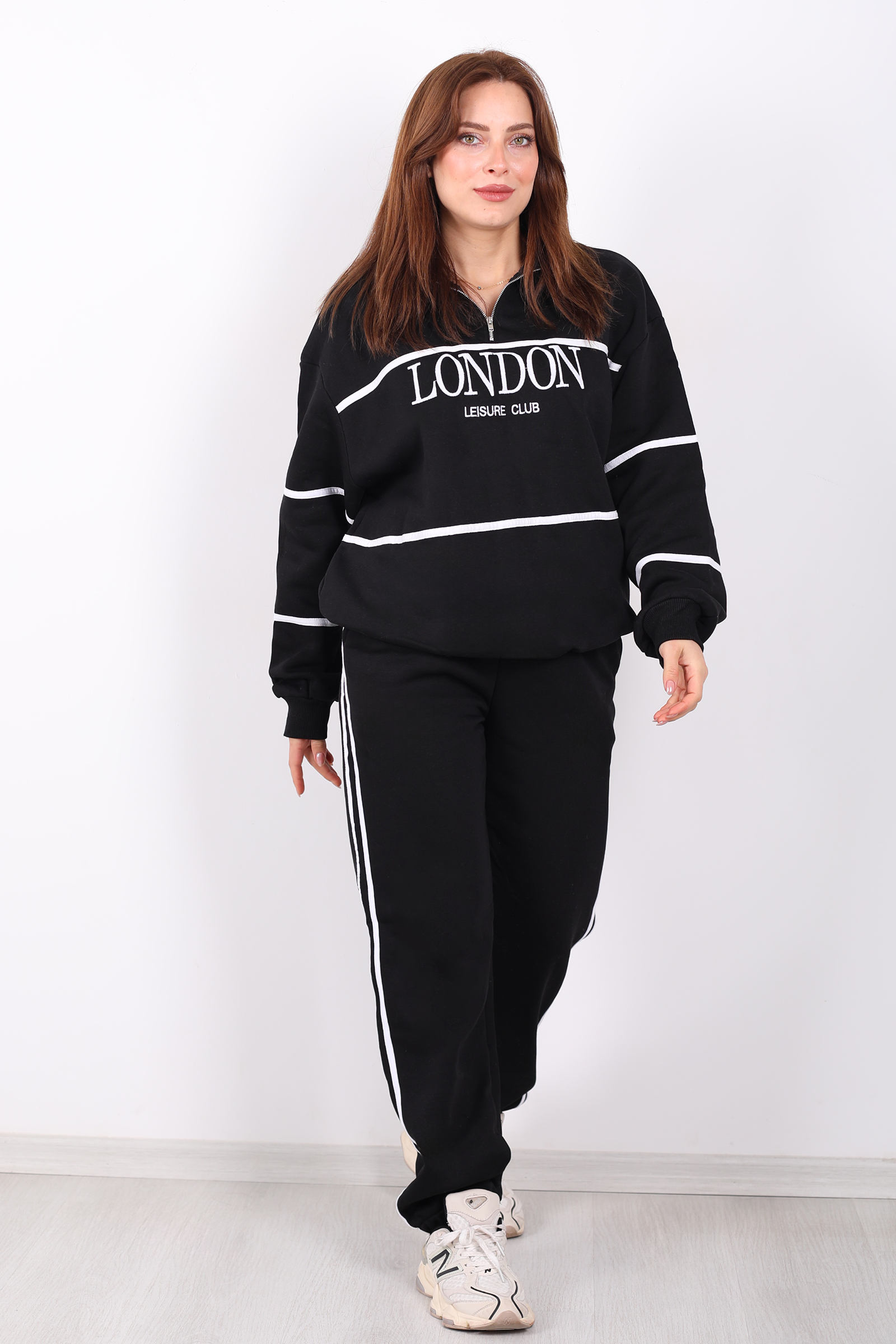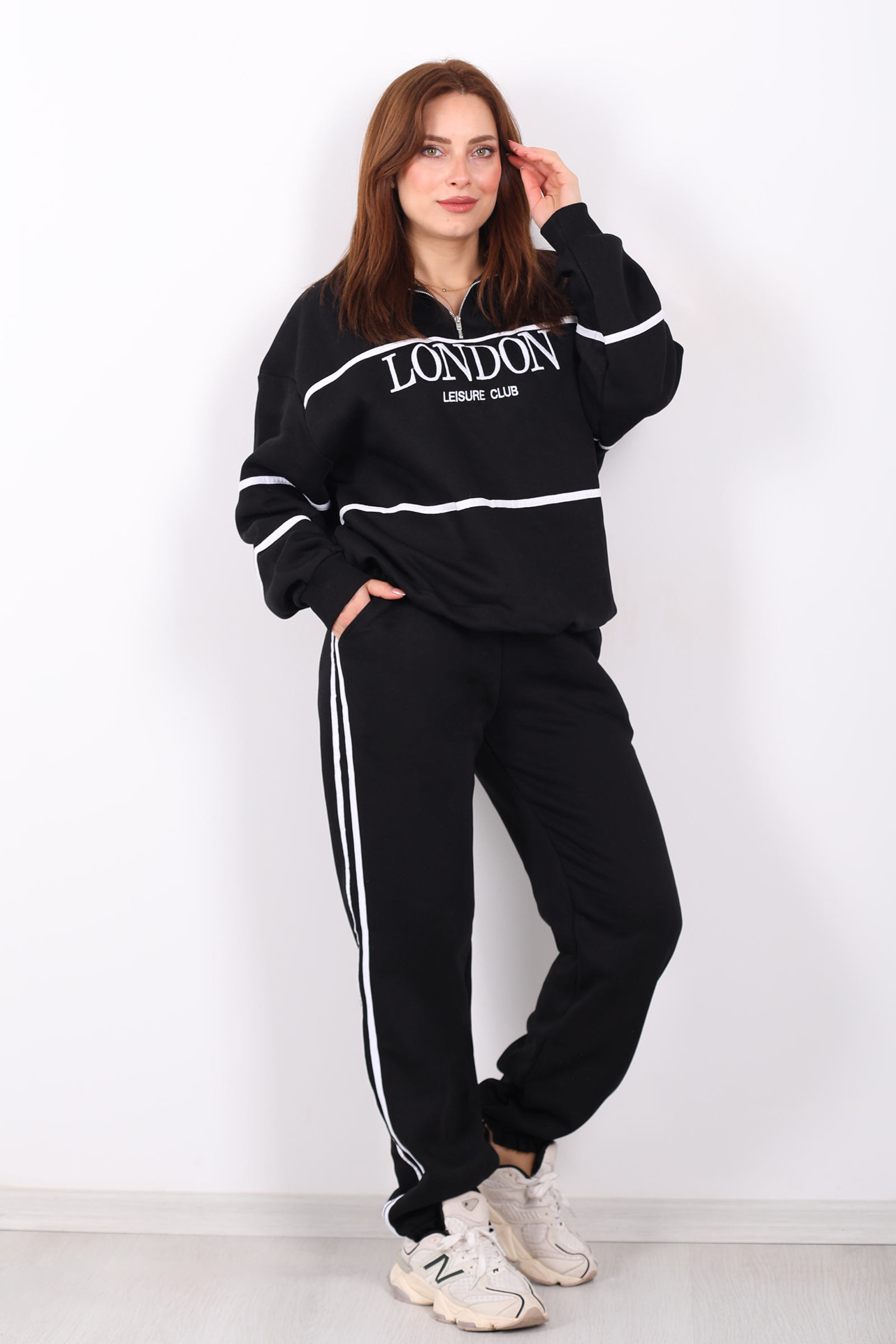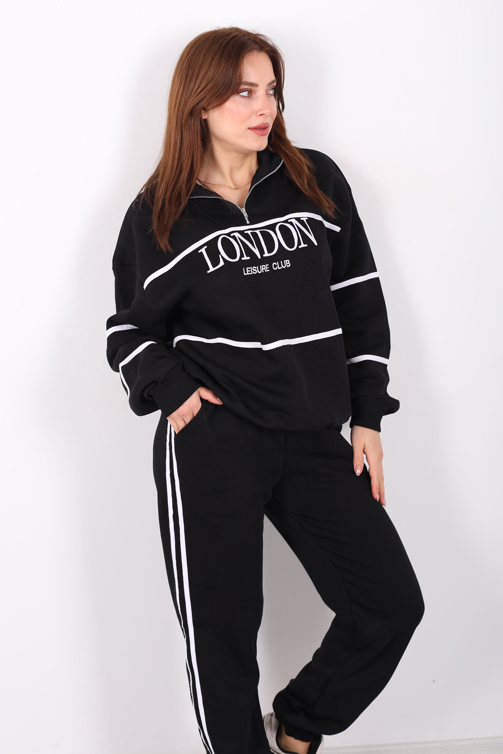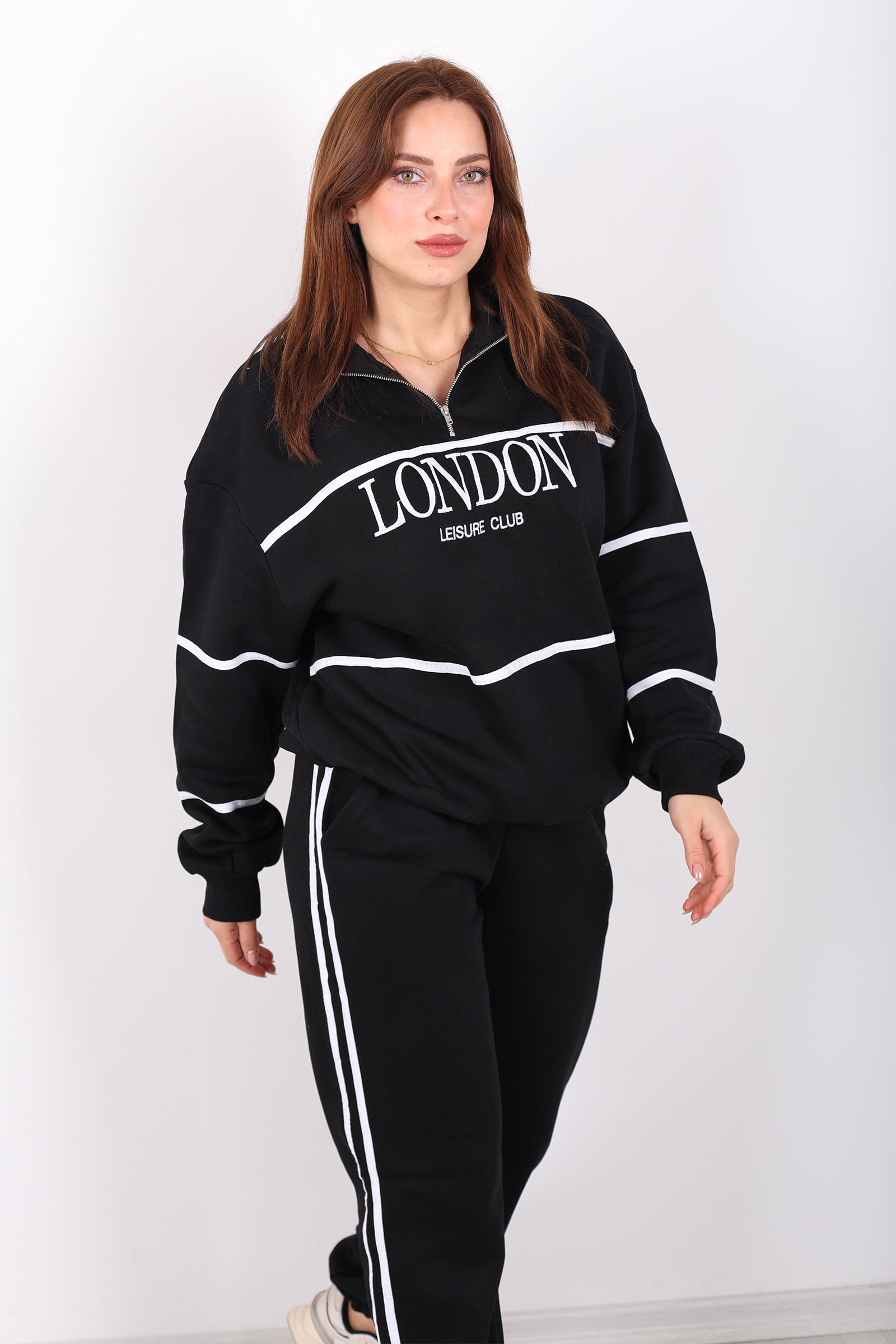 Siyahın zarafeti ile minimalist detayların buluştuğu London nakışlı dik yaka üç iplik kadın takım, konfor ve modern stili bir arada sunar. Yumuşak dokulu üç iplik kumaştan üretilen bu takım, normal kalıp kesimi sayesinde günlük kullanıma uygundur ve hareket özgürlüğü sağlar. Dik yaka tasarımı spor duruşu güçlendirirken, nakışlı detaylar sade ama etkileyici bir şıklık katar. Siyah tonuyla her kombinle kolay uyum sağlayan bu takım; yürüyüşlerde, evde rahatlık veya gündelik şıklık için idealdir. Ürün Türkiye’de üretilmiştir ve görseldekiyle birebir aynısı gönderilir.