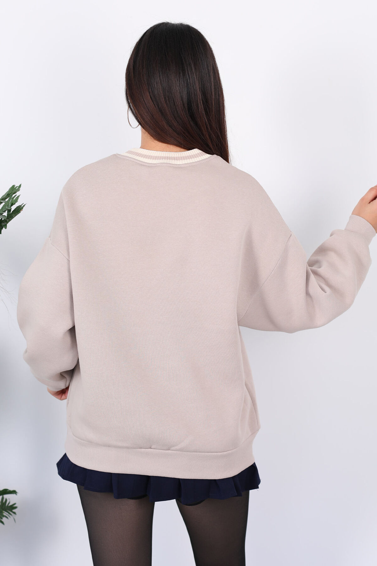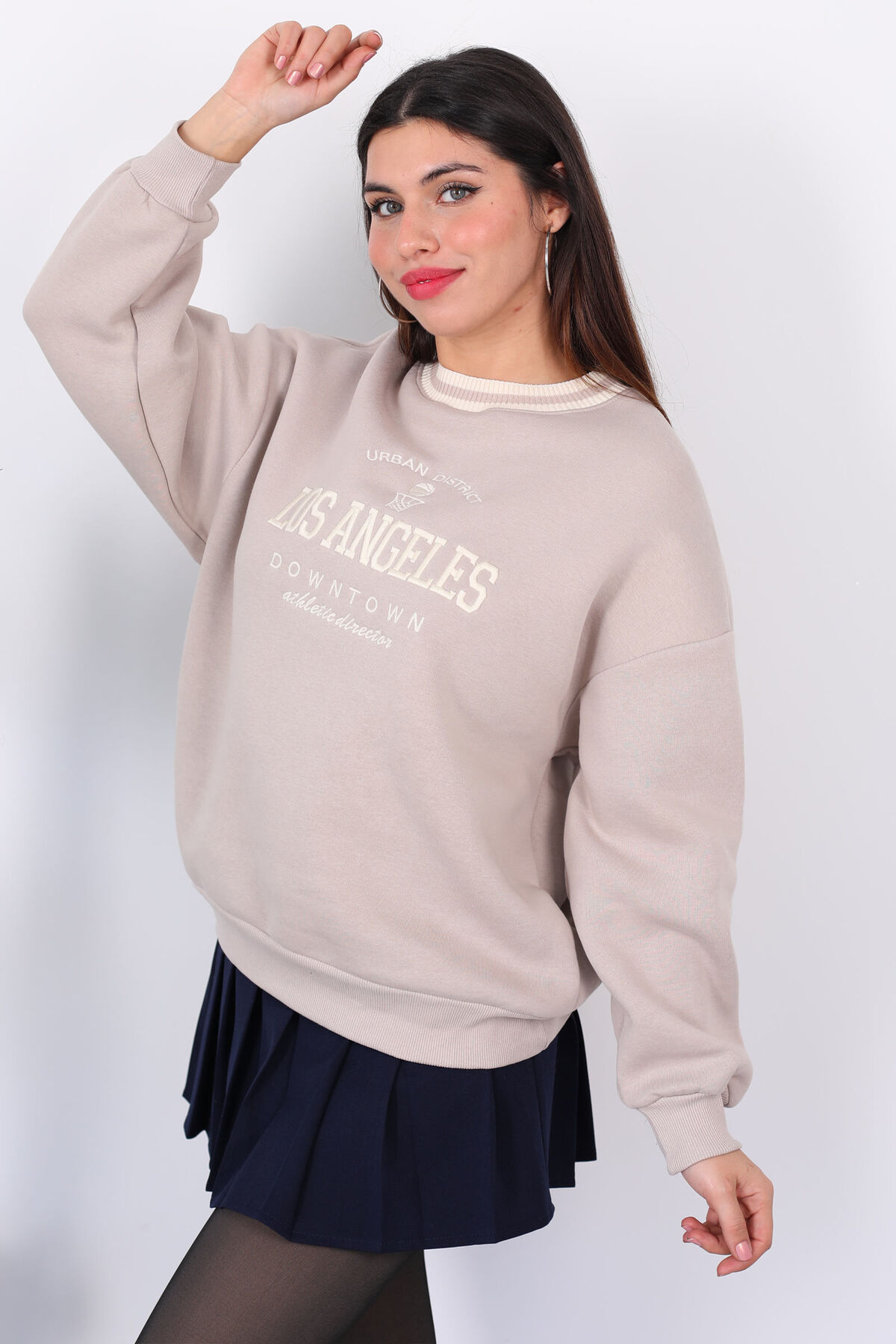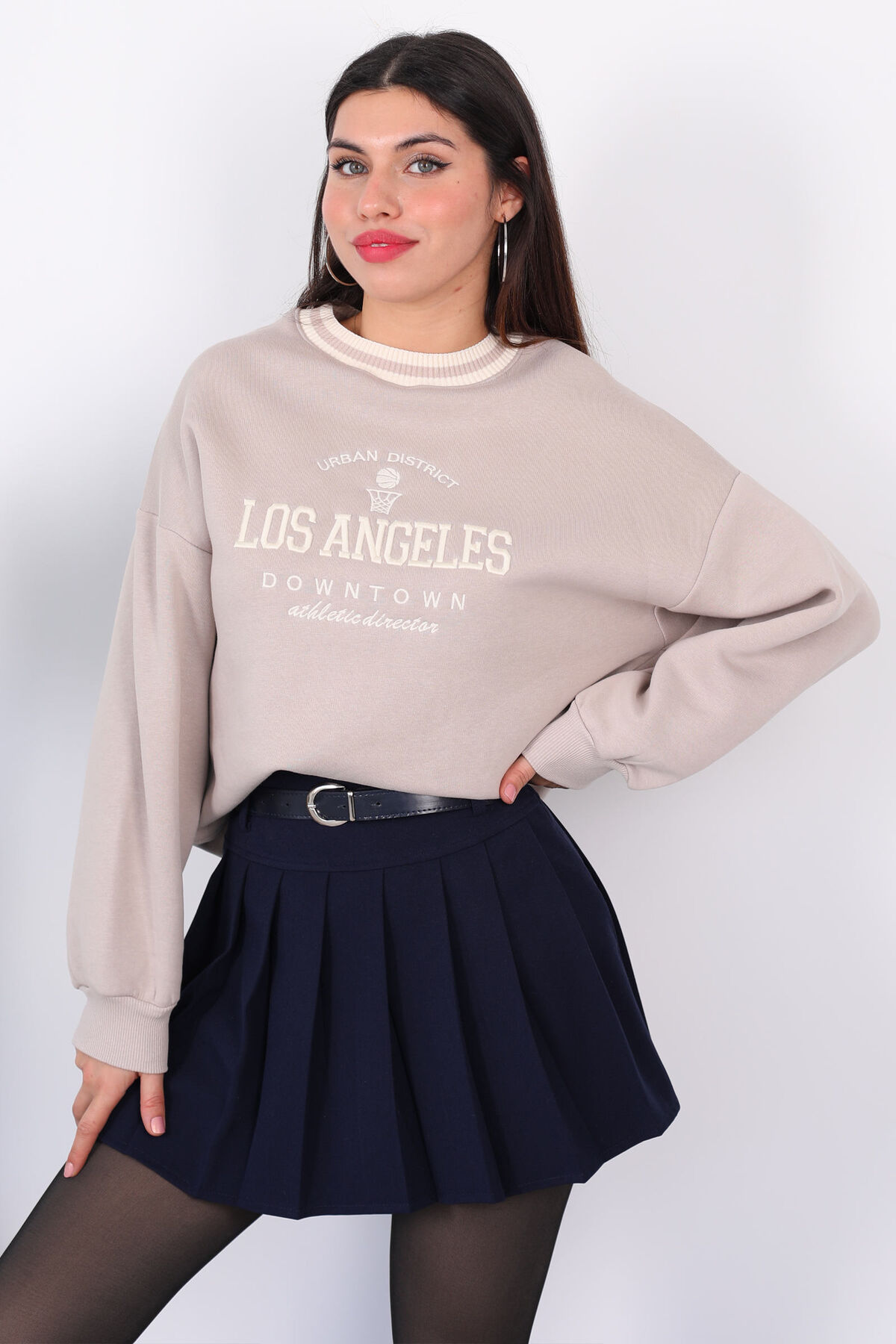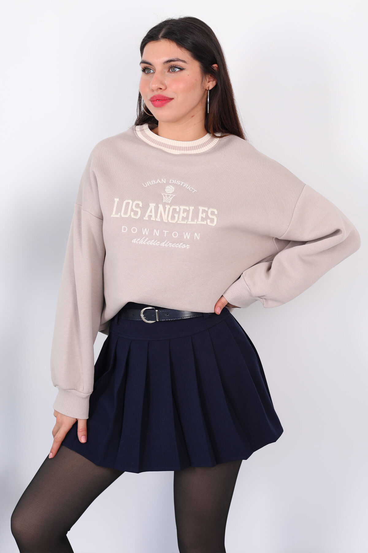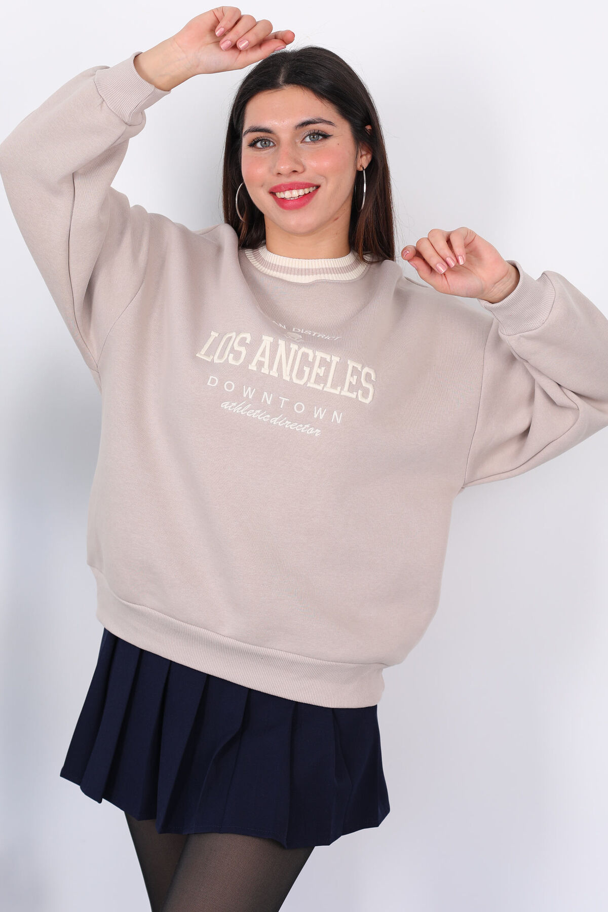 Los Angeles Nakışlı Yaka Şeritli Bej Kadın Üç İplik Sweat