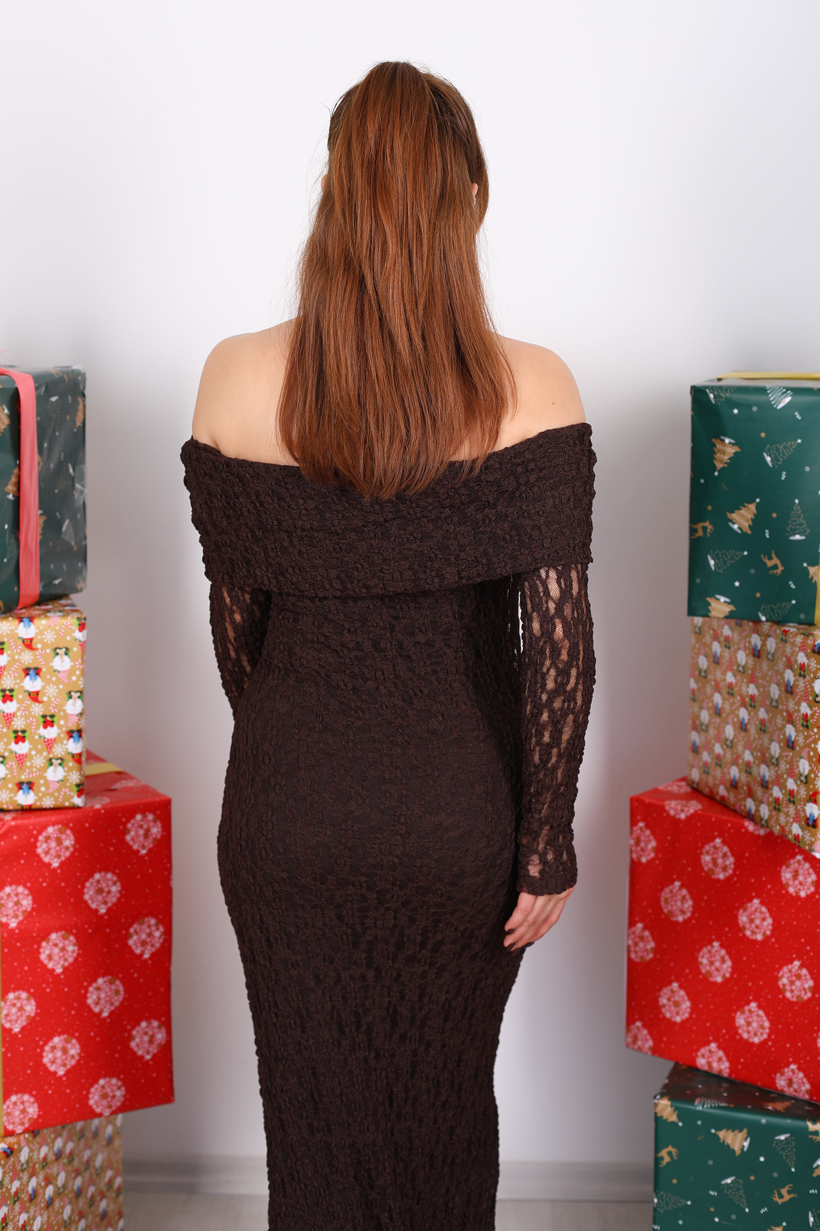 Acı kahve rengi, klasik siyahın etkisini daha yumuşak bir dille yansıtır; bu sayede elbise hem gündüz ışığı altında hem de akşam ışıltısında farklı bir karakter kazanır. Maksimum uzunluk, inci gibi süzülen dantel dokusuyla birleştiğinde zarif bir siluet çizer; bu da elbiseyi özel davetlerden romantik akşam buluşmalarına kadar çok yönlü bir stil parçası haline getirir.