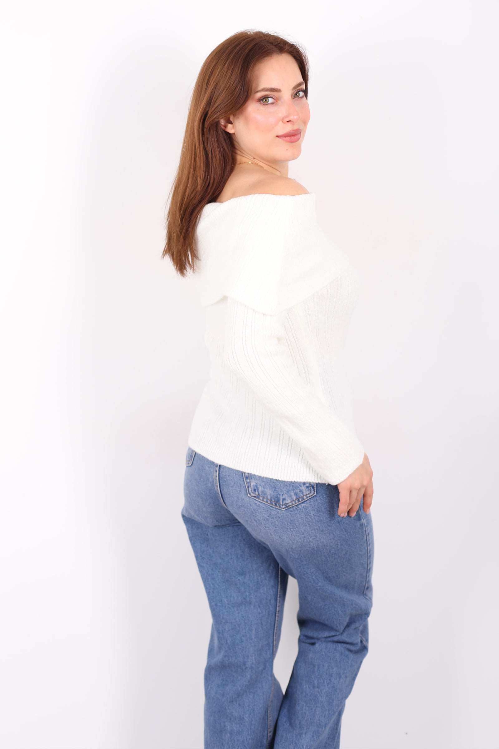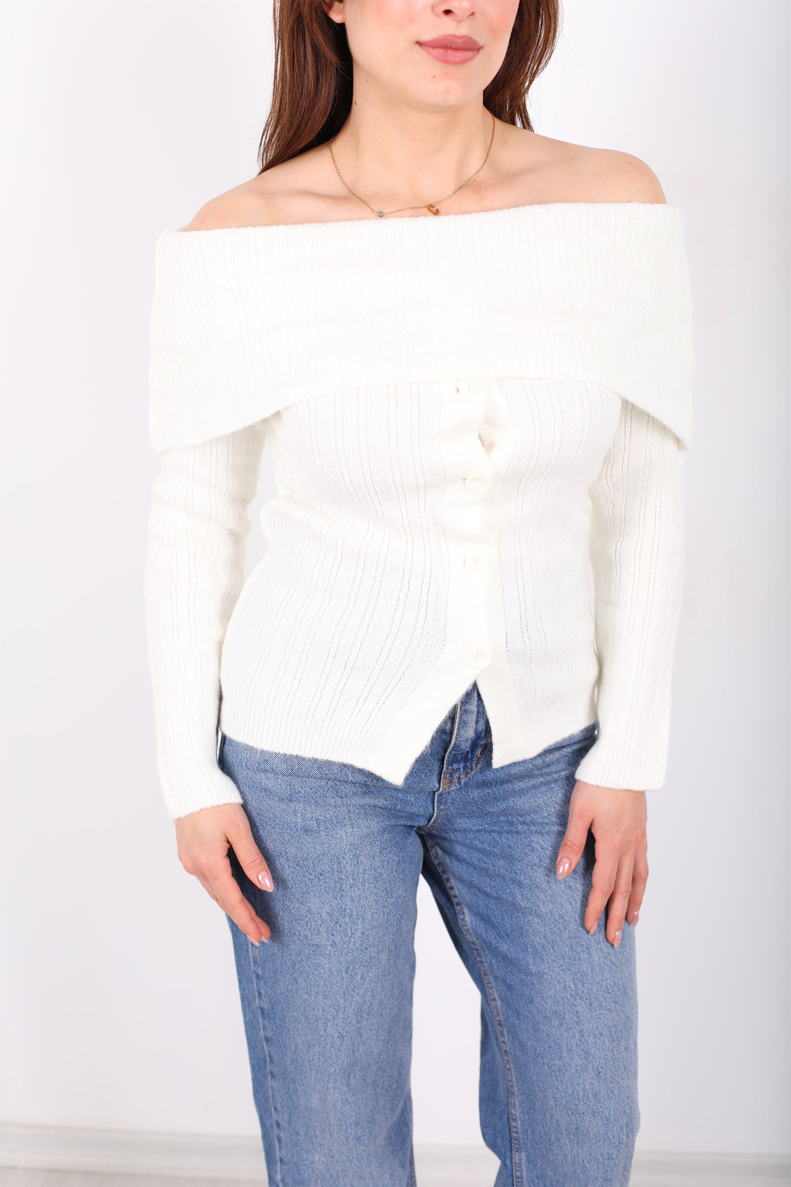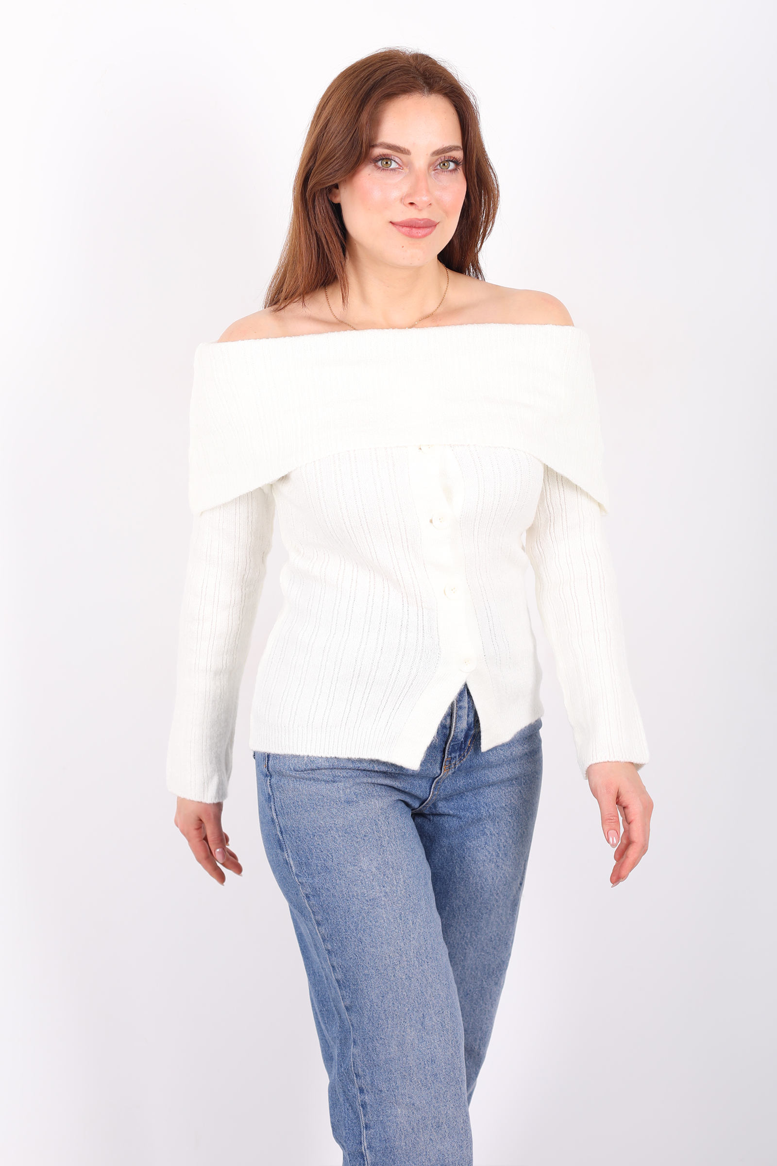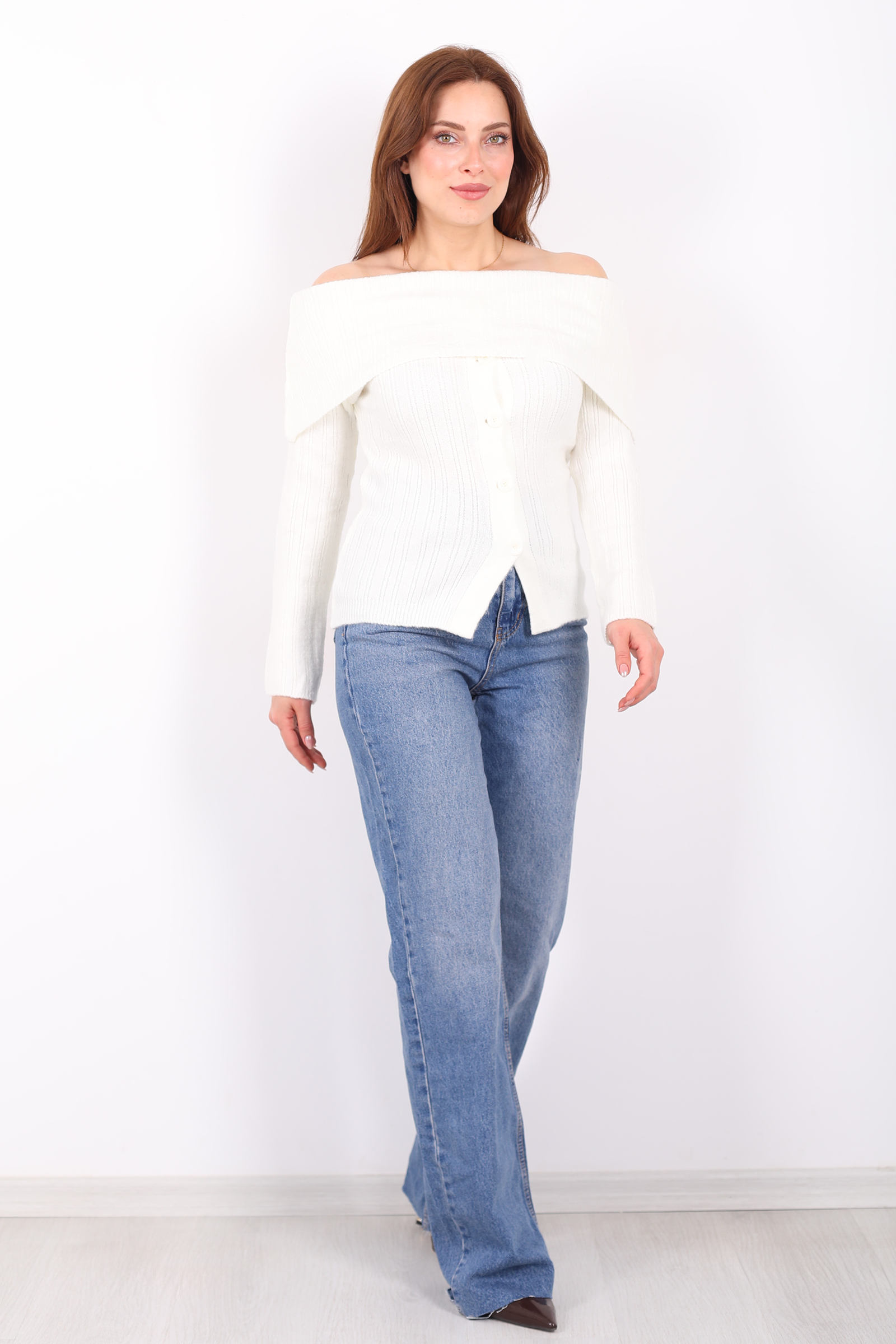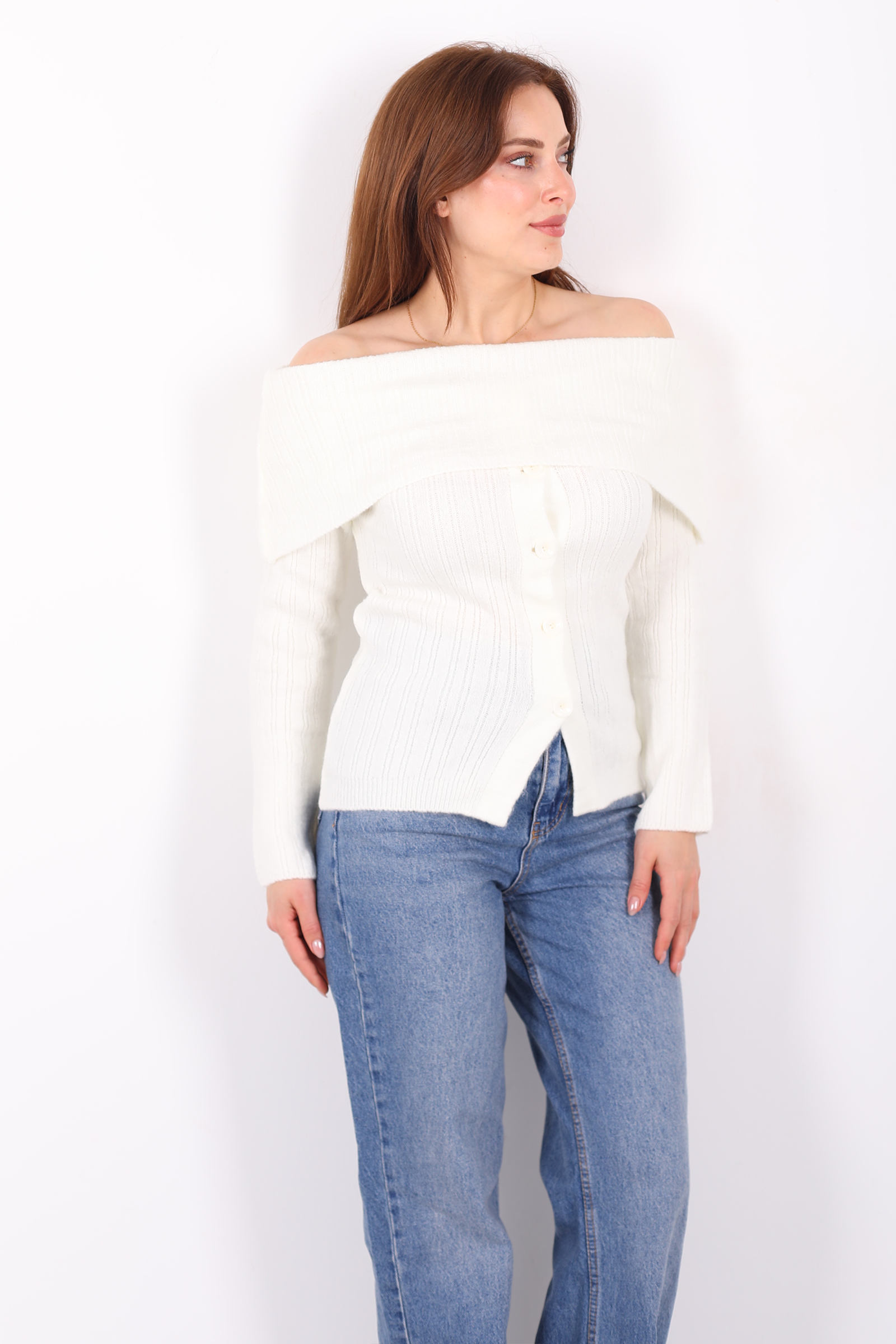 Beyazın ferahlığını yansıtan bu Madonna yaka düğmeli triko kazak, yumuşak ve esnek dokusuyla soğuk günlerin vazgeçilmezi olur. Madonna yaka detayı yüz hattını zarifçe çerçevelerken düğmeler klasik kesime modern bir dokunuş katıyor. Rahat kesimi sayesinde günlük jean’lerle ya da şık eteklerle kolayca kombinlenir. Sneaker veya botlarla tamamlandığında minimalist ama etkileyici bir stil sunar. Her gardıropta yer alması gereken çok yönlü bir parça.