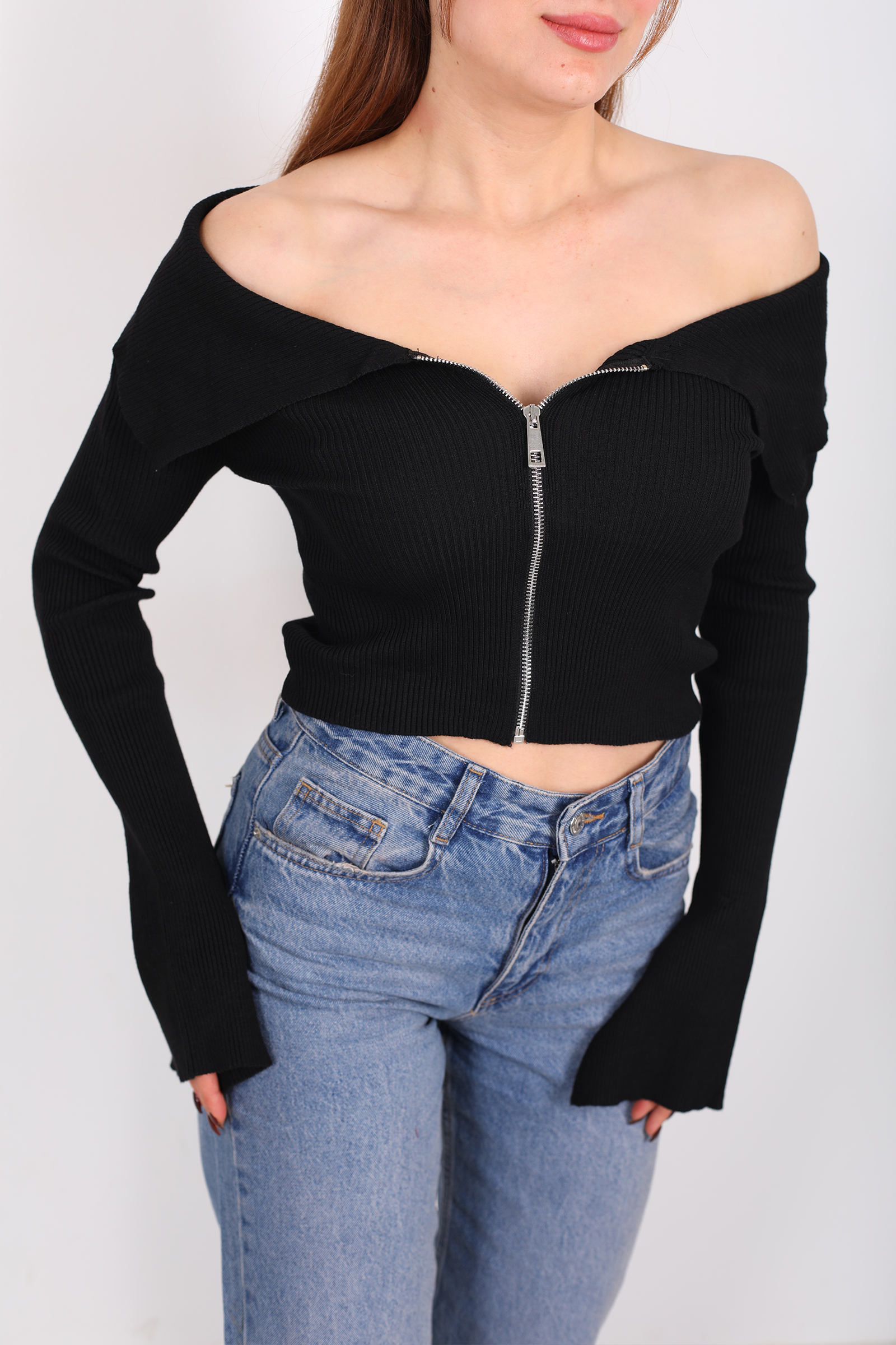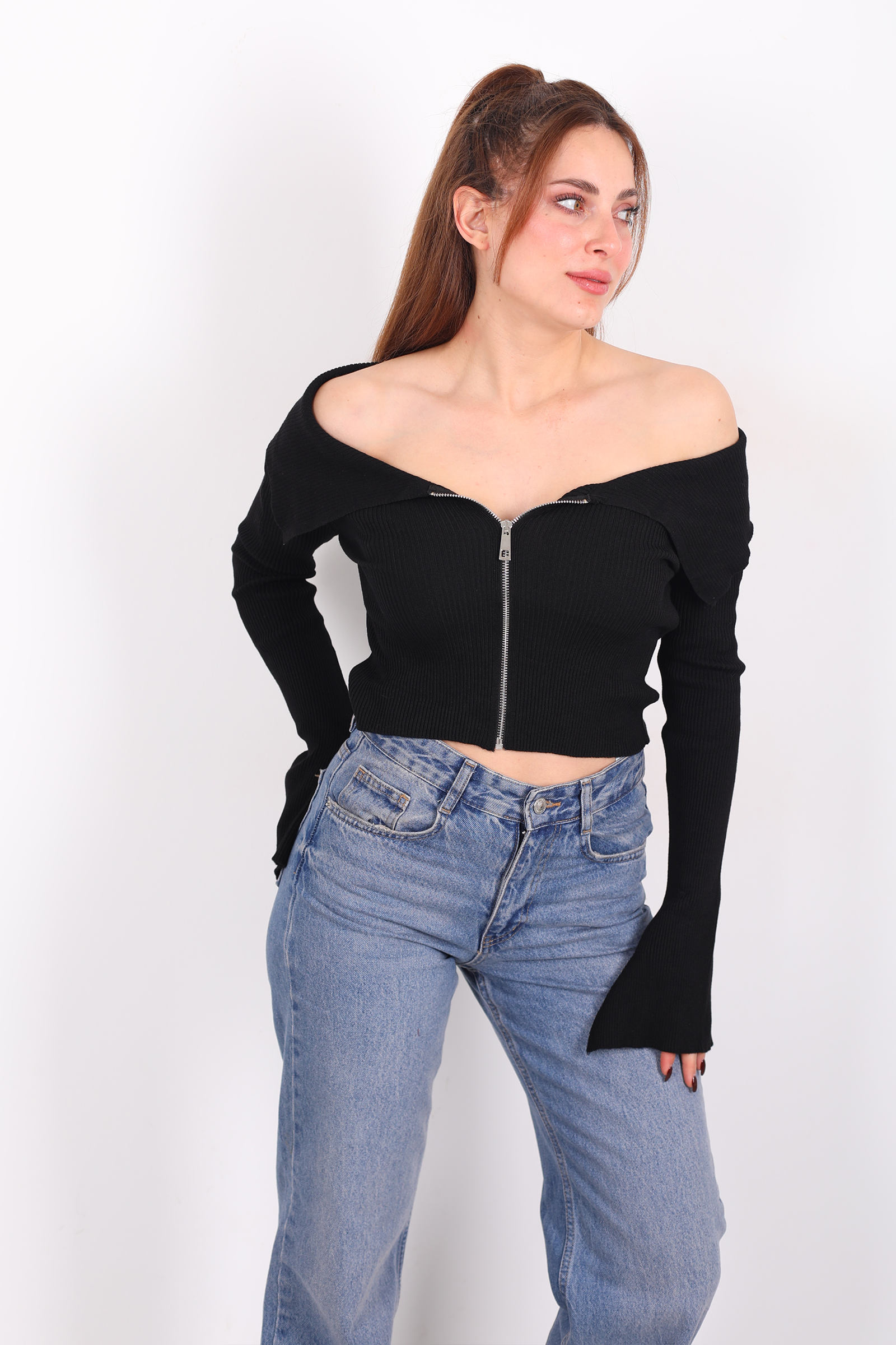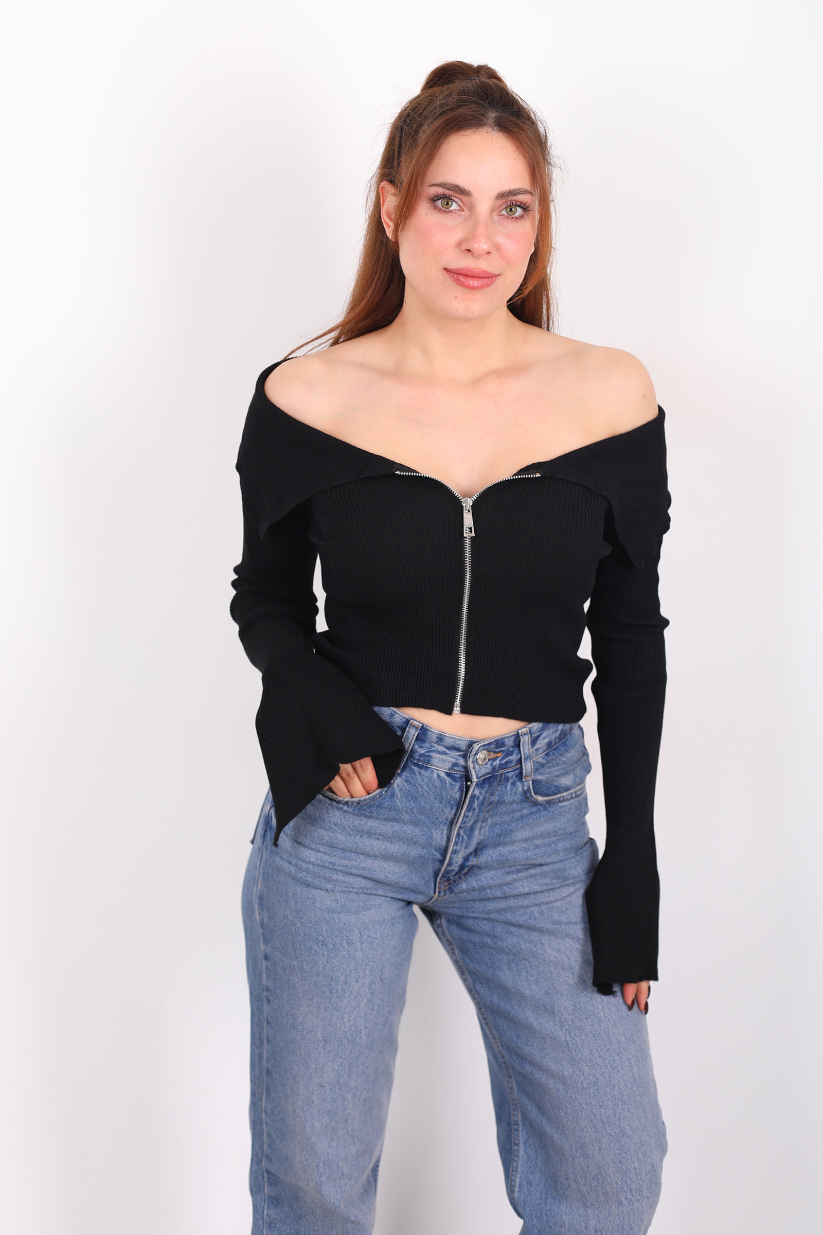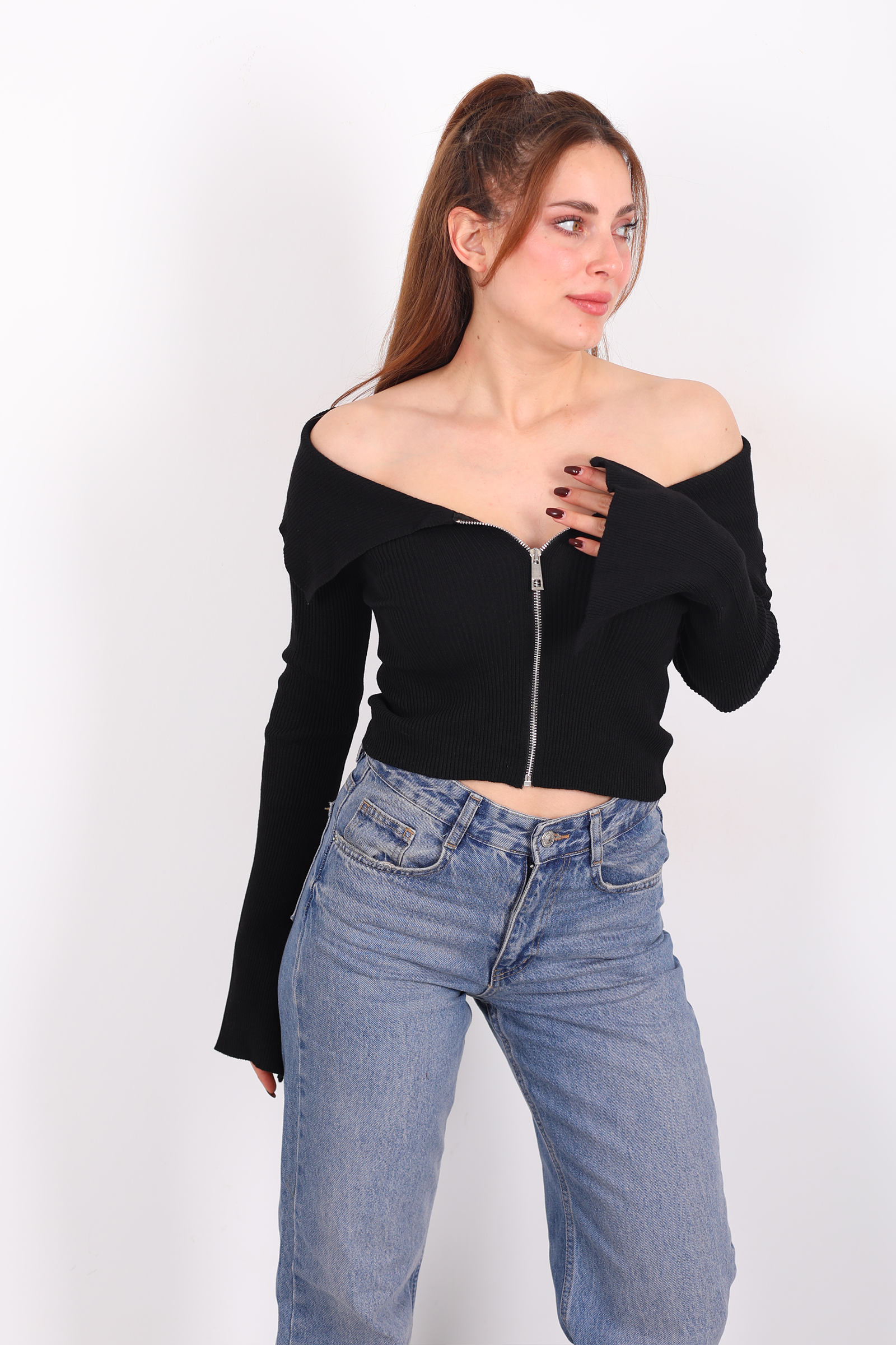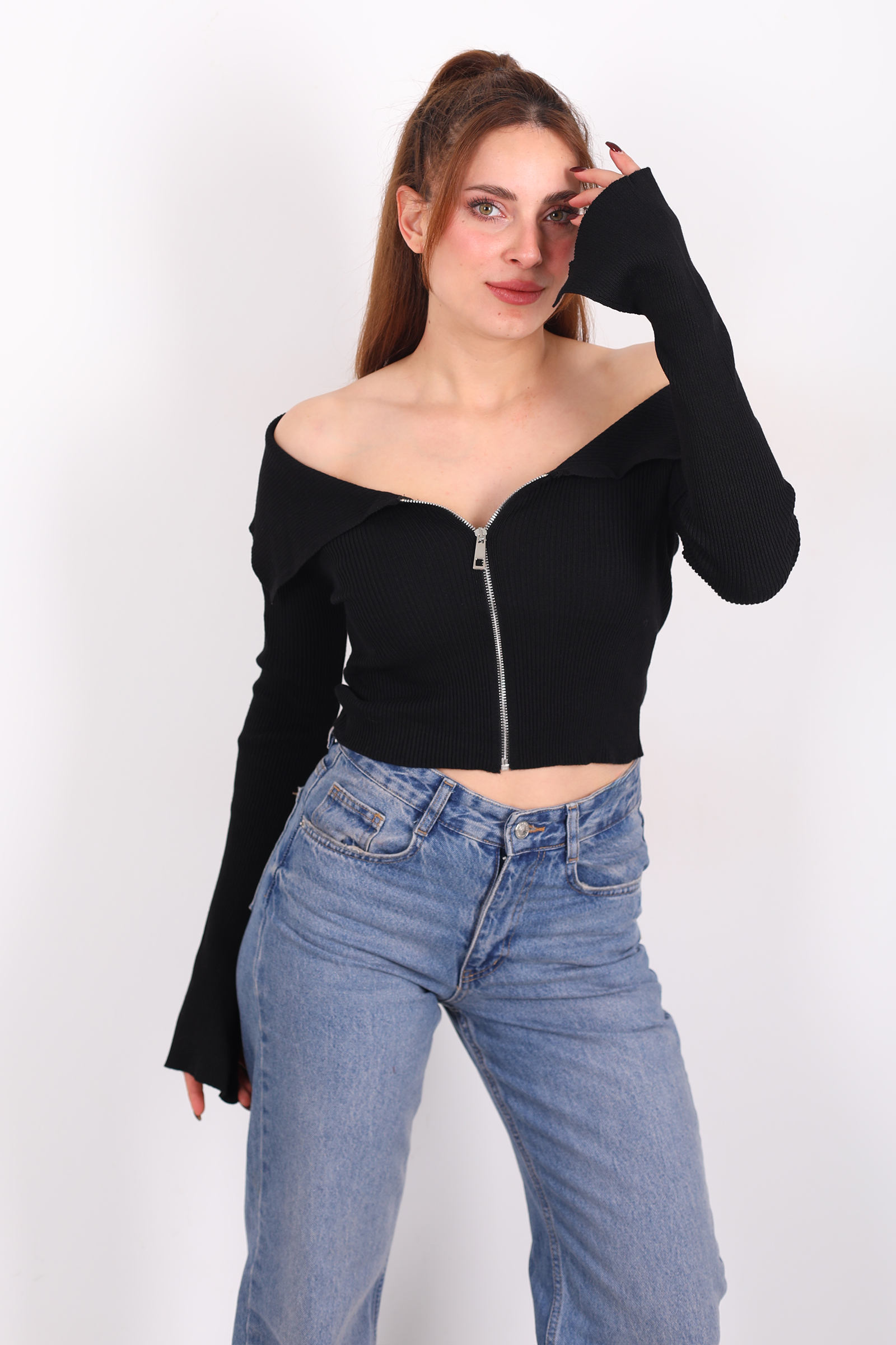 Siyahın enerjisi ile tasarımın ritmini buluşturan bu bluz, sıradan üst giyimden uzak bir duruş sergiler. Madonna yaka fermuar detayı, üstün yalnızca bir kesim özelliği değil giyen kişiye hareket kazandıran bir stil hareketi olarak hissedilir. Fermuar, hem görsel bir vurgu yapar hem de bluzun ritmini değiştirerek kombinlerine dinamik bir ifade ekler.