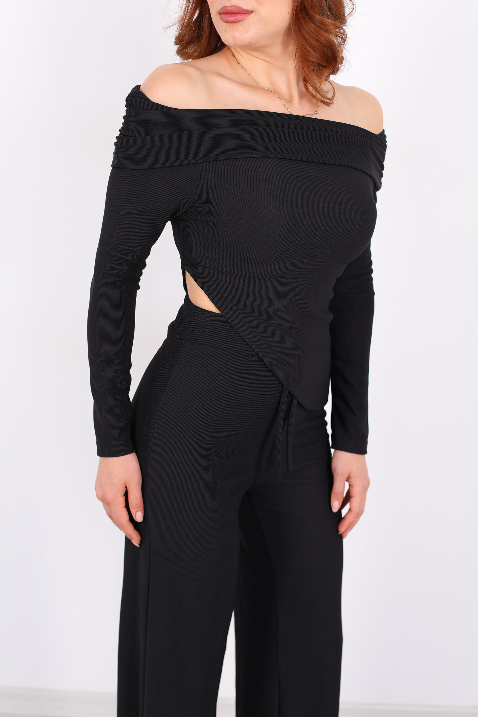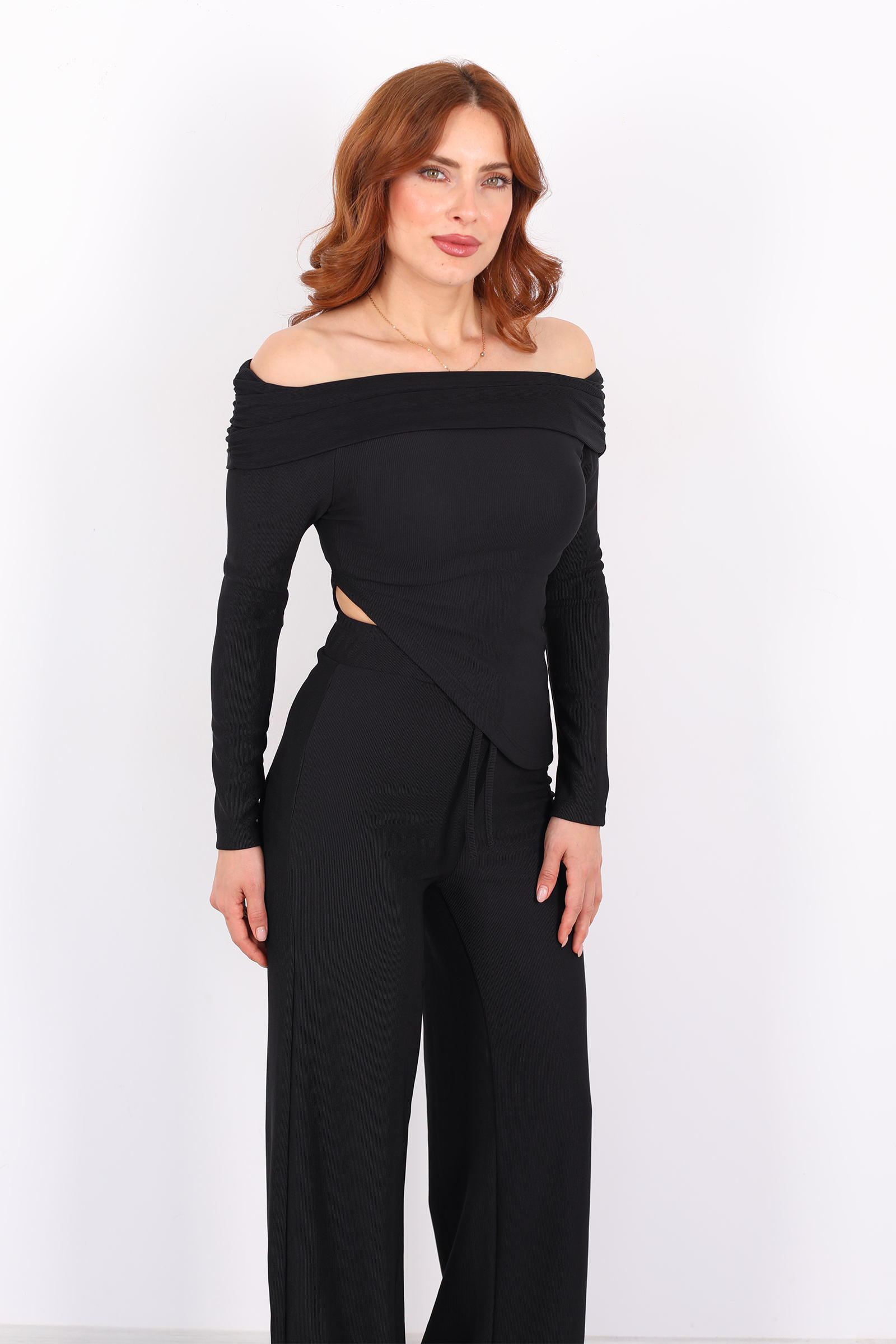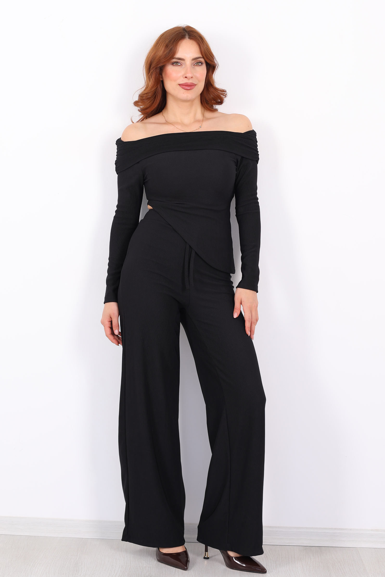 Siyahın zamansız zarafeti ile cesur bir kesimi buluşturan bu takım, Madonna yakasıyla boynunuzu zarifçe vurgularken fitilli kumaşı ve asimetrik hatlarıyla stilinize modern bir duruş katıyor.Madonna yaka detayıyla klasik bir şıklık yaratır. Bu yaka stili, omuz hattını yumuşatarak boyun çizgisine zarif bir vurgu ekler.Takımın pantolonu da siyah tonuyla üst parça ile kusursuz bir uyum sağlar; şık bir formda ve dengeli bir siluet yaratır.