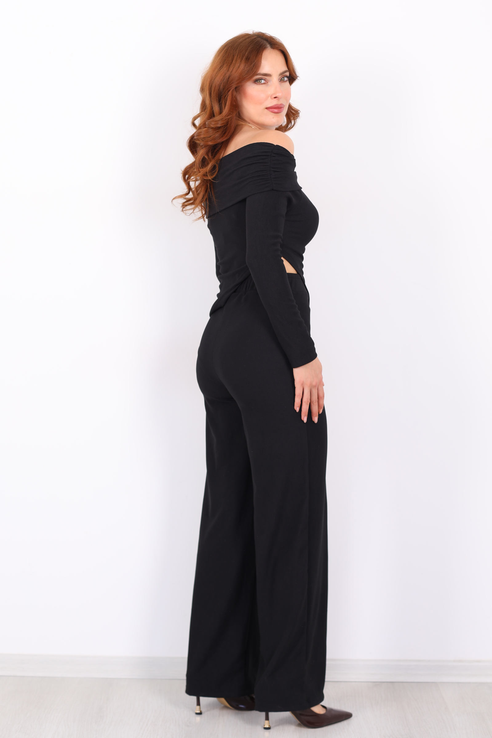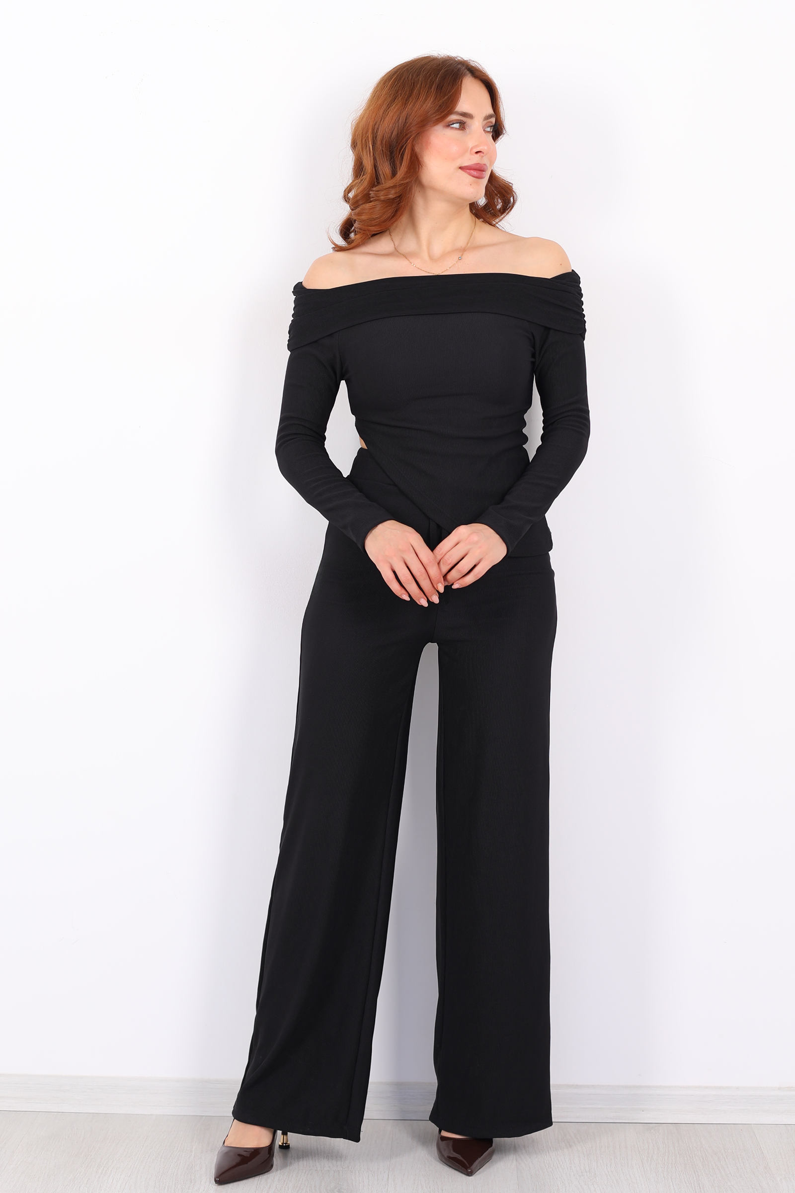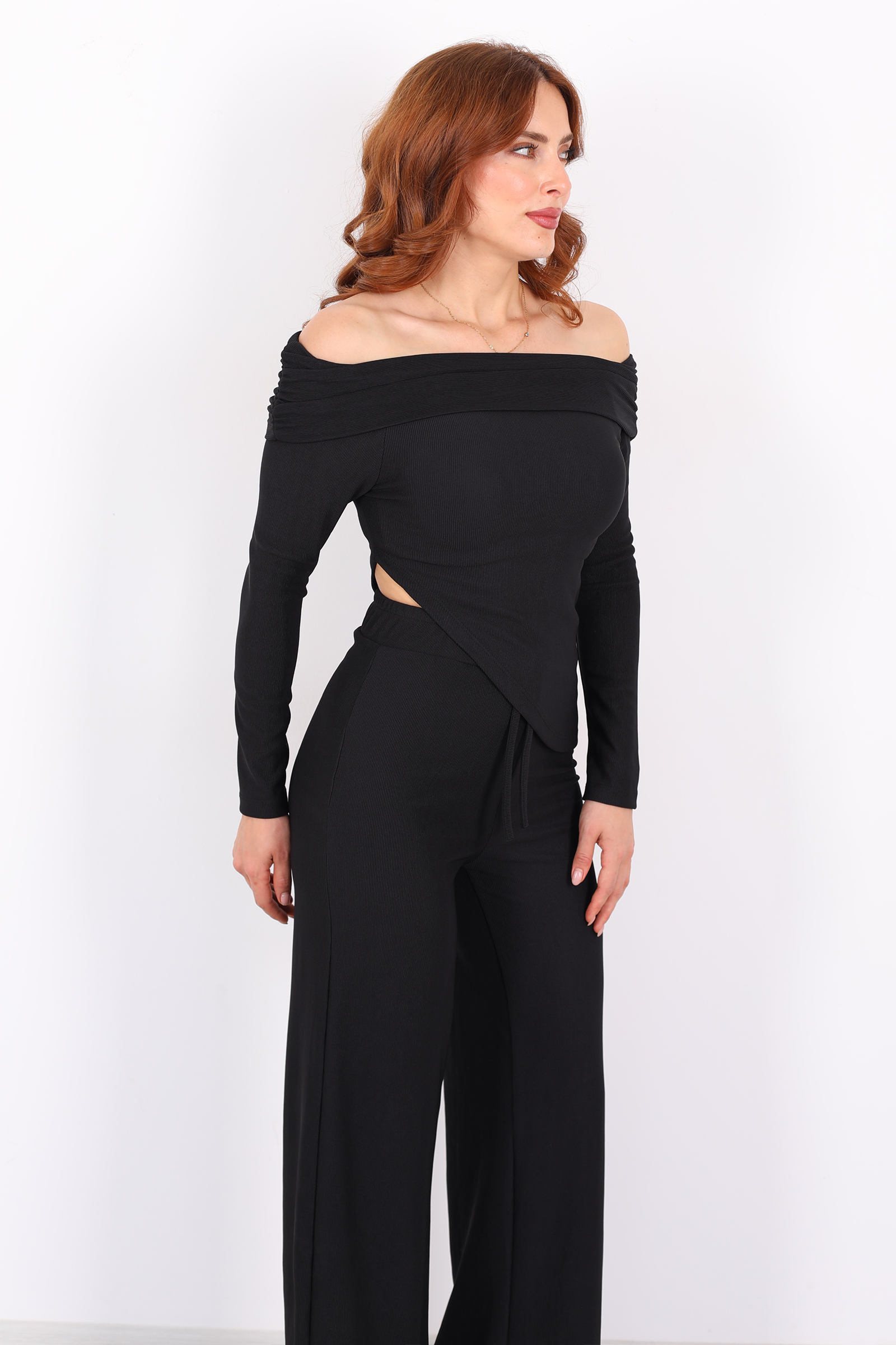 Siyahın zamansız zarafeti ile cesur bir kesimi buluşturan bu takım, Madonna yakasıyla boynunuzu zarifçe vurgularken fitilli kumaşı ve asimetrik hatlarıyla stilinize modern bir duruş katıyor.Madonna yaka detayıyla klasik bir şıklık yaratır. Bu yaka stili, omuz hattını yumuşatarak boyun çizgisine zarif bir vurgu ekler.Takımın pantolonu da siyah tonuyla üst parça ile kusursuz bir uyum sağlar; şık bir formda ve dengeli bir siluet yaratır.