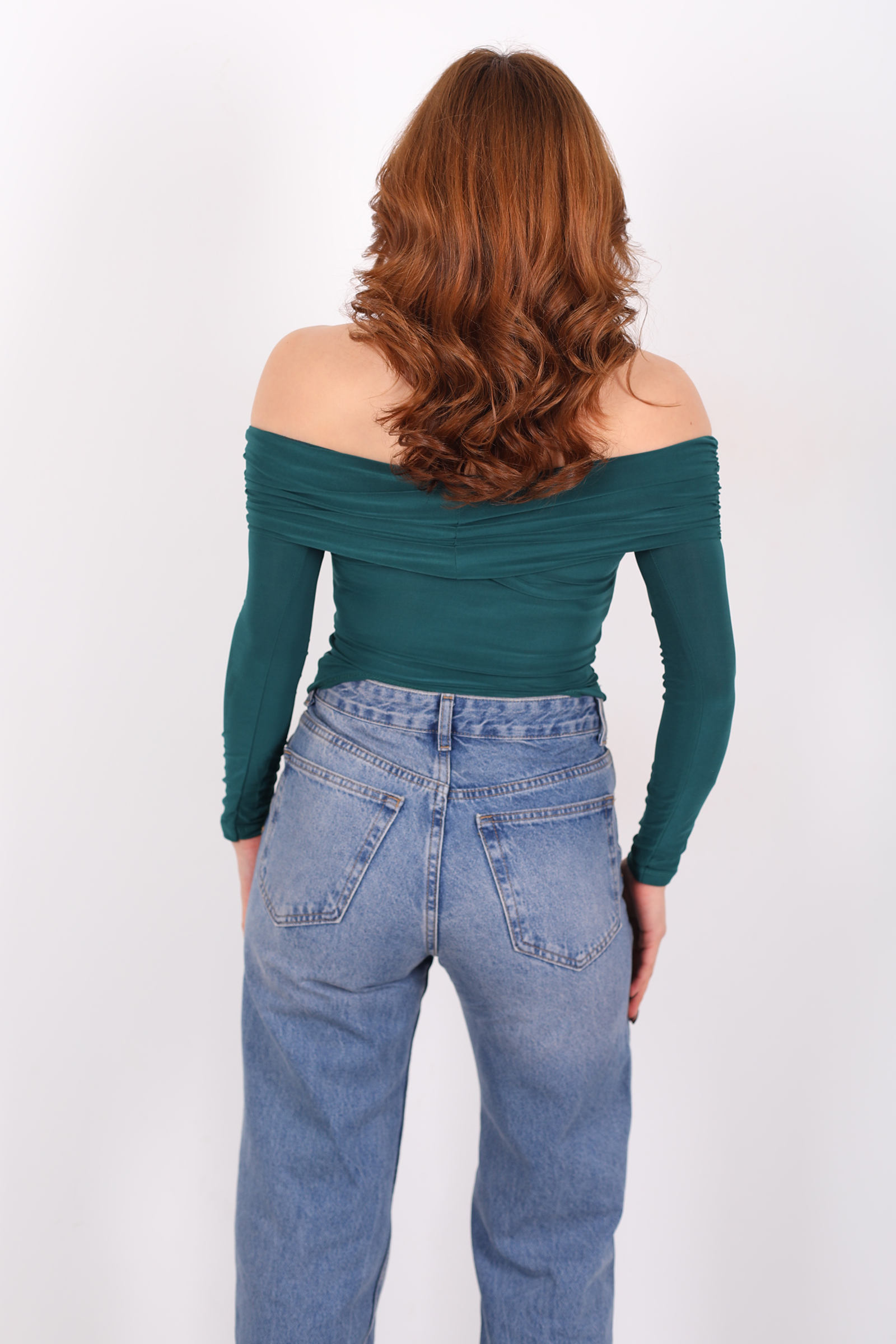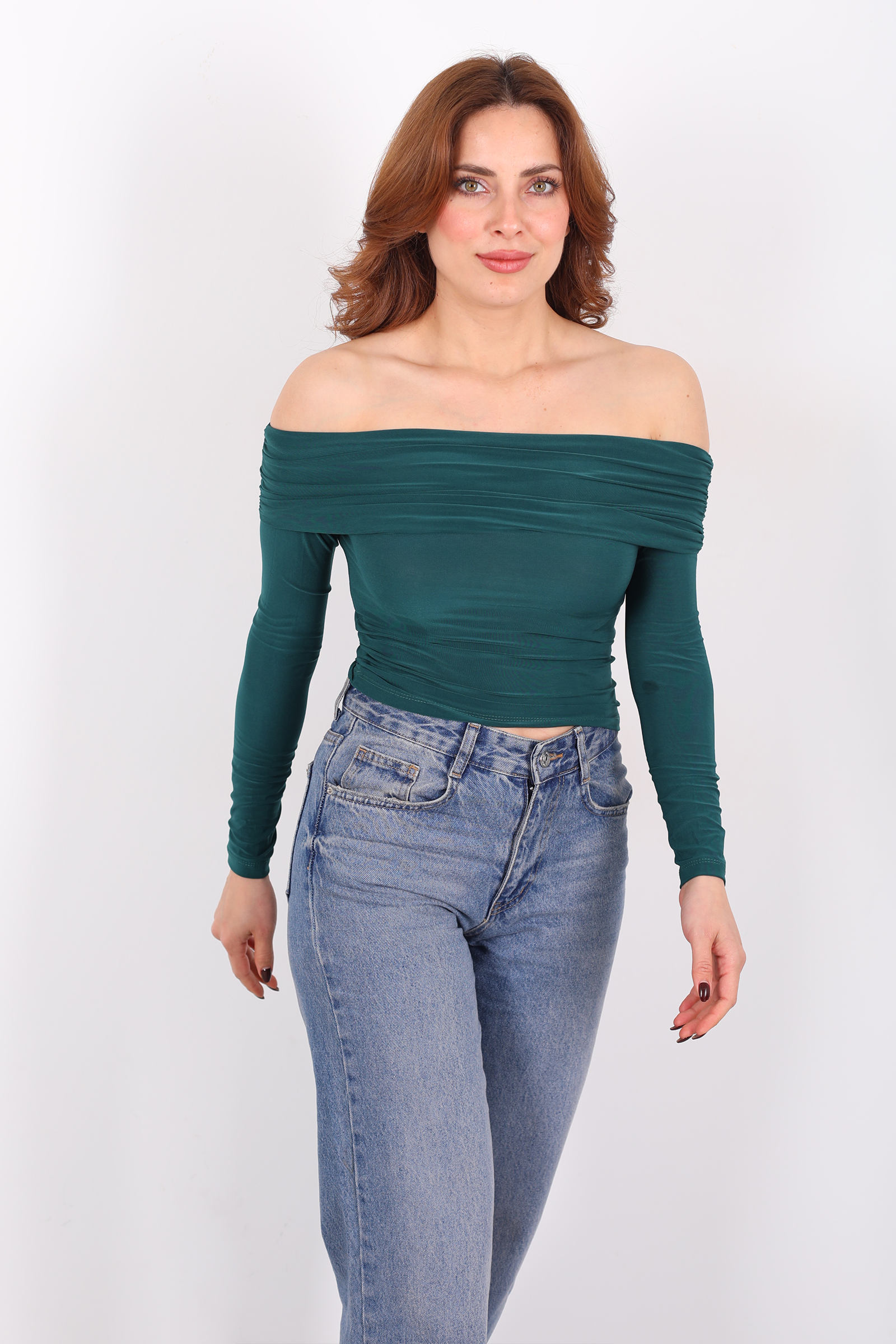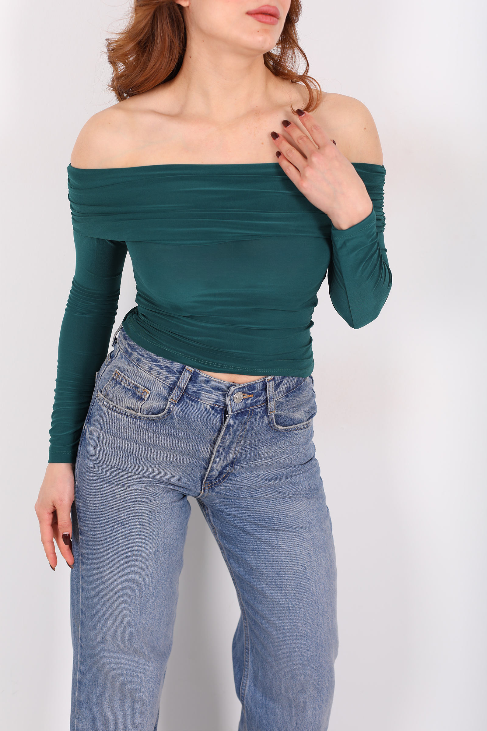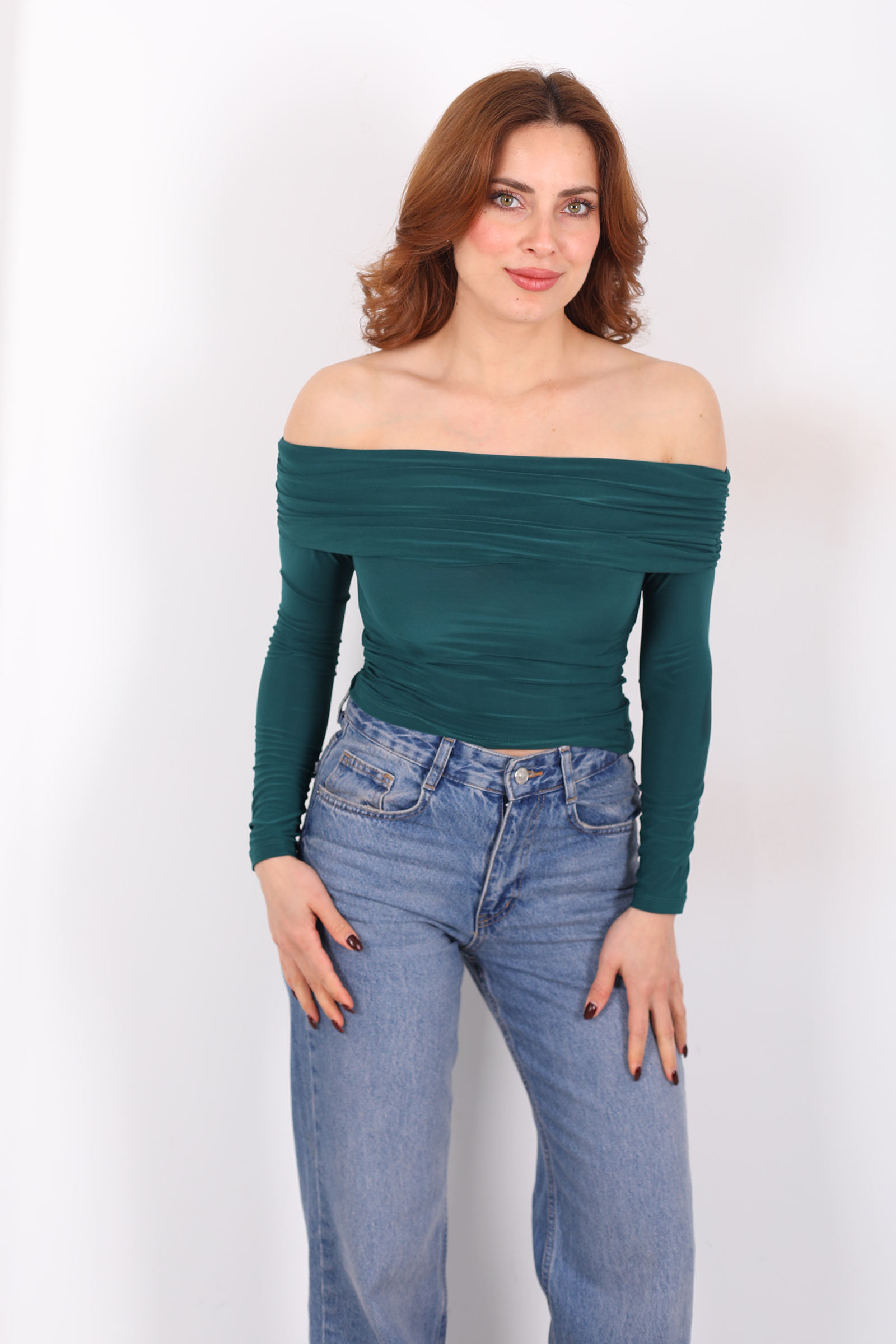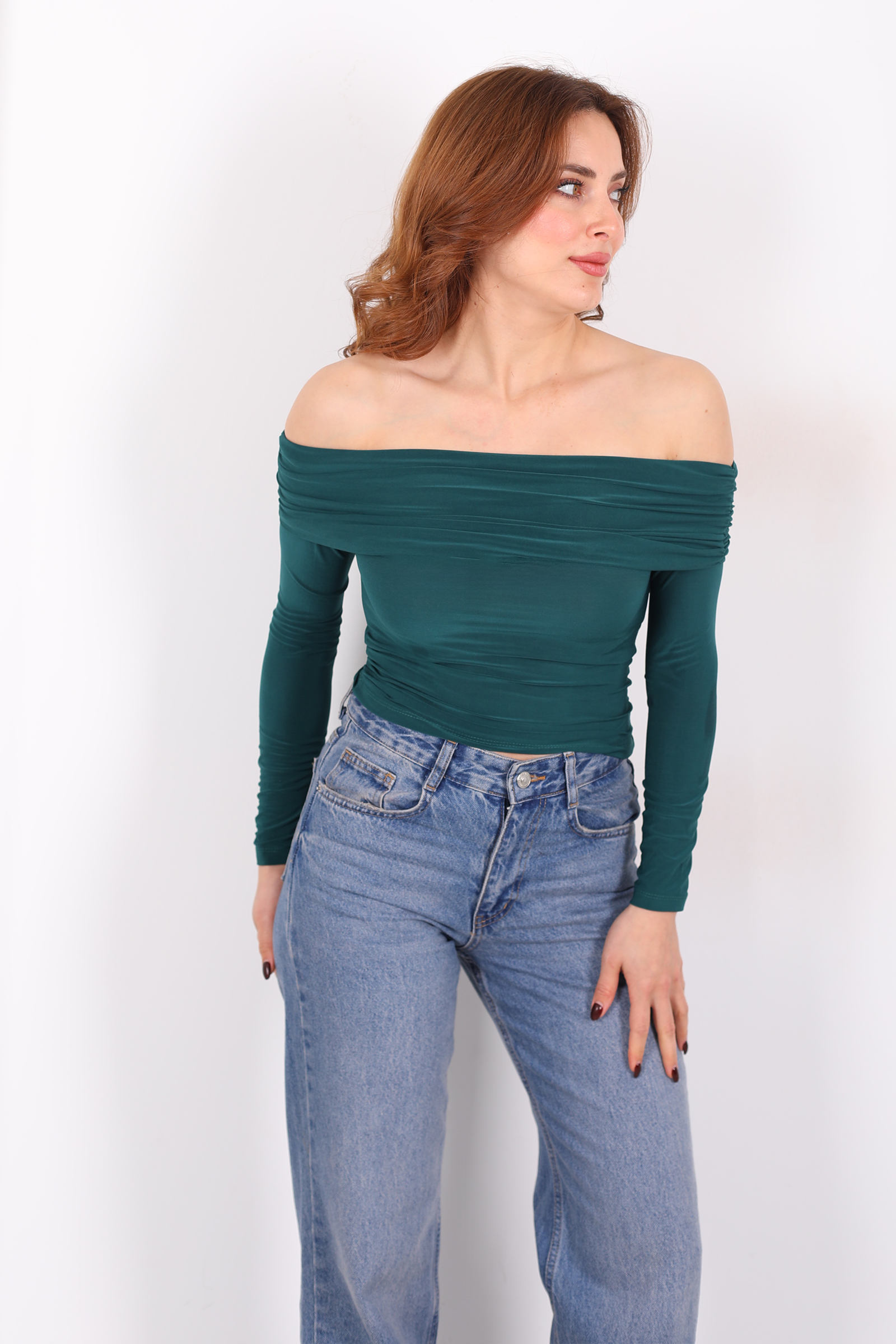 Bir bluz düşün: sade değil, başka bir renkten fışkıran canlı bir ifade taşıyor. Zümrüt yeşili, göz alıcı ama asla agresif olmayan bir derinlik sunar; sanki doğanın sakin ama güçlü tonunu üzerinizde taşırsınız. Madonna yaka kesimi, yüz hattını ön plana çıkarırken bluzun akışkan duruşuna nazik bir çerçeve çizer.