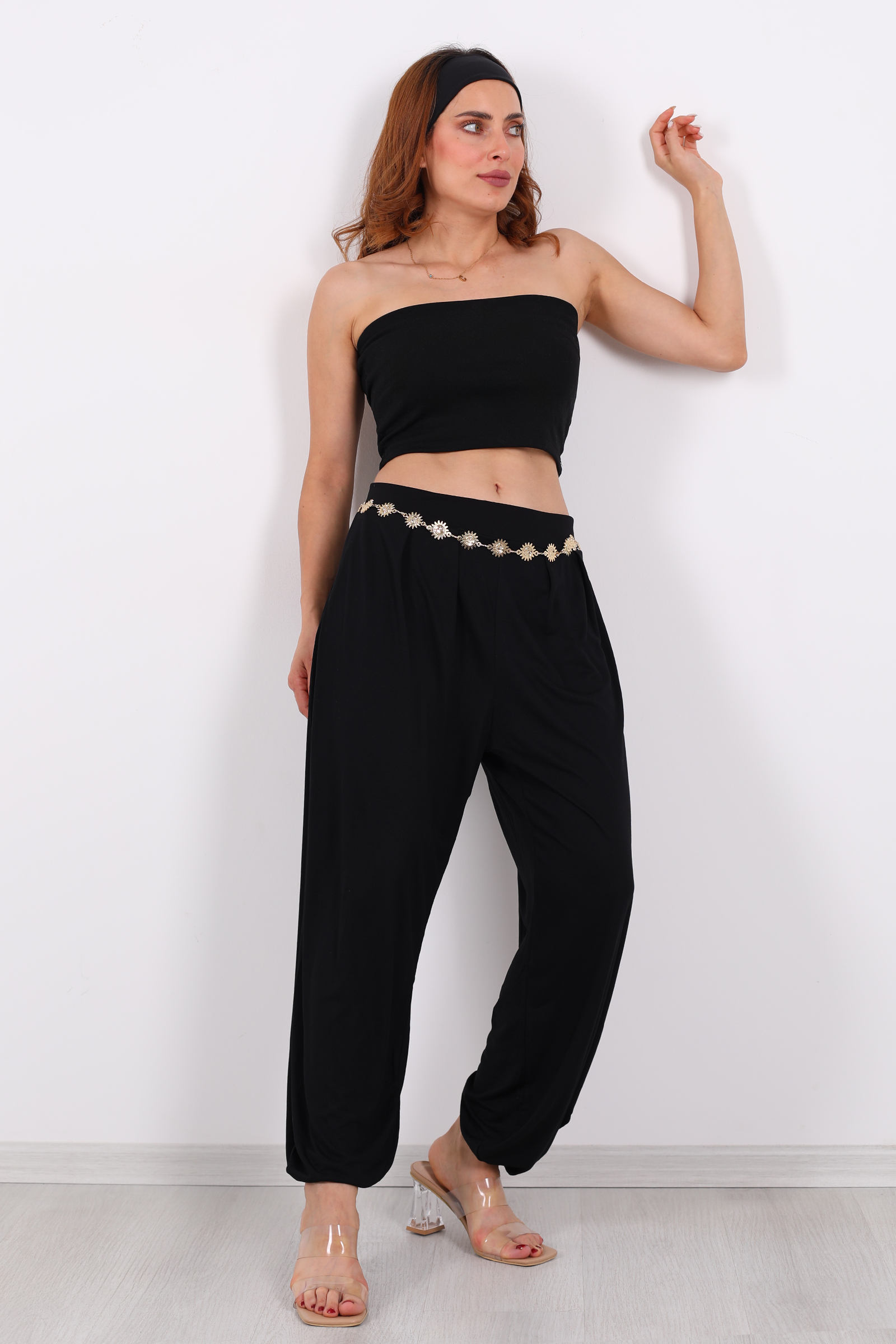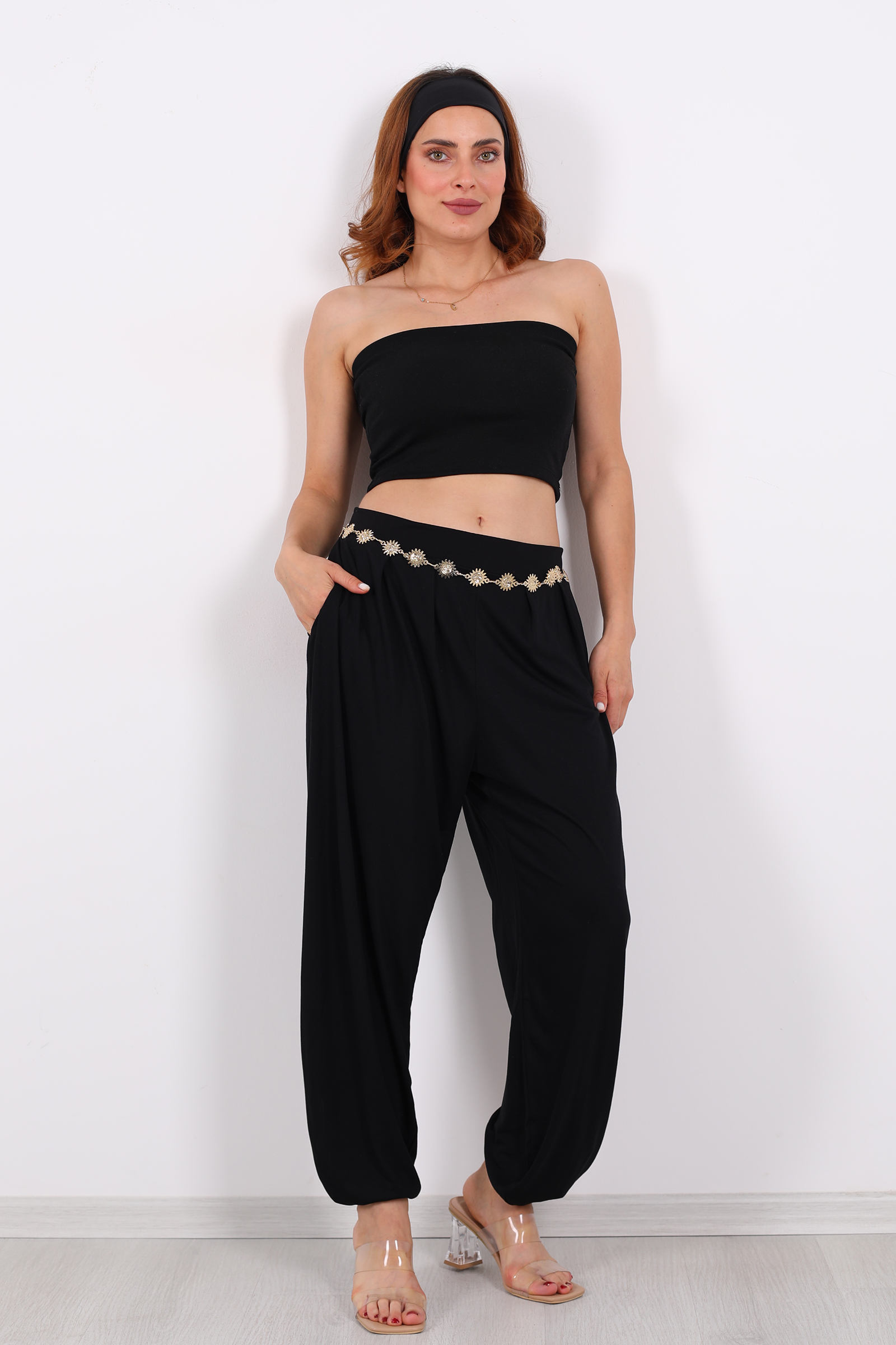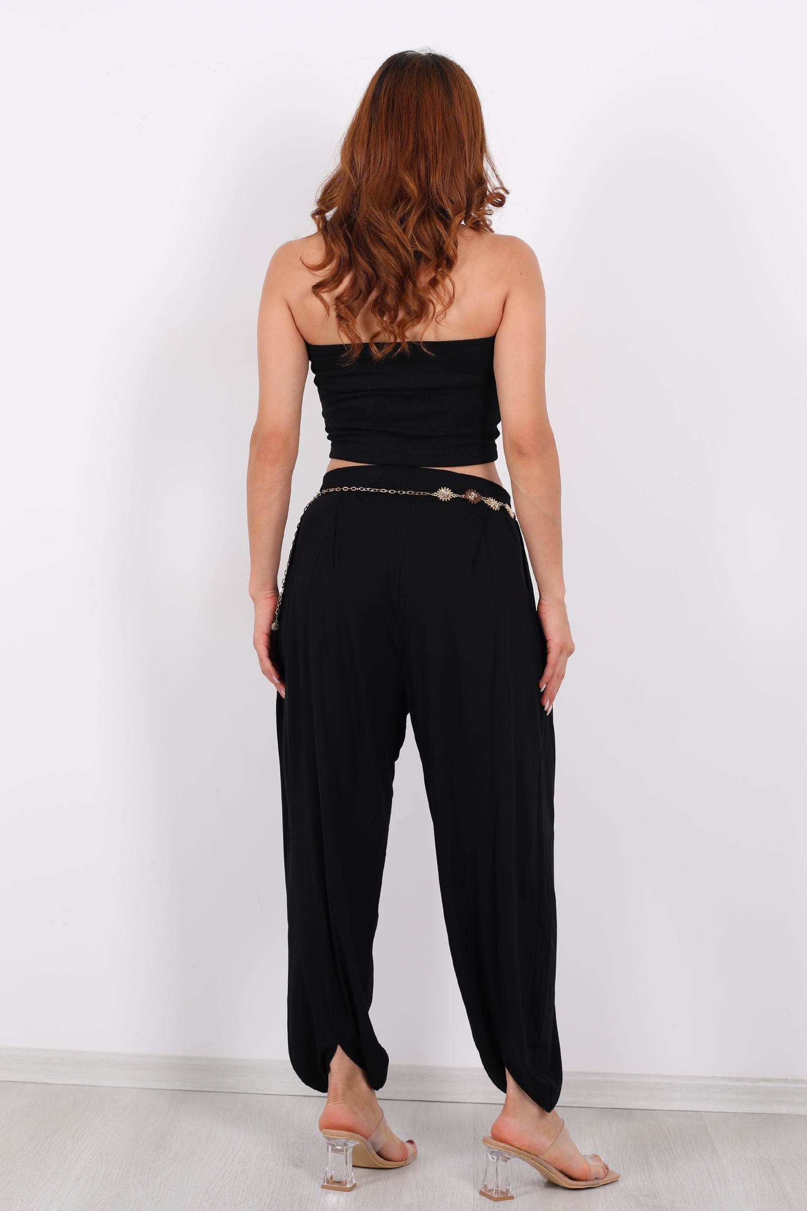 Gardırobumuzun klasikleşmiş parçalarından biri: siyah modal şalvar pantolon. Mükemmel konfor ve zarif sadeliği birleştiren bu model, günlük hareketlerinize ayak uydururken şıklığını da korumak isteyenler için ideal. Siyah rengin asaleti; modal ile birlikte bu pantolonda birleşince, ister evde rahat bir gün geçirin, ister dışarı çıkın her durumda kendinizi hazır hissedeceksiniz.Düşük bel yapısı ve bol paçası sayesinde vücuda baskı yapmaz; modal‑karışımı kumaş hafifçe esnek yapısıyla gün boyu rahatlık sunar.