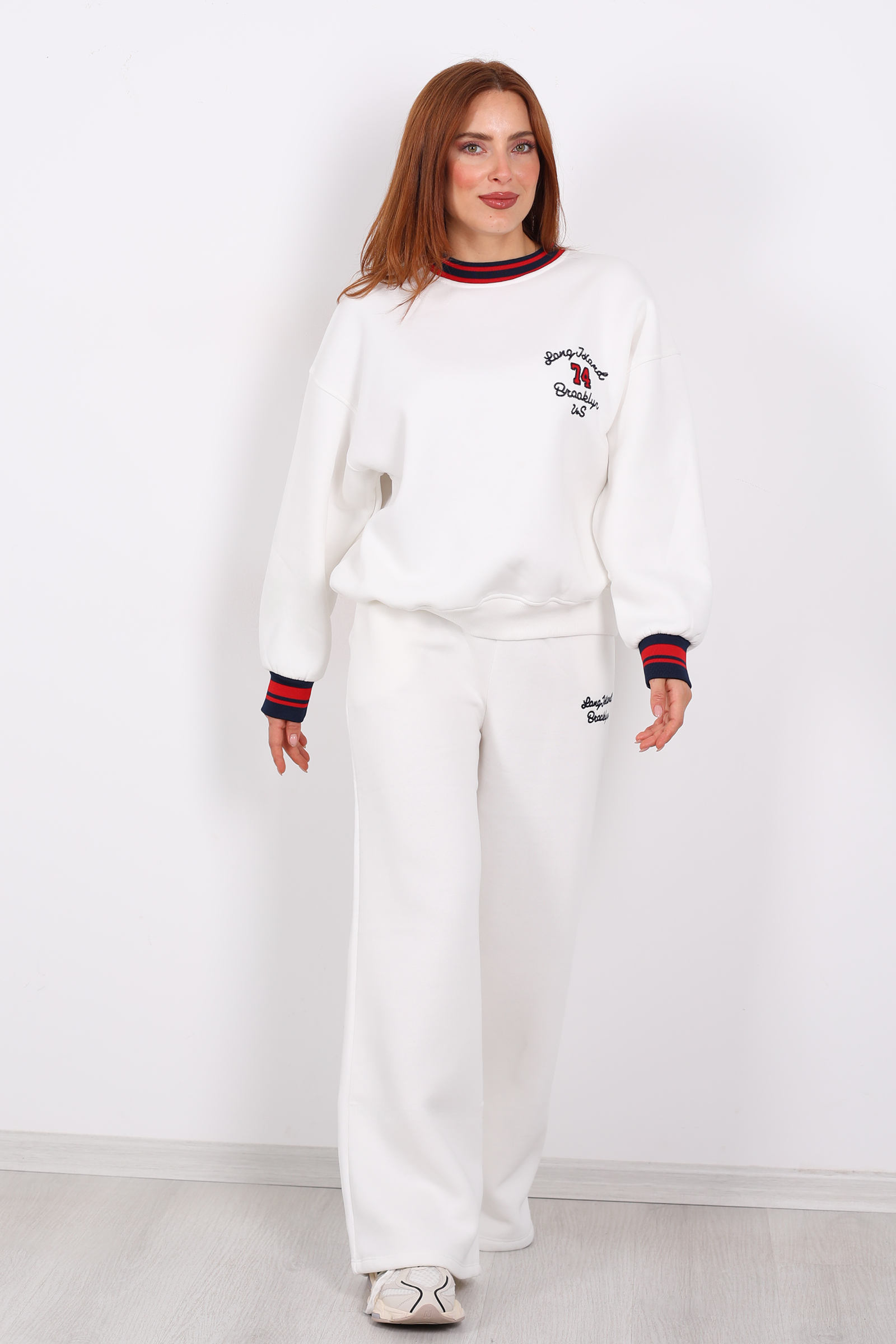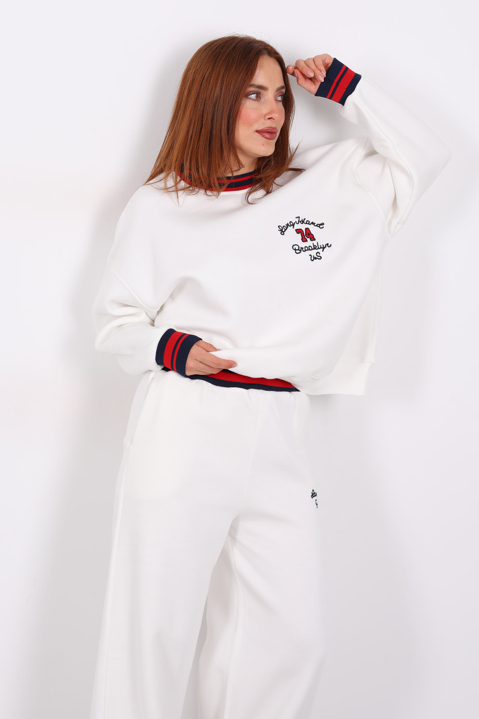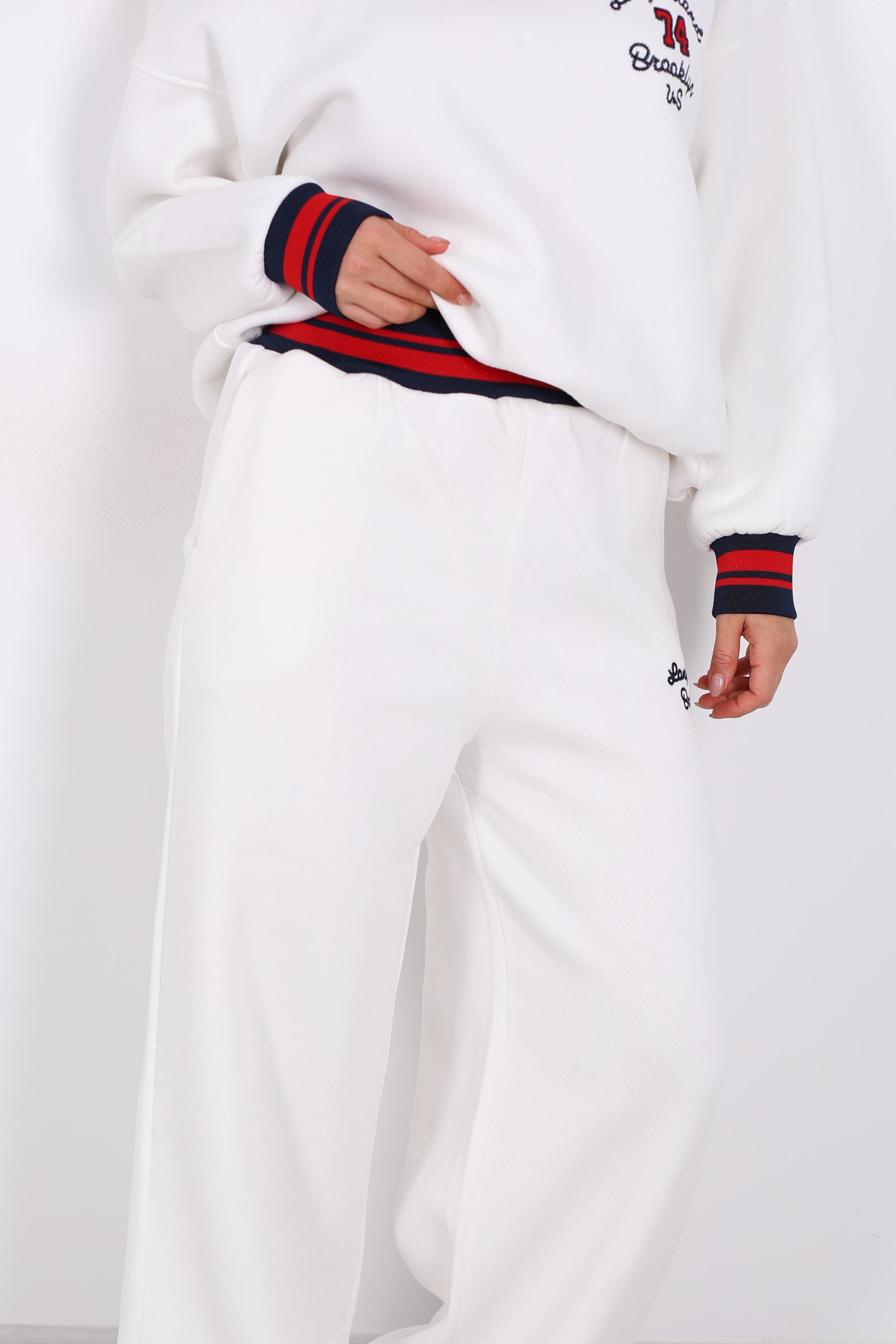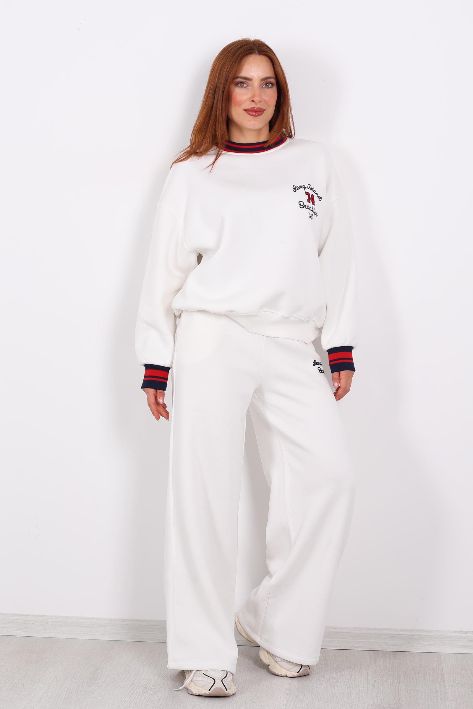 Saf beyaz tonuyla zarifliği yansıtan bu üç parçalı kadın takımı, hem nakış detayları hem bol paça kesimiyle stilinize sofistike bir dokunuş katıyor. Üç iplik dokusu, kumaşa dayanıklılık kazandırırken aynı zamanda yumuşak bir his sunar. Nakışlı işleme, takımın sade duruşuna feminen bir zarafet ekleyerek her açıdan dikkat çekici bir parça haline getiriyor.