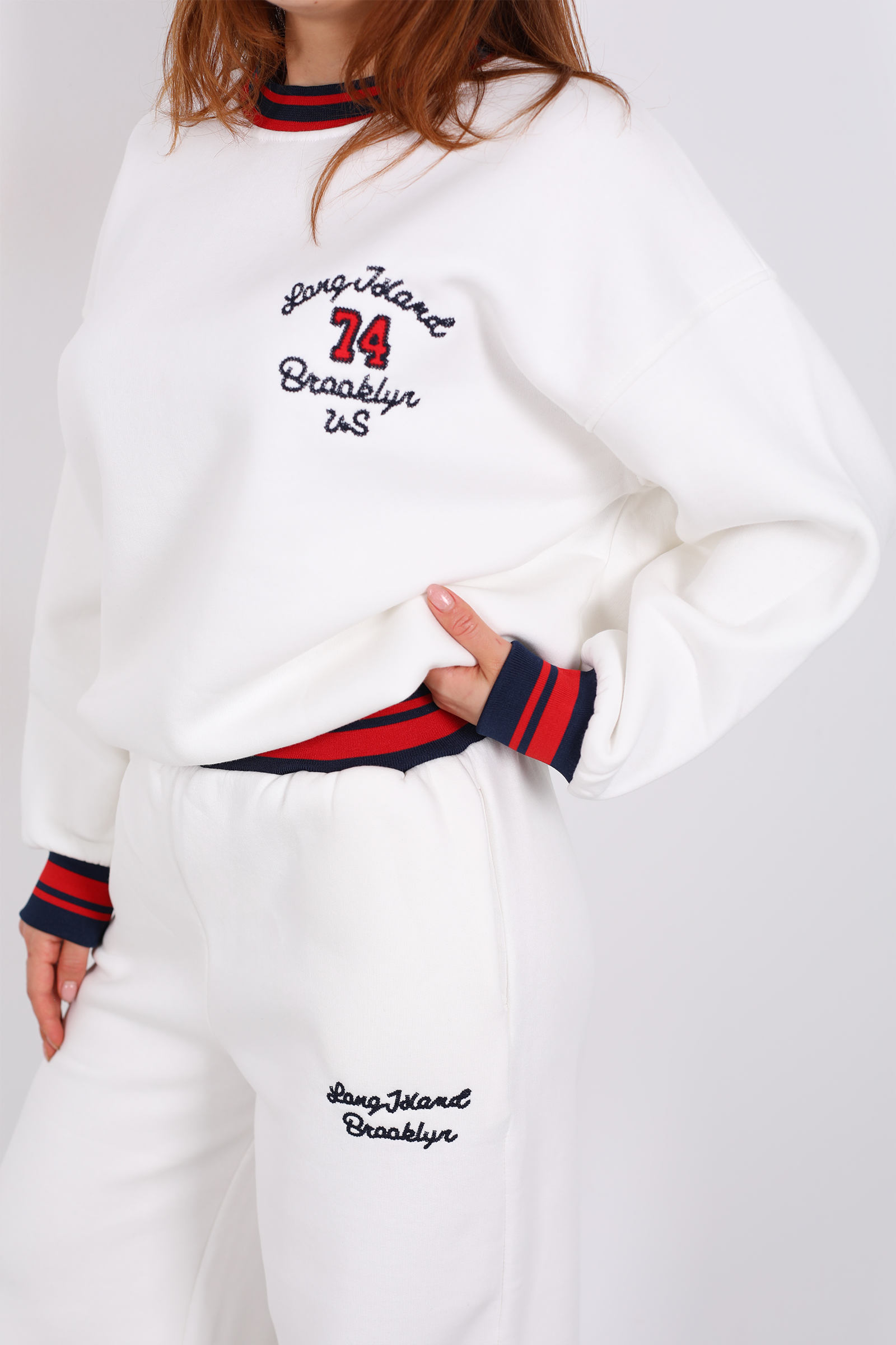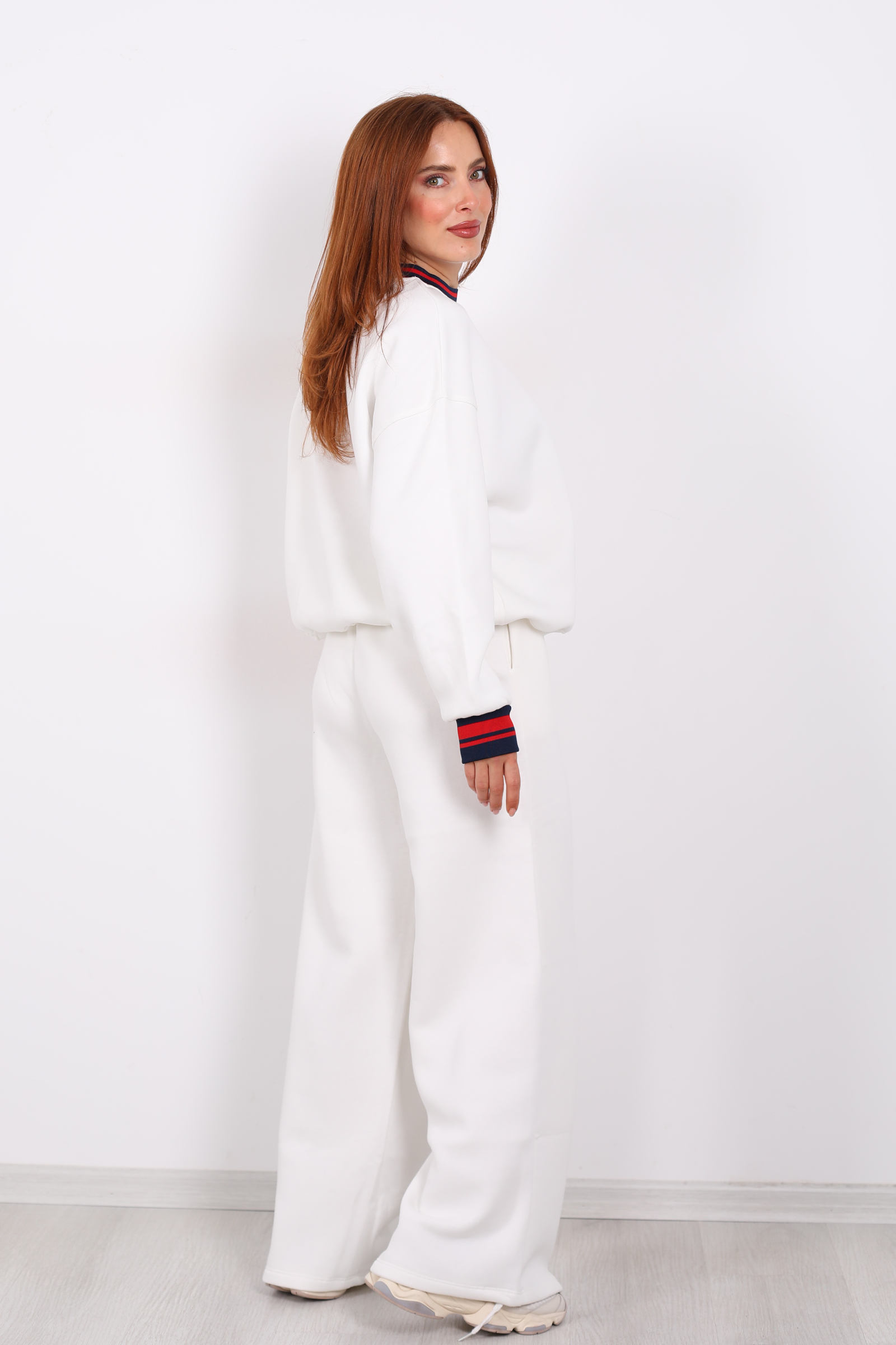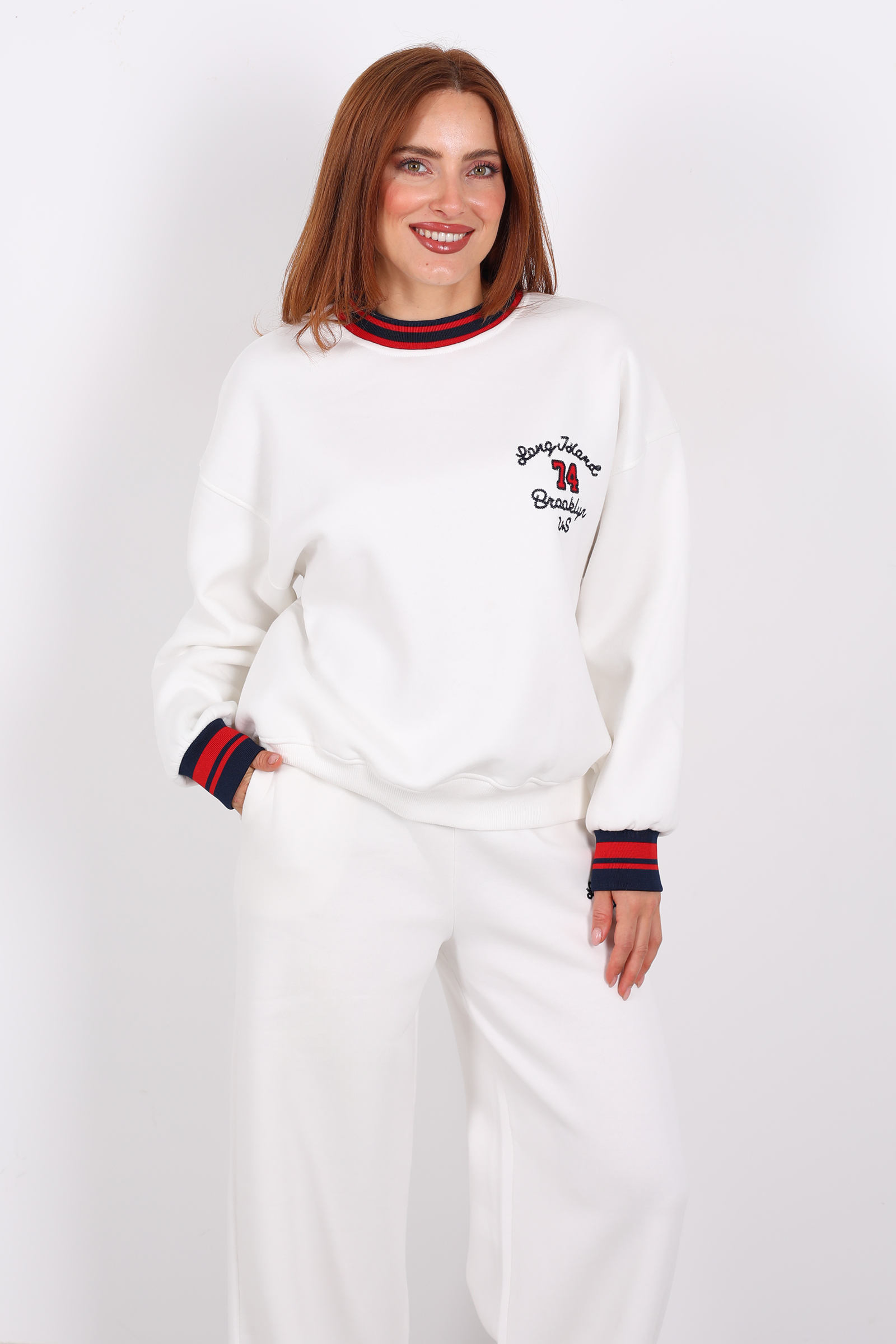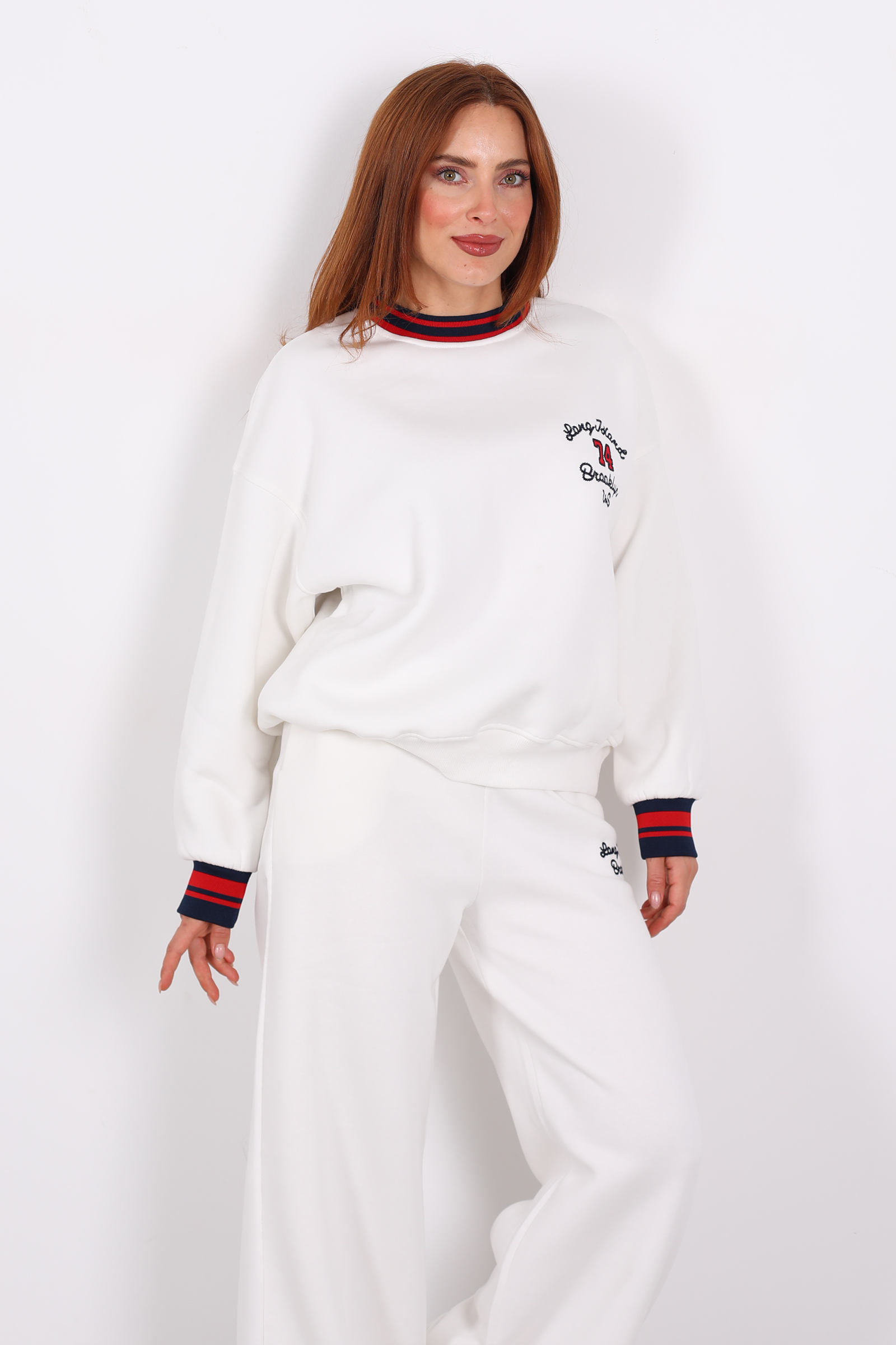Saf beyaz tonuyla zarifliği yansıtan bu üç parçalı kadın takımı, hem nakış detayları hem bol paça kesimiyle stilinize sofistike bir dokunuş katıyor. Üç iplik dokusu, kumaşa dayanıklılık kazandırırken aynı zamanda yumuşak bir his sunar. Nakışlı işleme, takımın sade duruşuna feminen bir zarafet ekleyerek her açıdan dikkat çekici bir parça haline getiriyor.