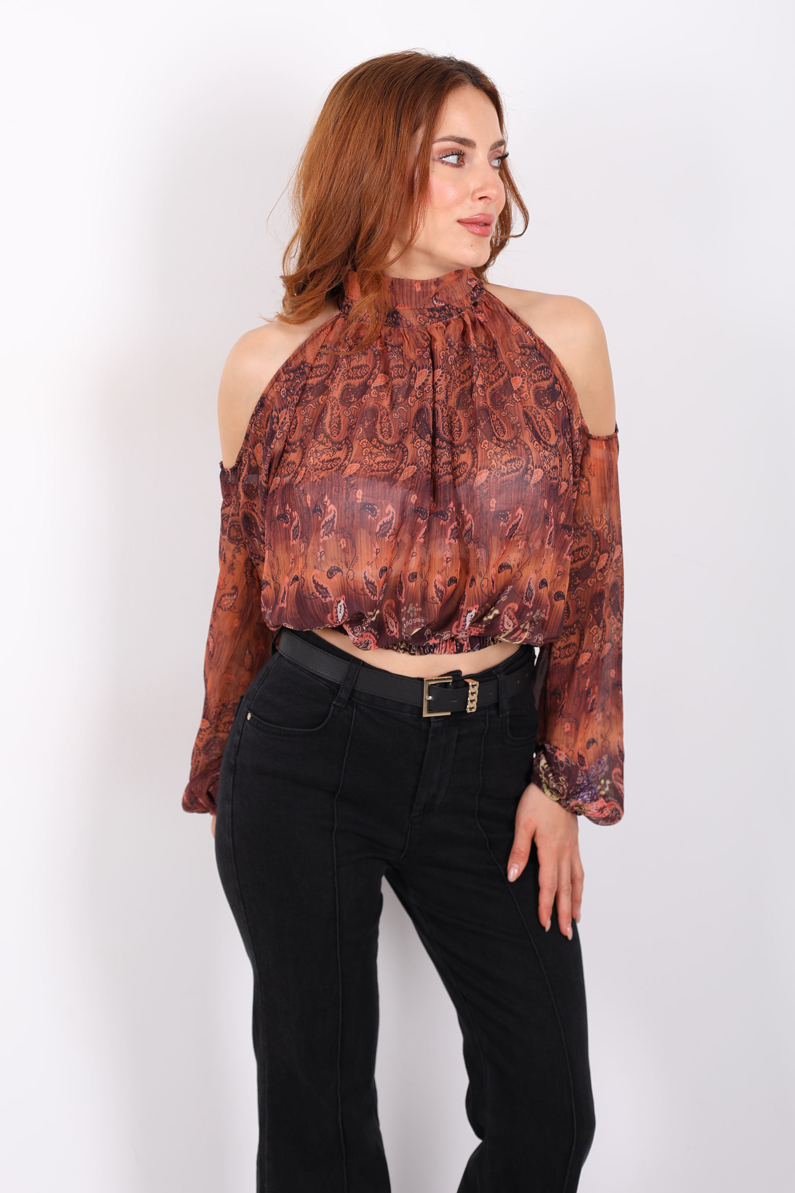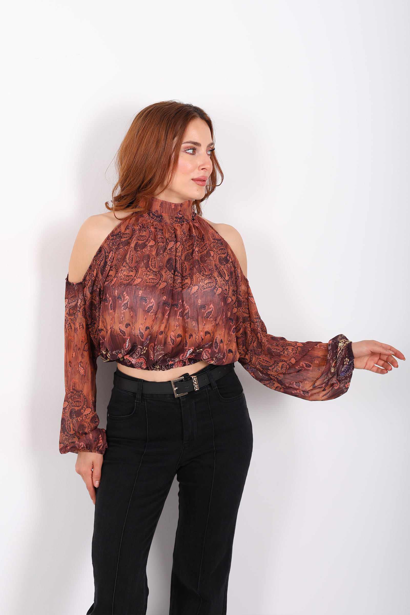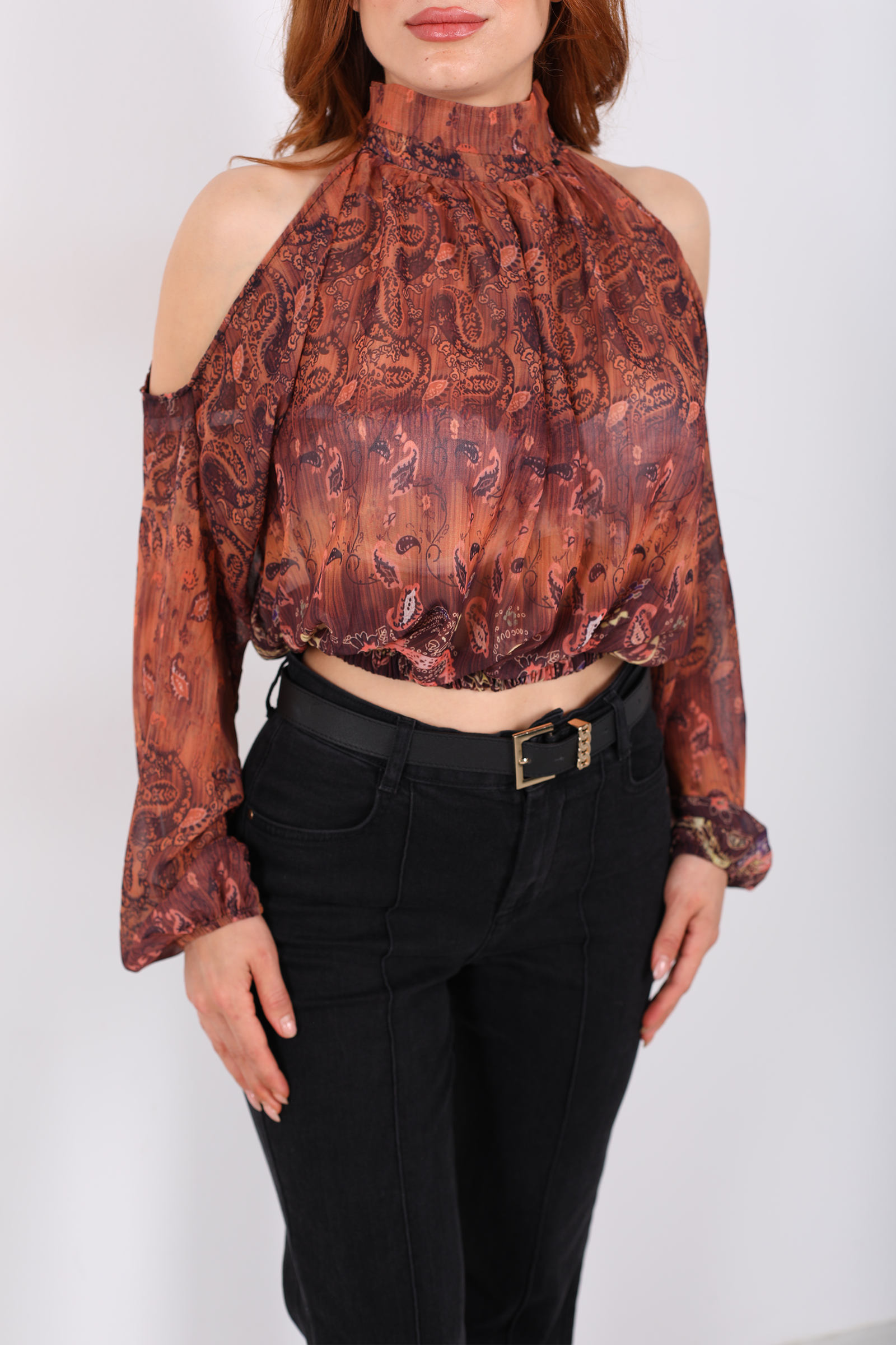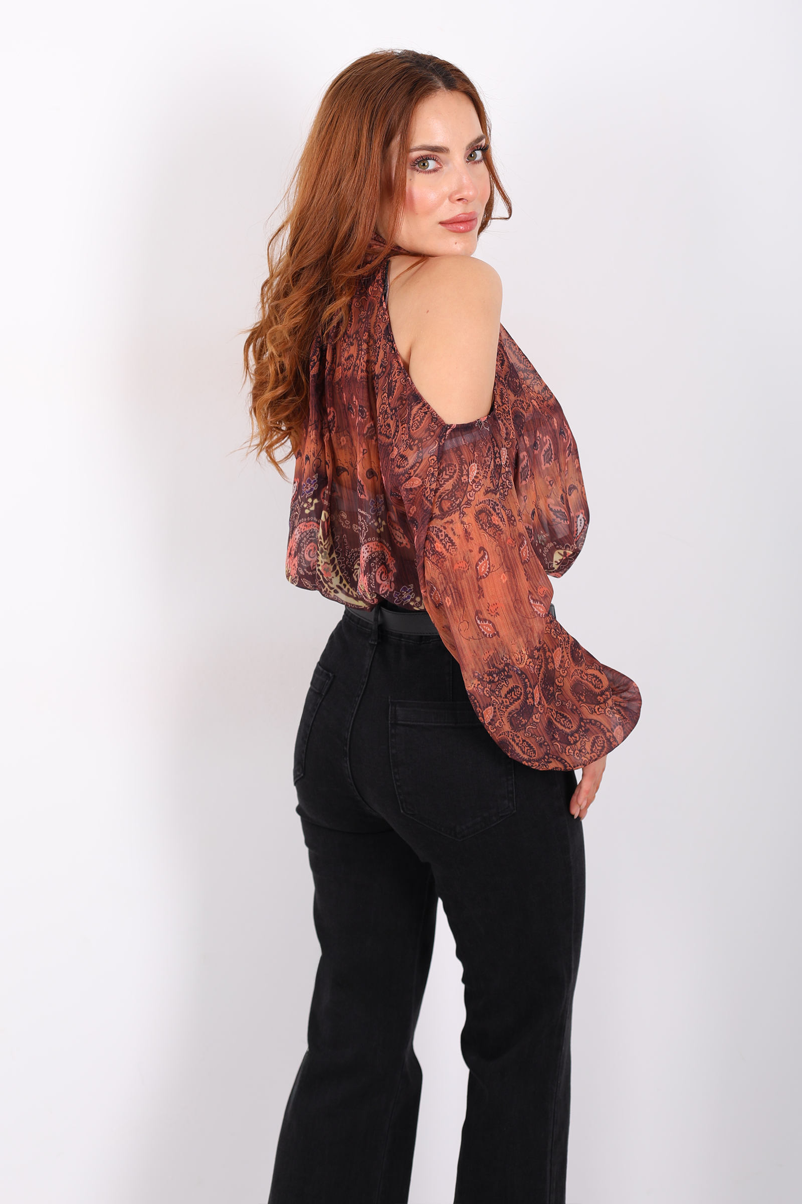 Omuz Açık Desenli Şifon Kahverengi Kadın Bluz