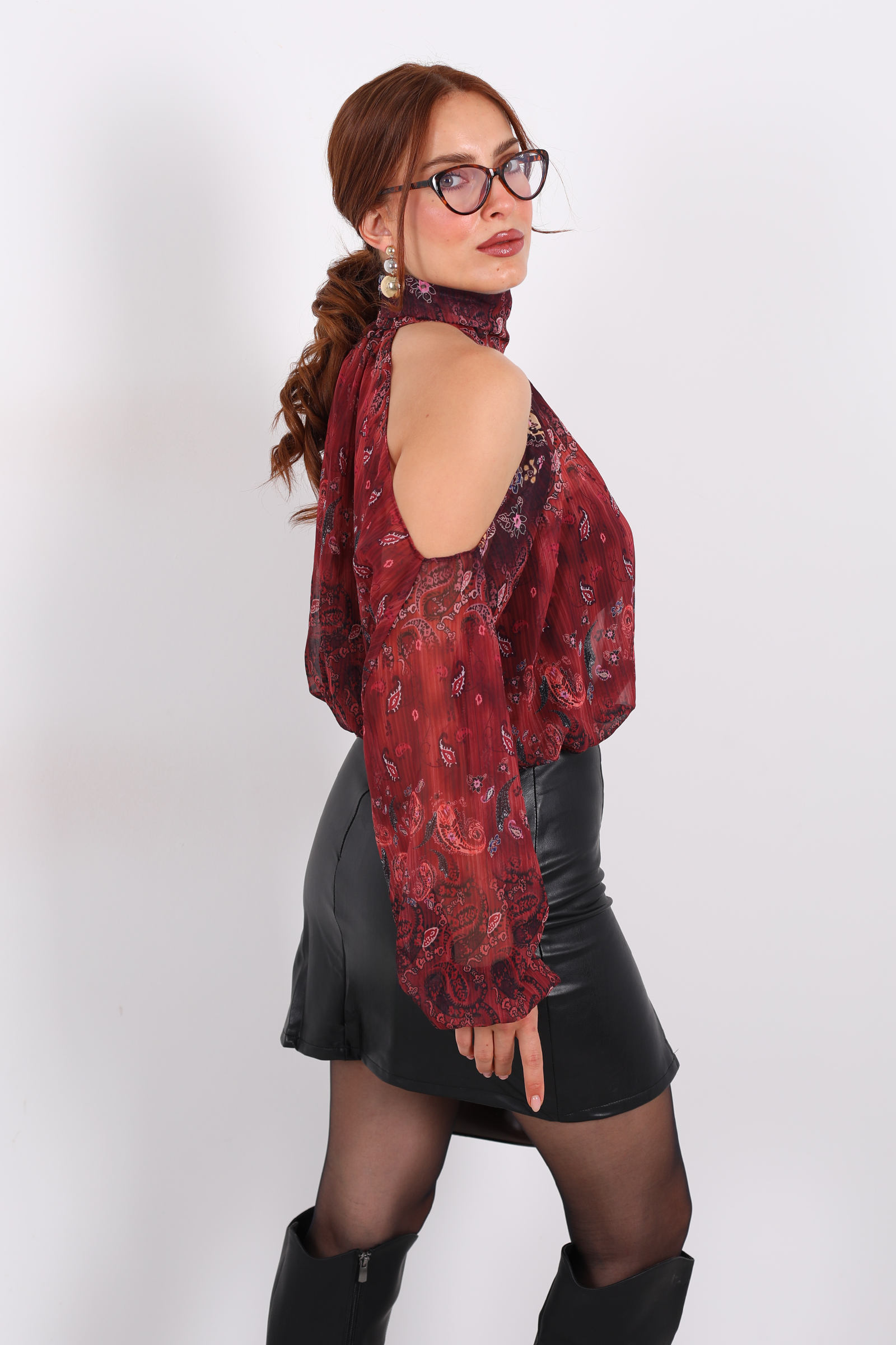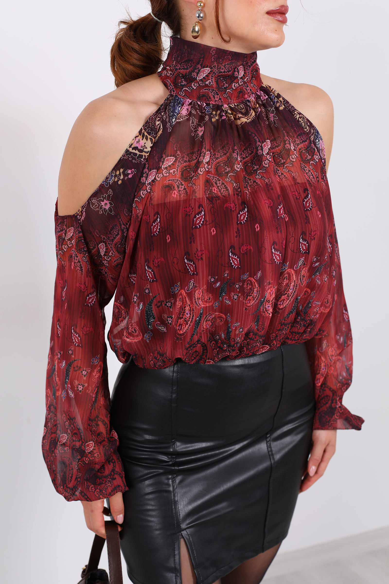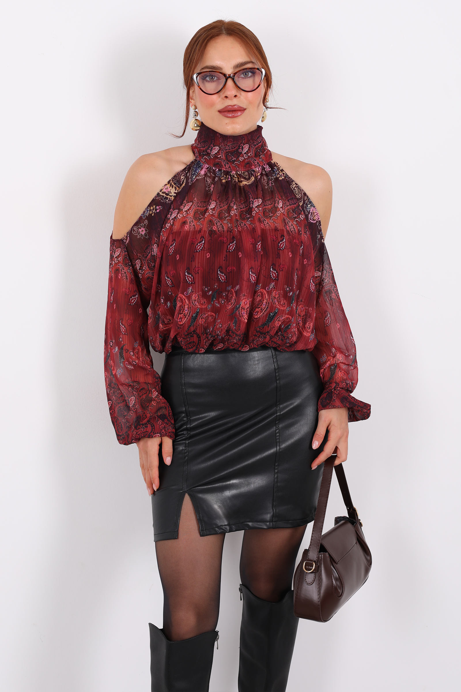 Bu omuzları açık ve desenli şifon murdüm bluz, zarafeti ve romantik dokusuyla stilinize hafif bir büyü katıyor. Şifonun uçuş uçuş yapısı, her hareketinizde akıcı ve zarif bir siluet oluştururken, murdüm tonunun derinliği feminen bir hava yaratıyor.Kombin önerisi olarak; bu bluzu krem veya bej tonlarında yüksek bel pantolon ve nude topuklularla birlikte kullanarak zarif bir gündüz‑görünümü oluşturabilirsiniz. Alternatif olarak, siyah deri etek ve zarif sandaletle geceye geçiş yaparak şık ve dikkat çekici bir stil yakalayabilirsiniz.