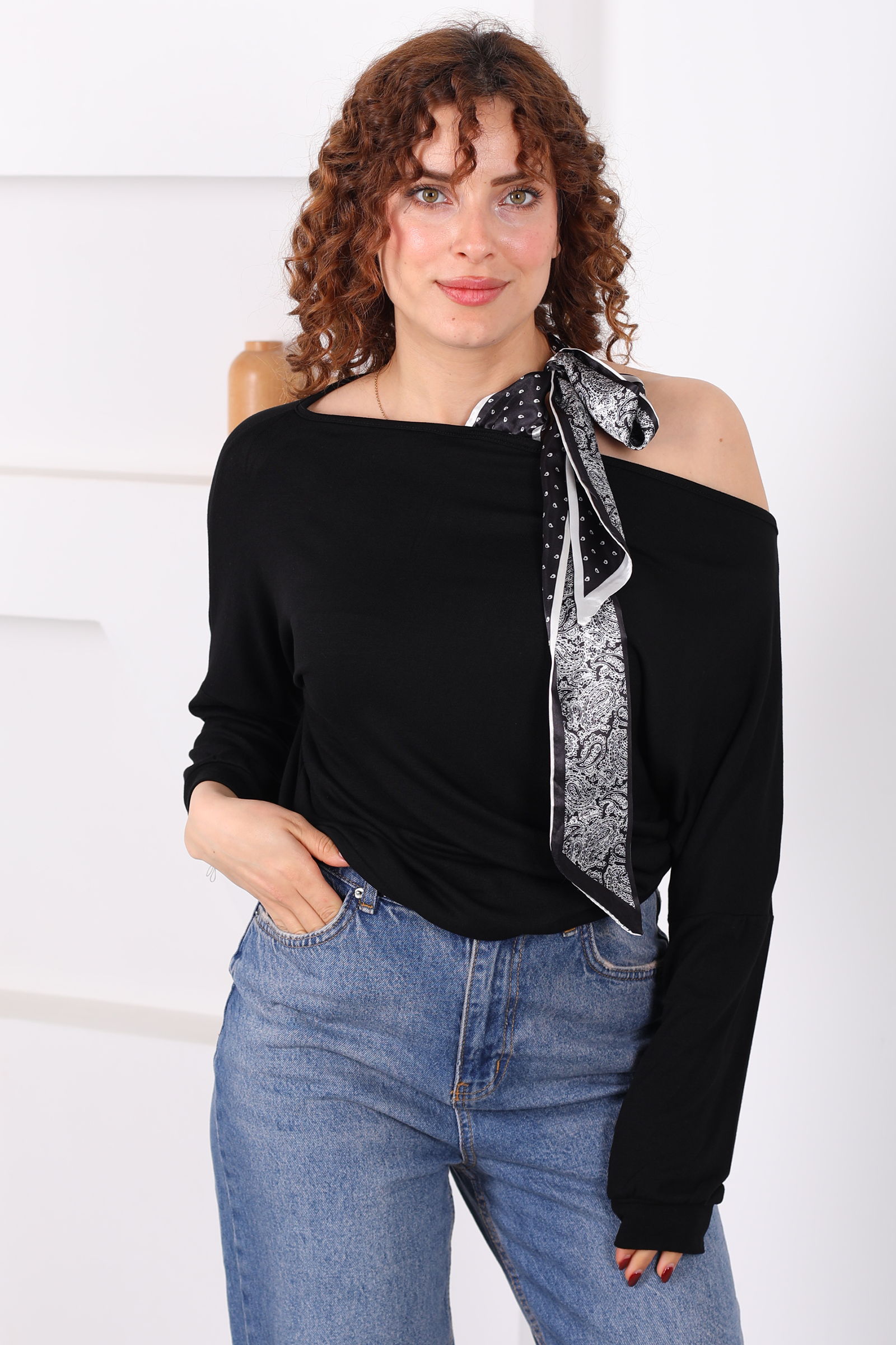 Omuz Açık Şal Bağlamalı Oversize Siyah Kadın Bluz