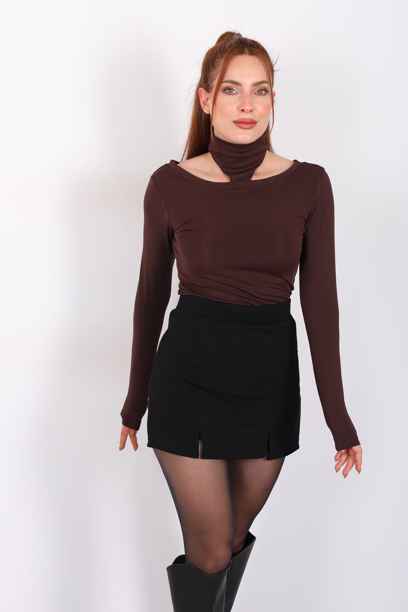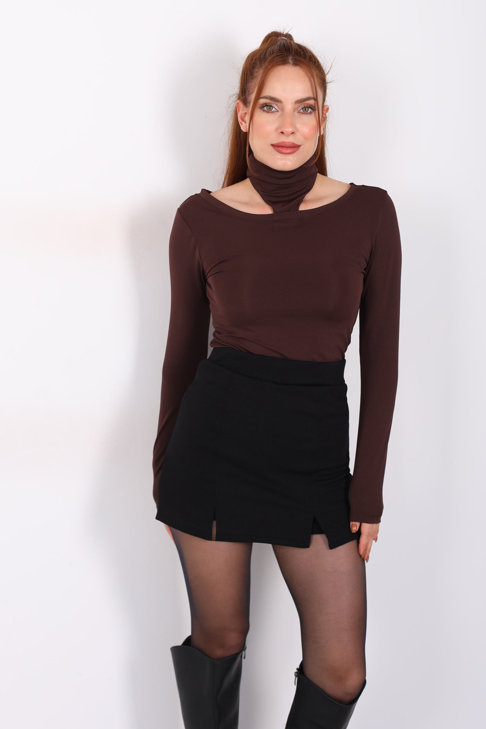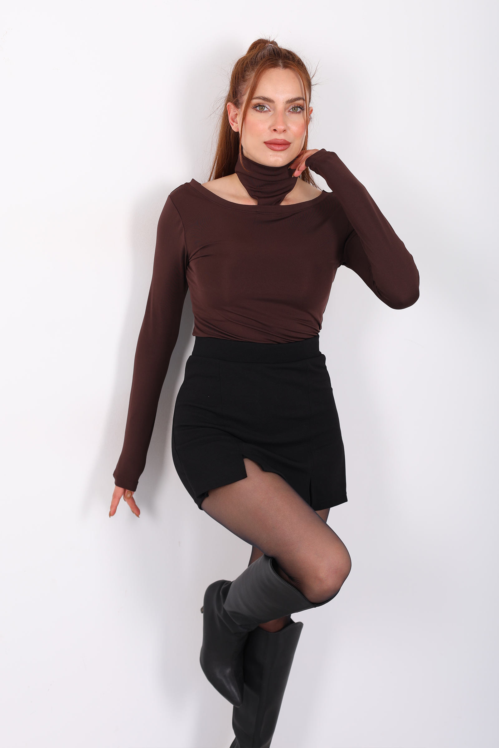 Omuzları Açık Boyundan Geçirmeli Kahverengi Kadın Bluz