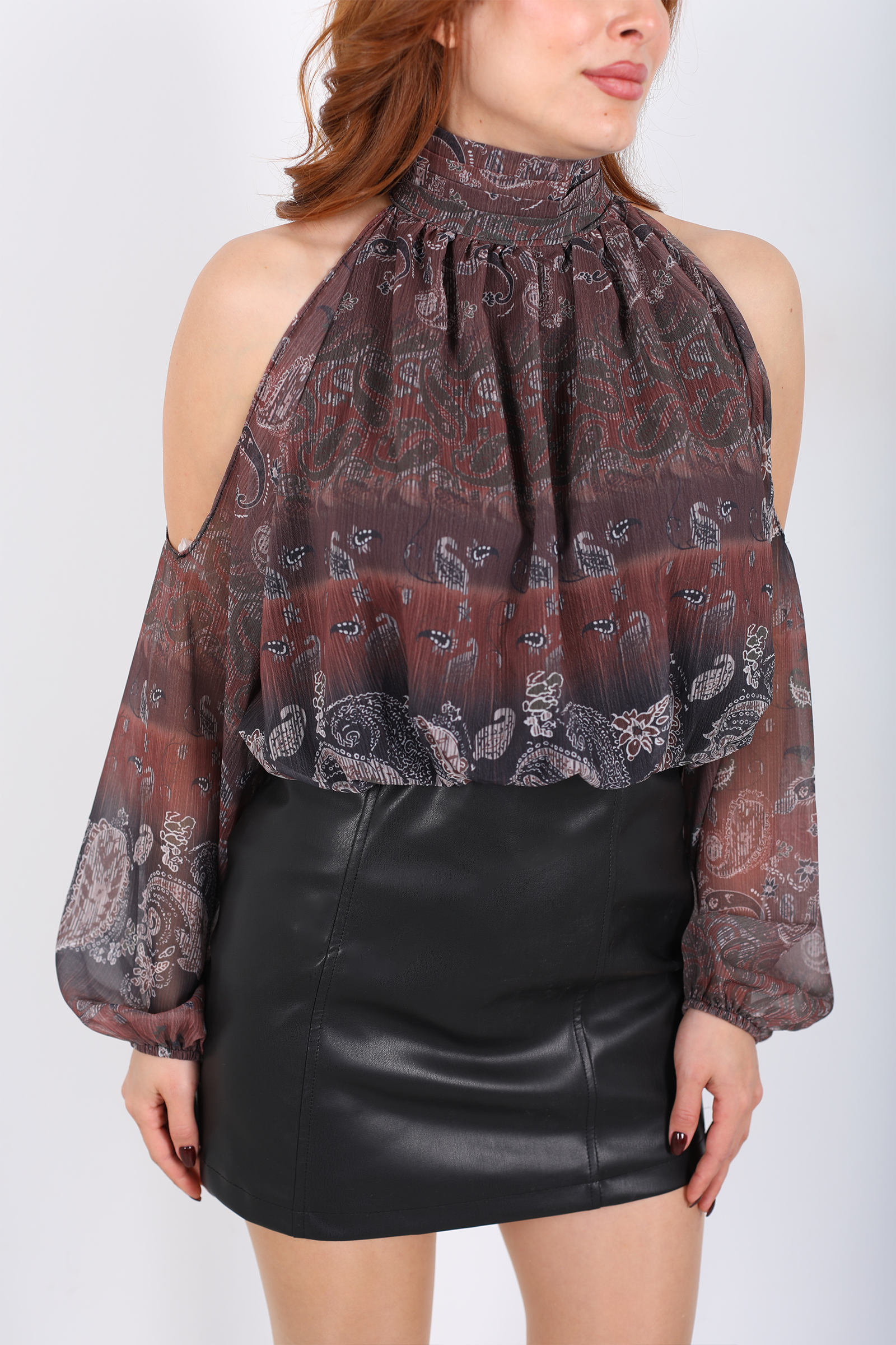 Omuzları Açık Desenli Acı Kahve Kadın Şifon Bluz