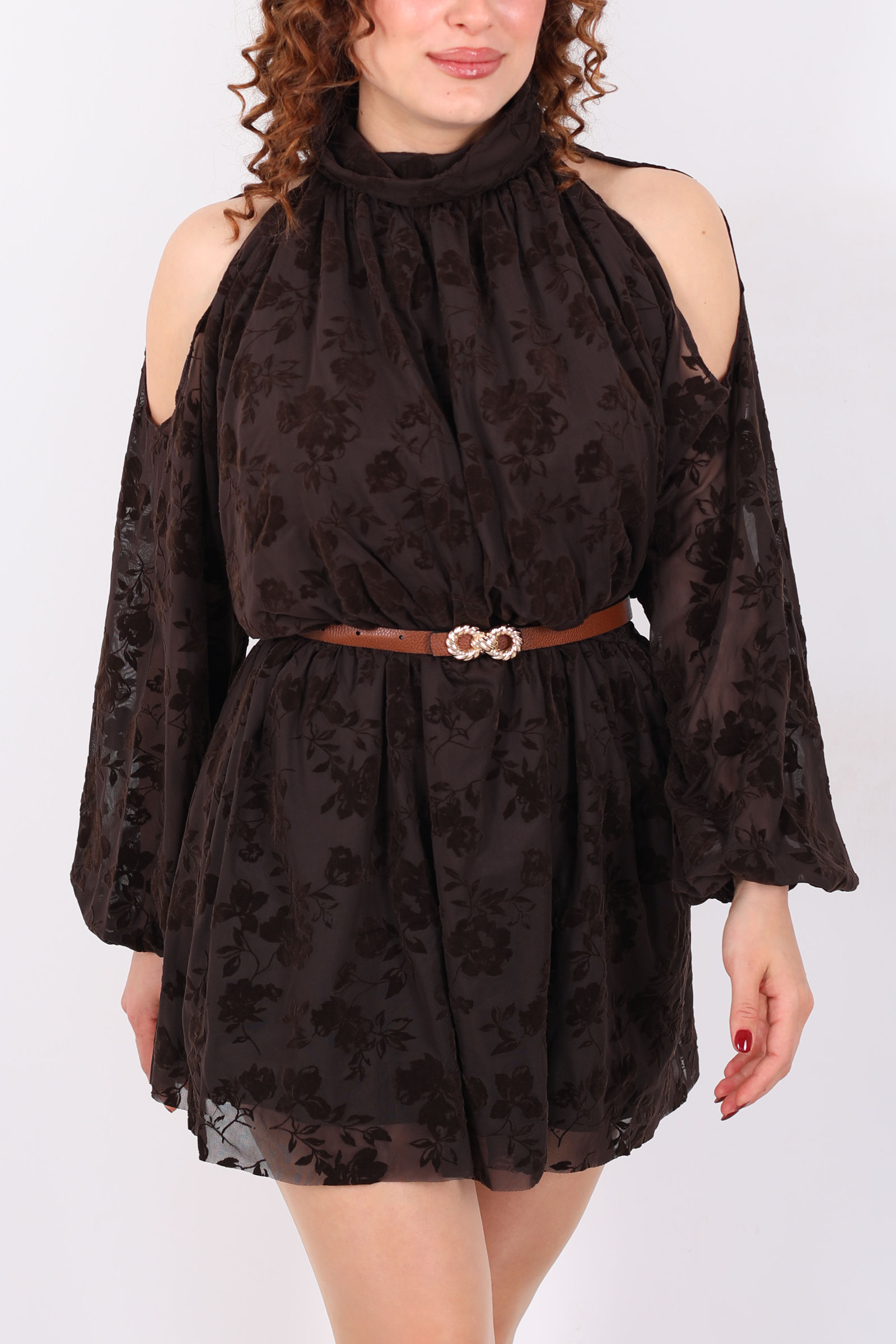 Omuzları Açık Kadife Baskılı Kadın Kahverengi Mini Tül Elbise