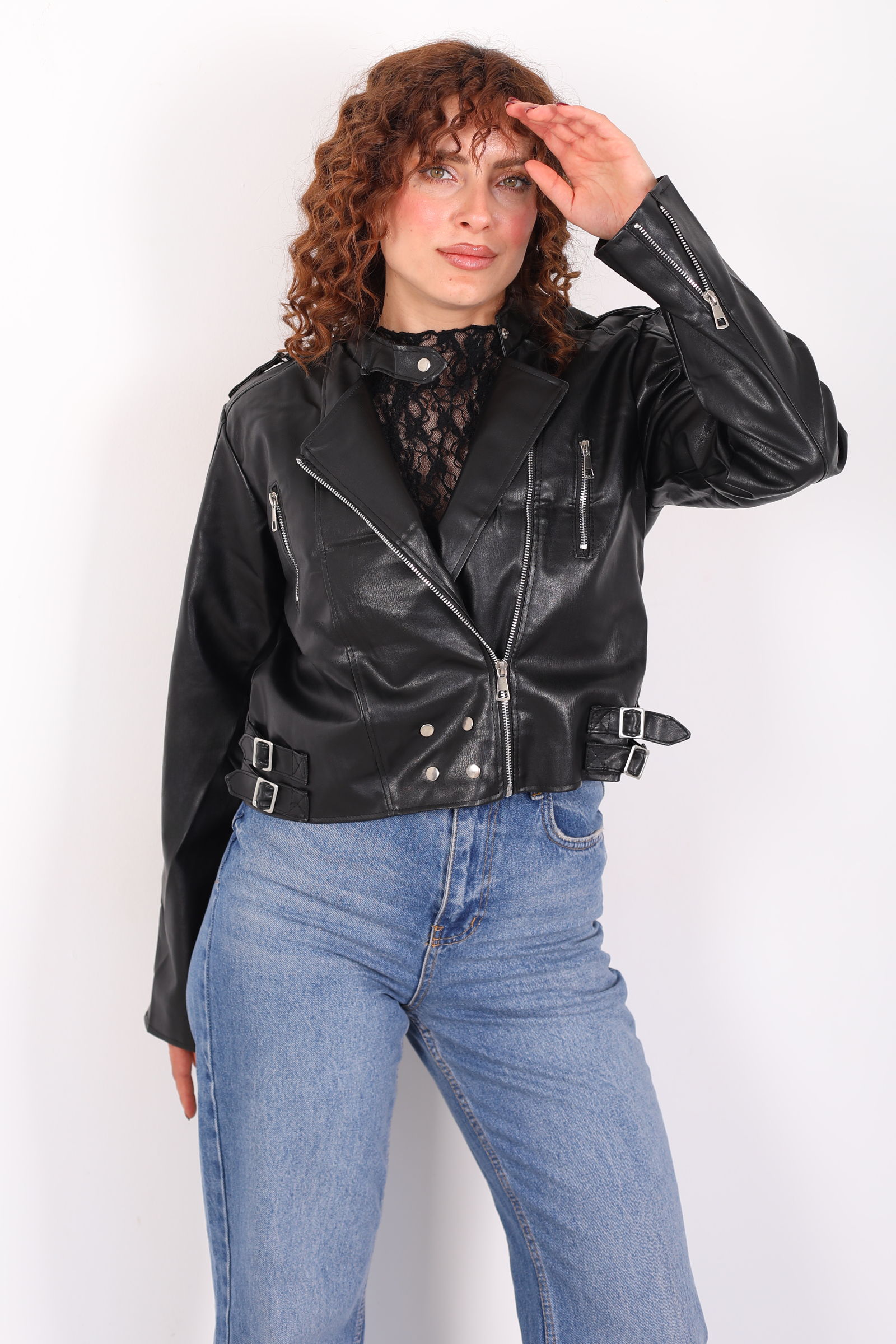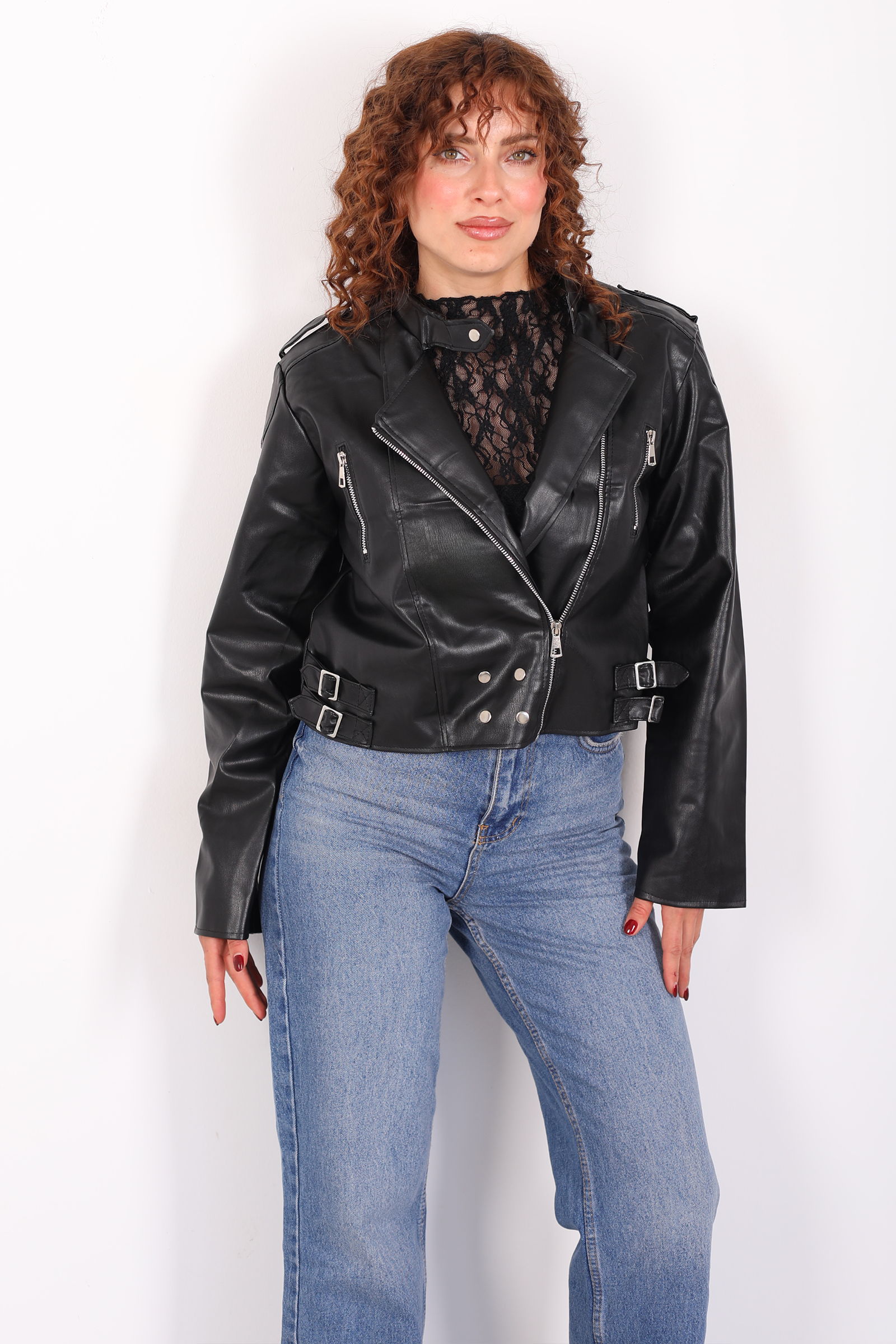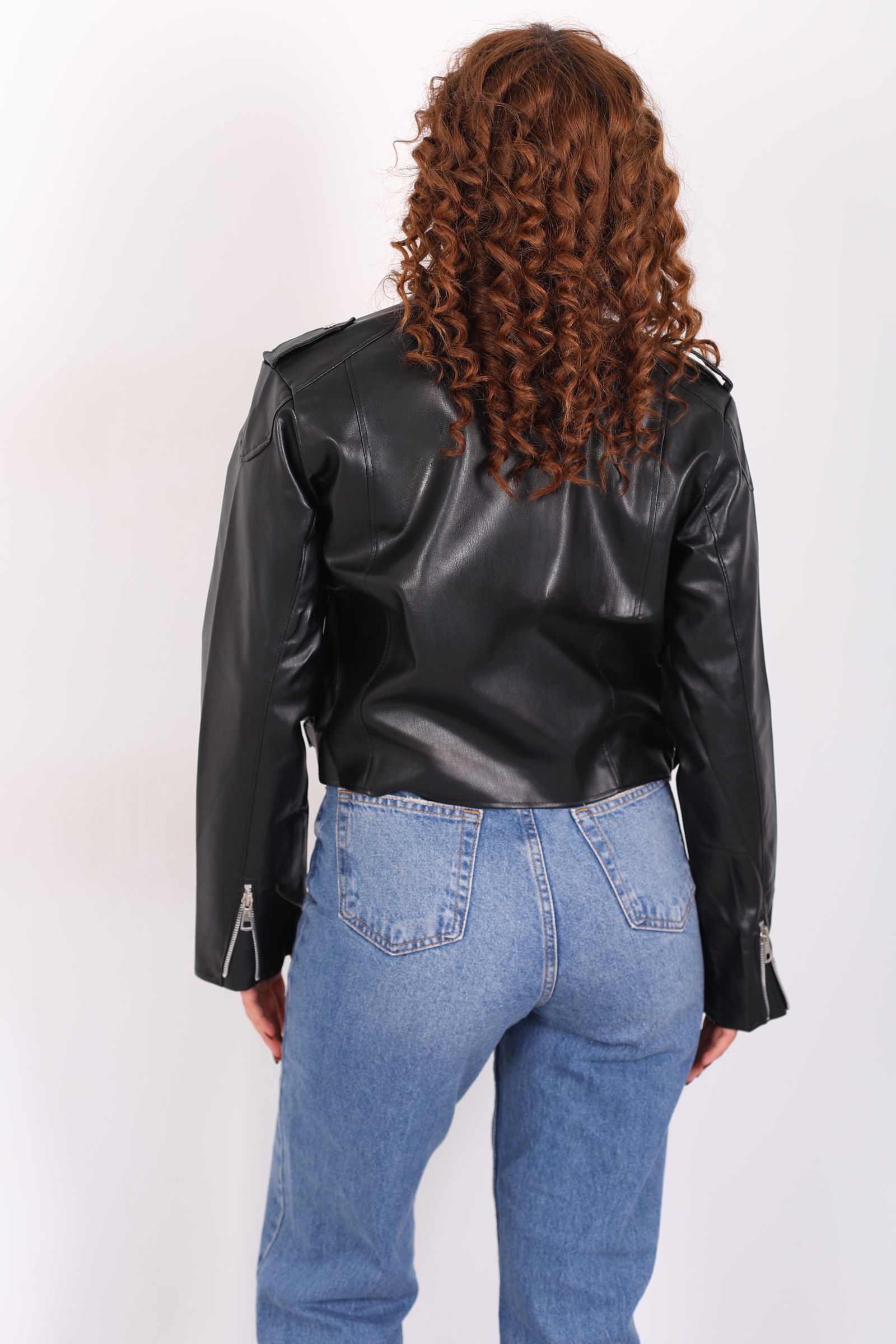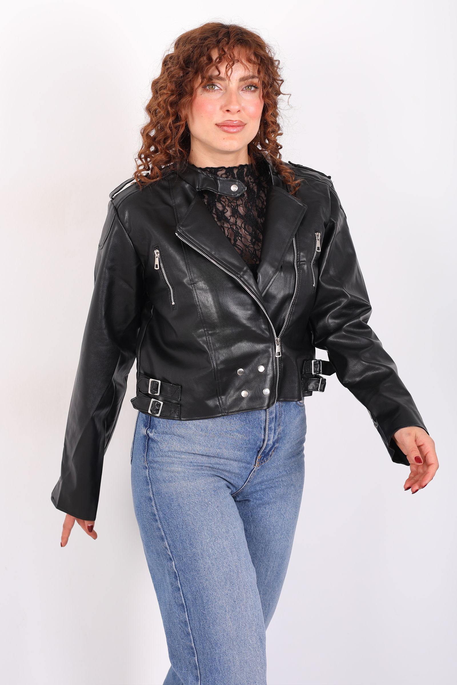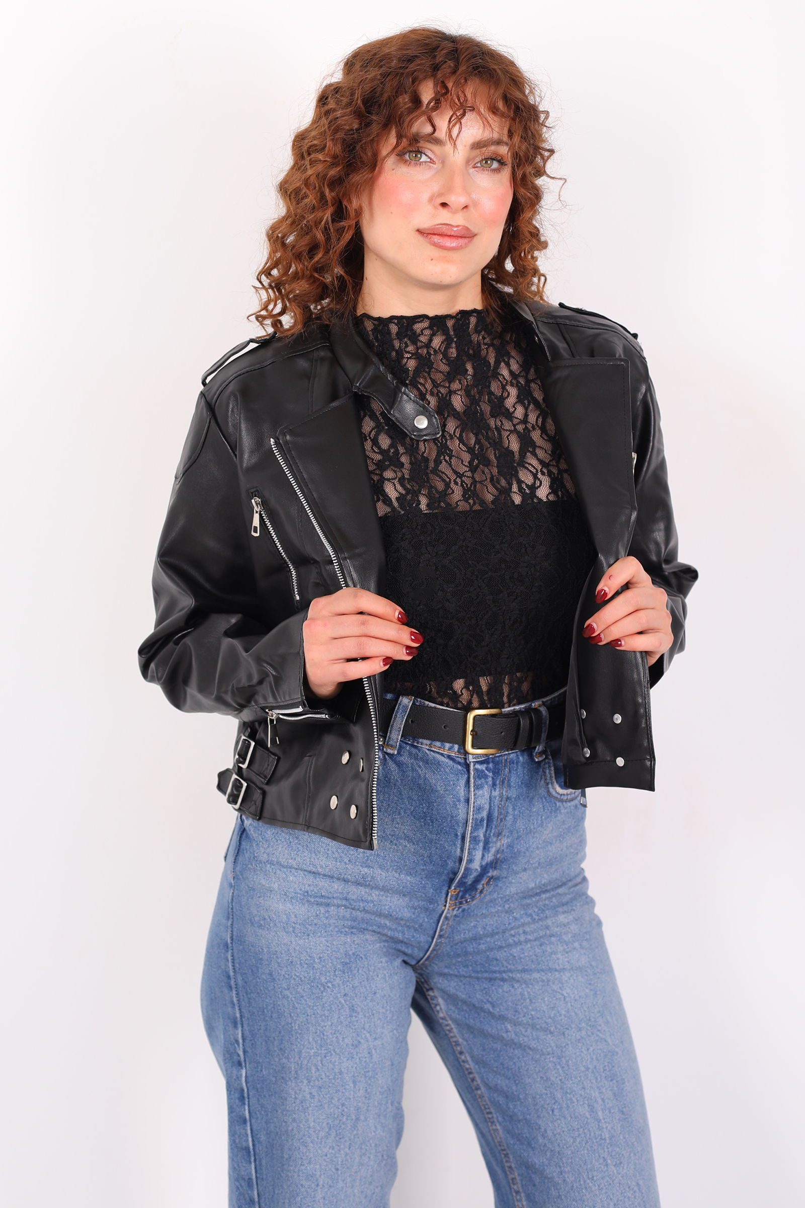 Omuzları Apoletli Yanları Kemerli Kadın Siyah Deri Ceket