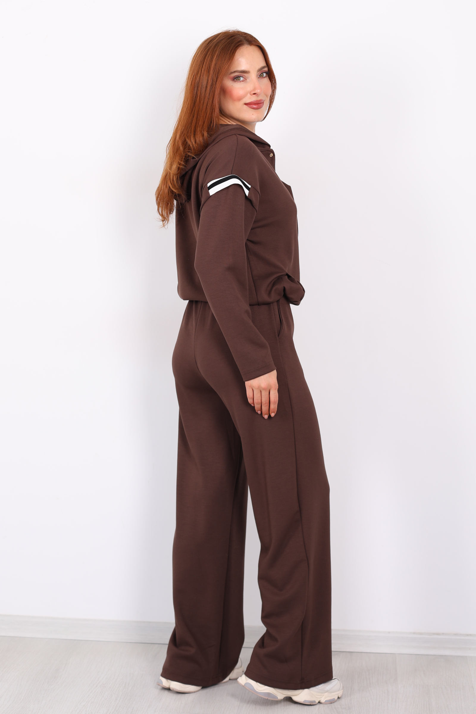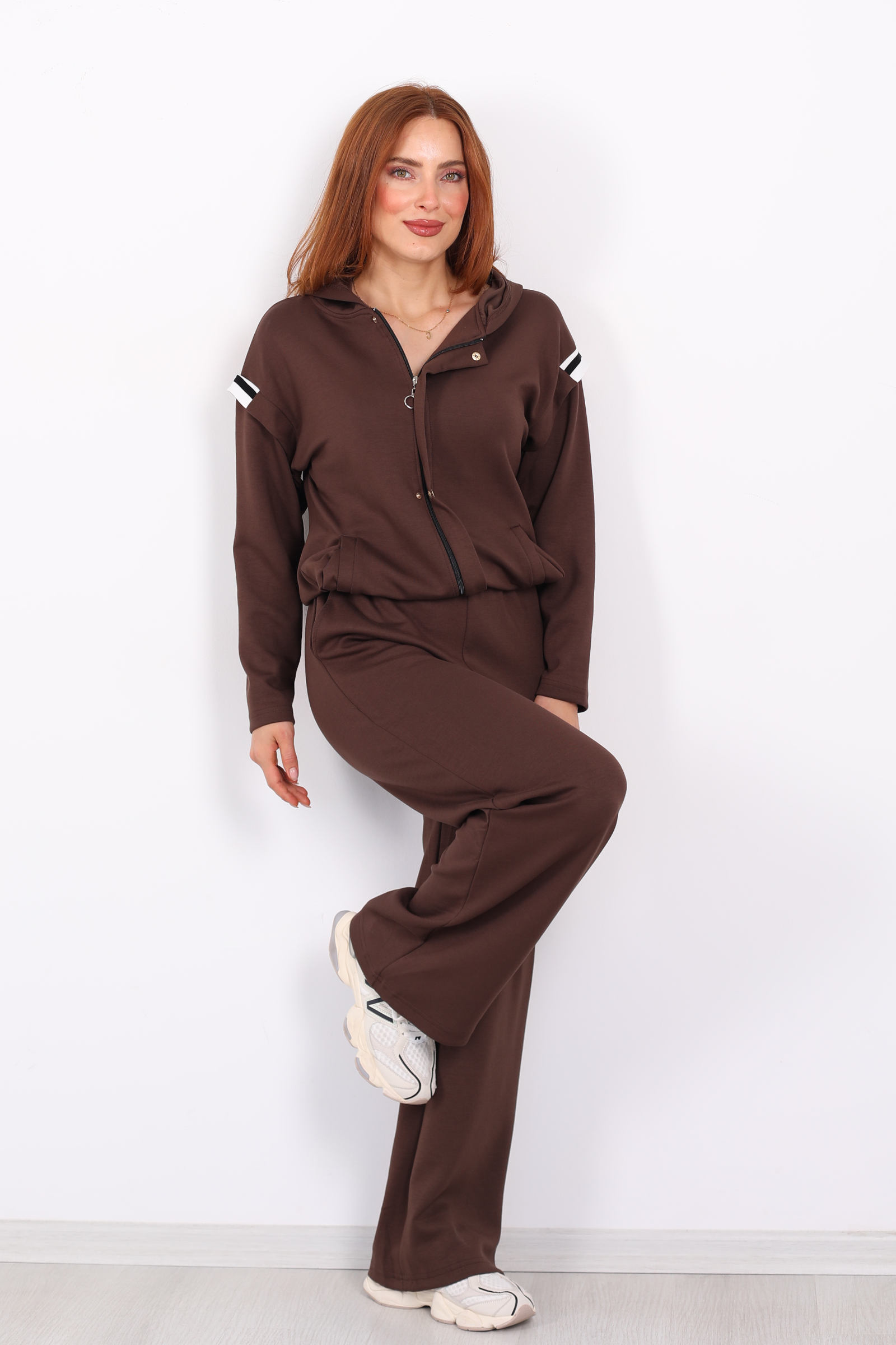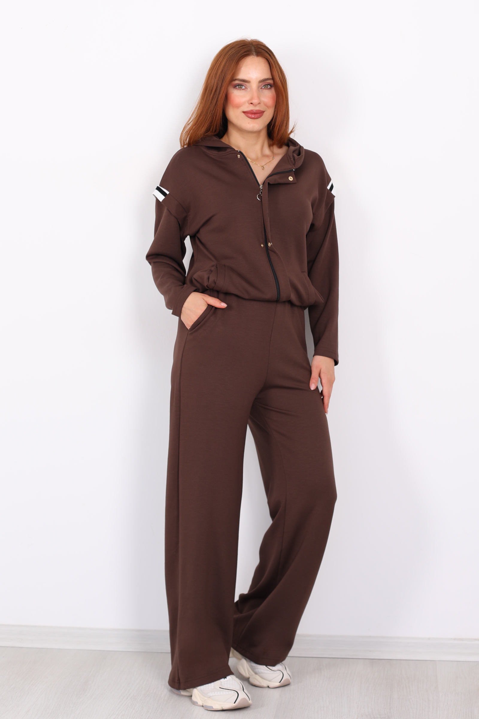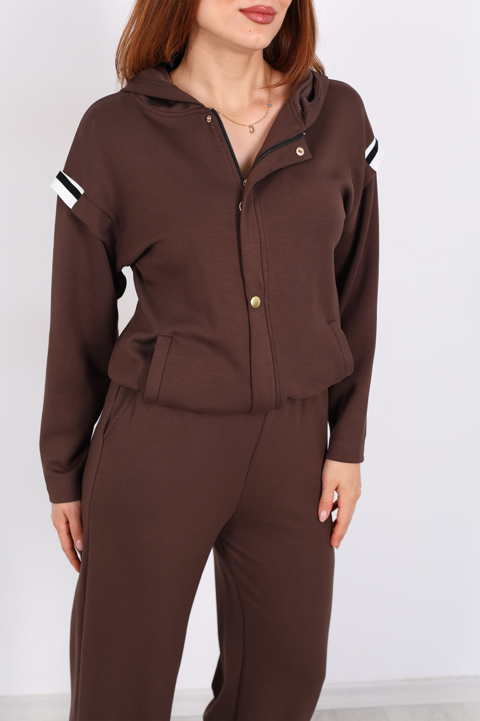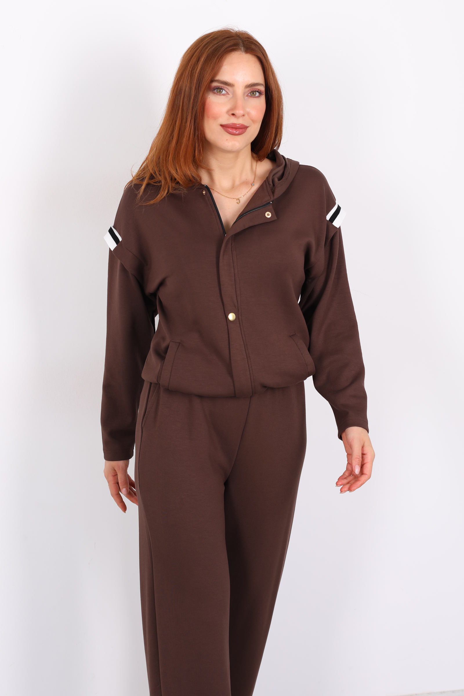 Modern çizgilerle klasik konforu buluşturan bu kahverengi modal takım, omuzlara yerleştirilen şerit detayı ve önden fermuarla dikkat çekiyor. Modal kumaş, ipeksi yumuşaklığı ve nefes alabilen yapısıyla hem gün boyu konfor sağlar hem de şık bir duruş kazandırır.