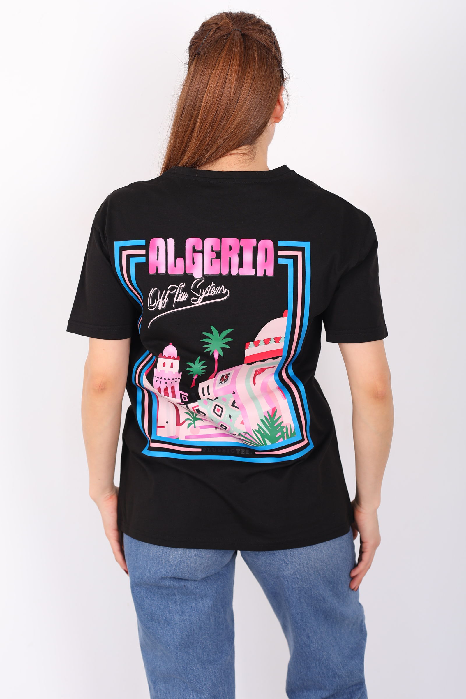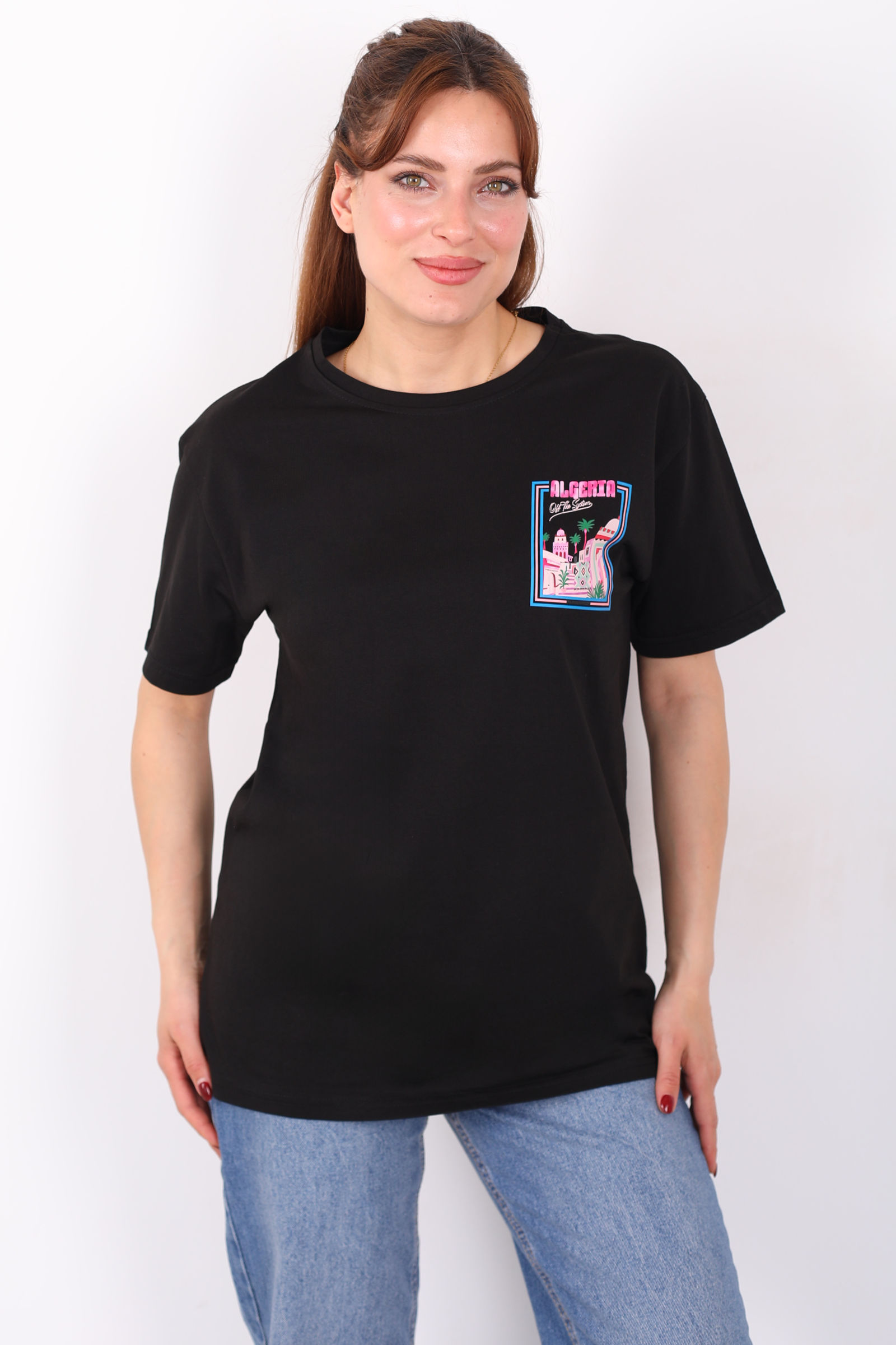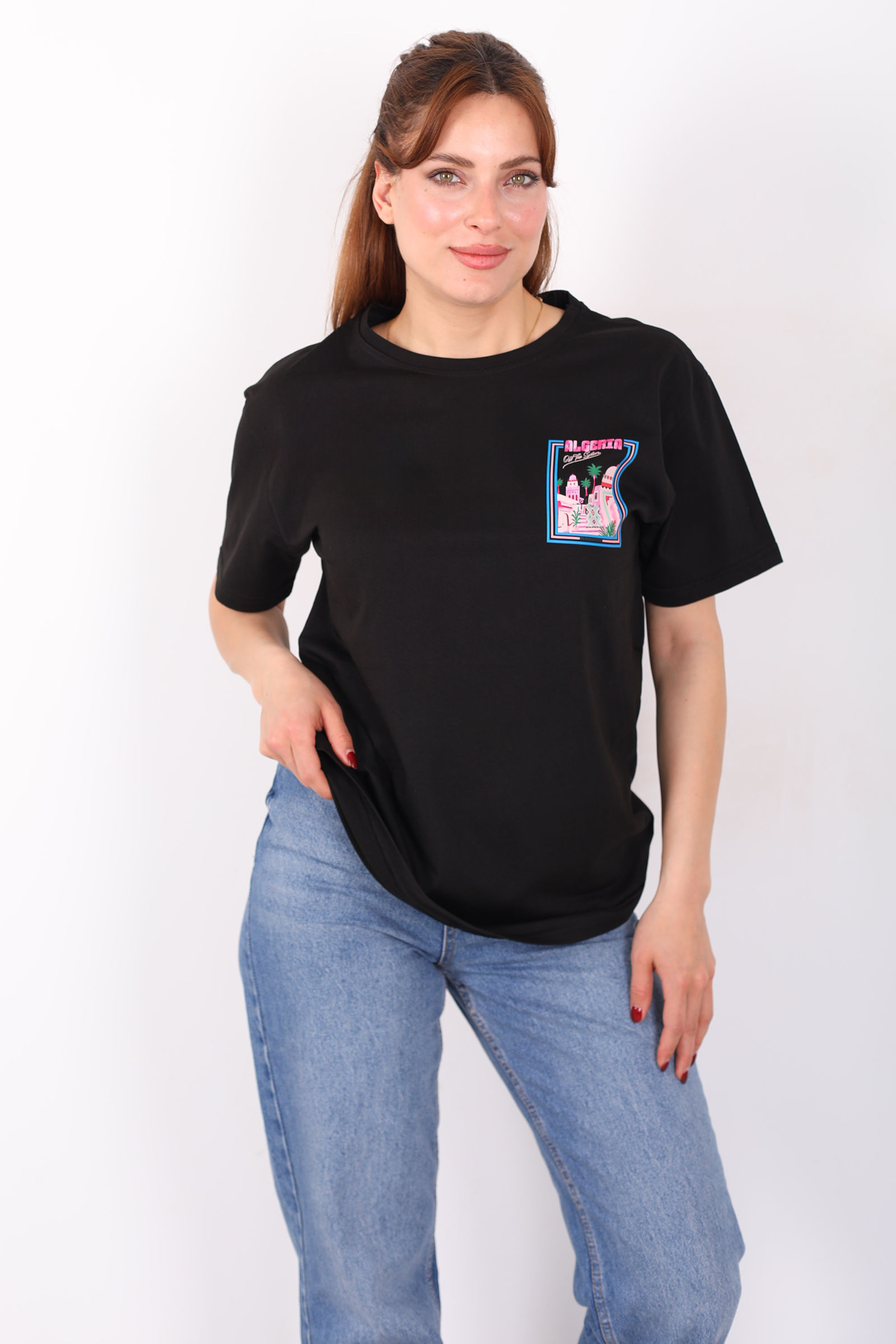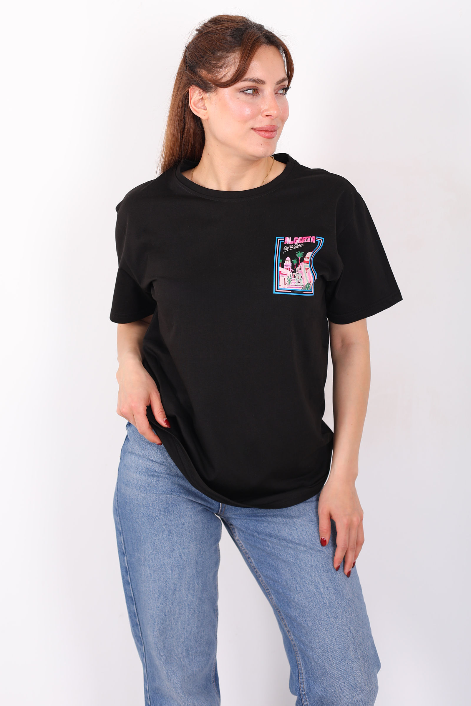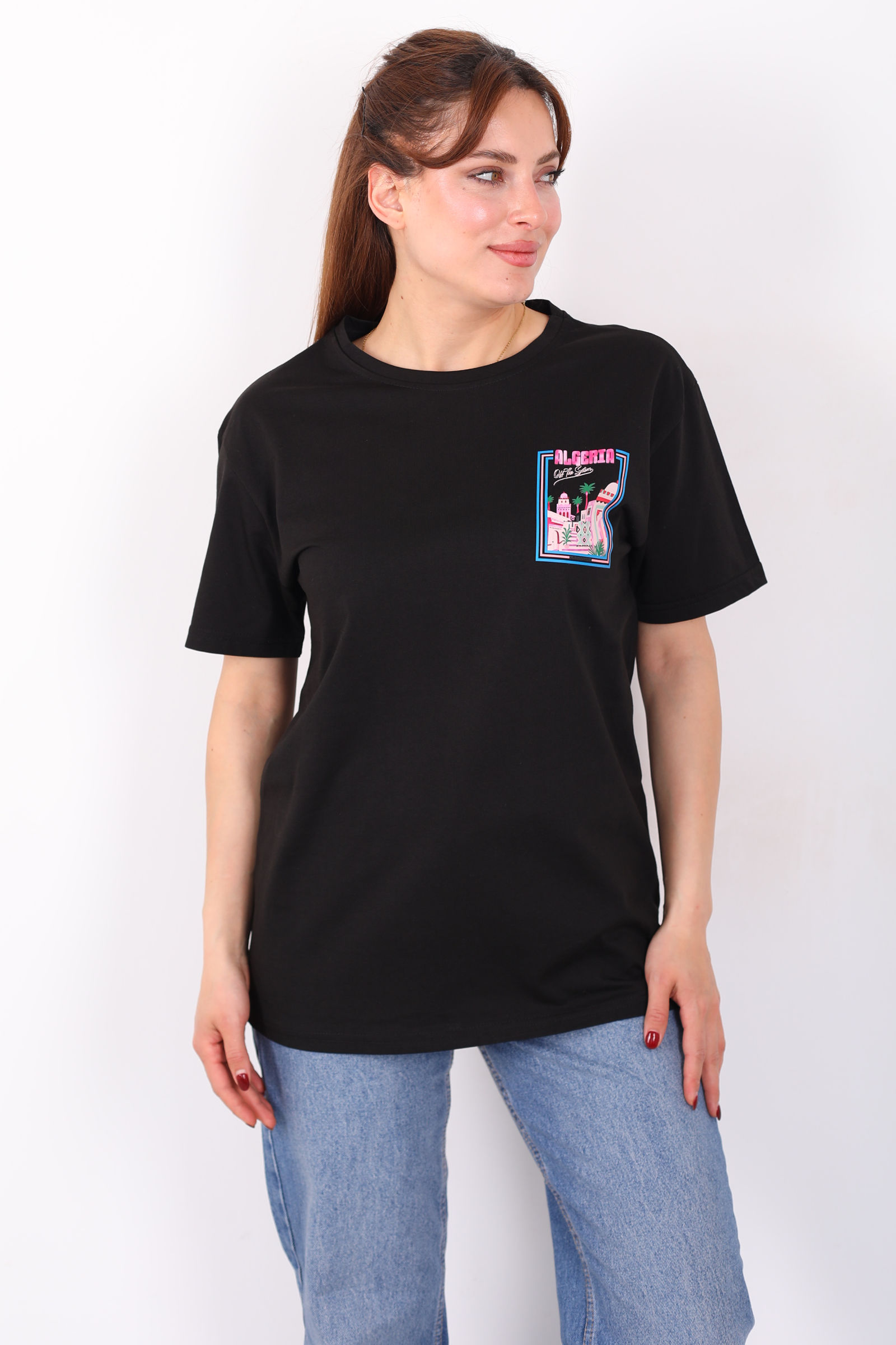 Ön Arka "Algerta" Baskılı Siyah Kadın Oversize T-Shirt