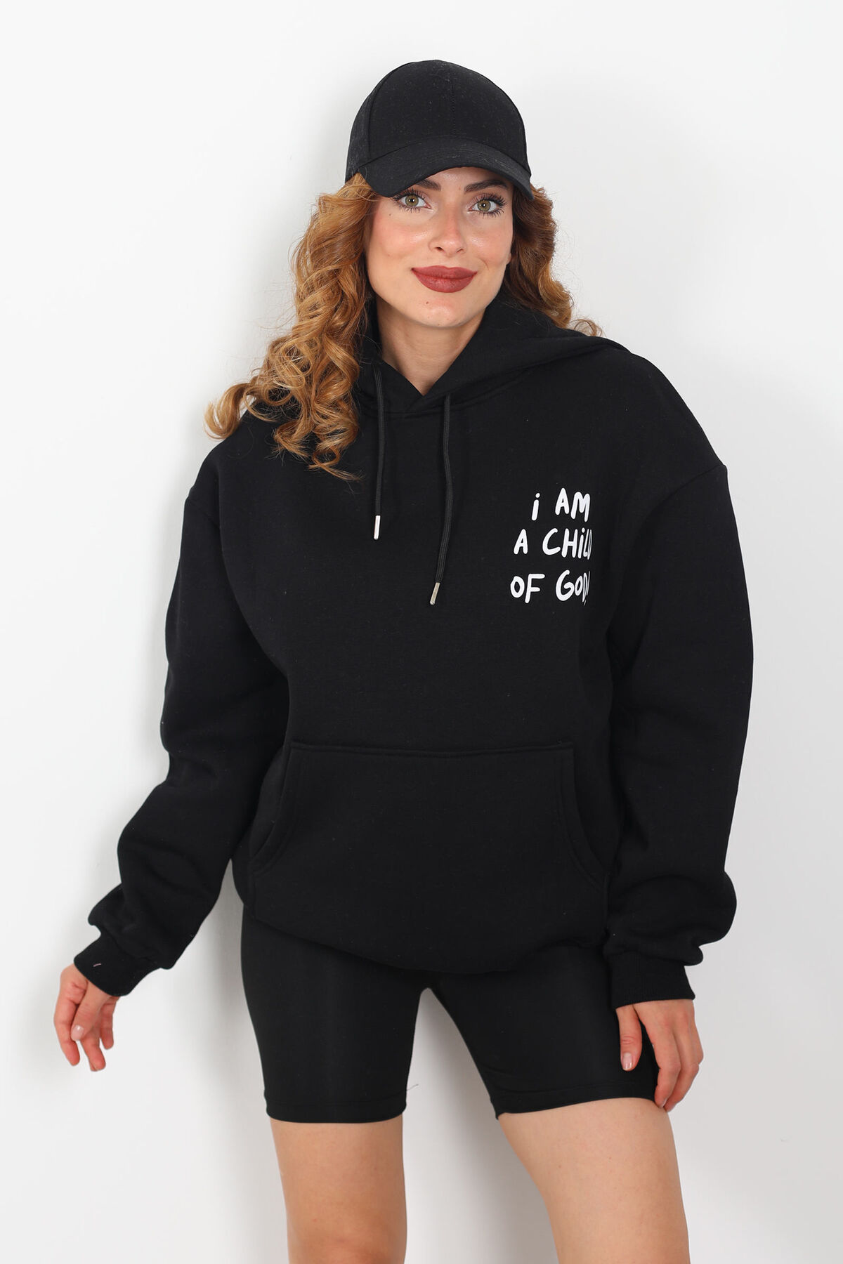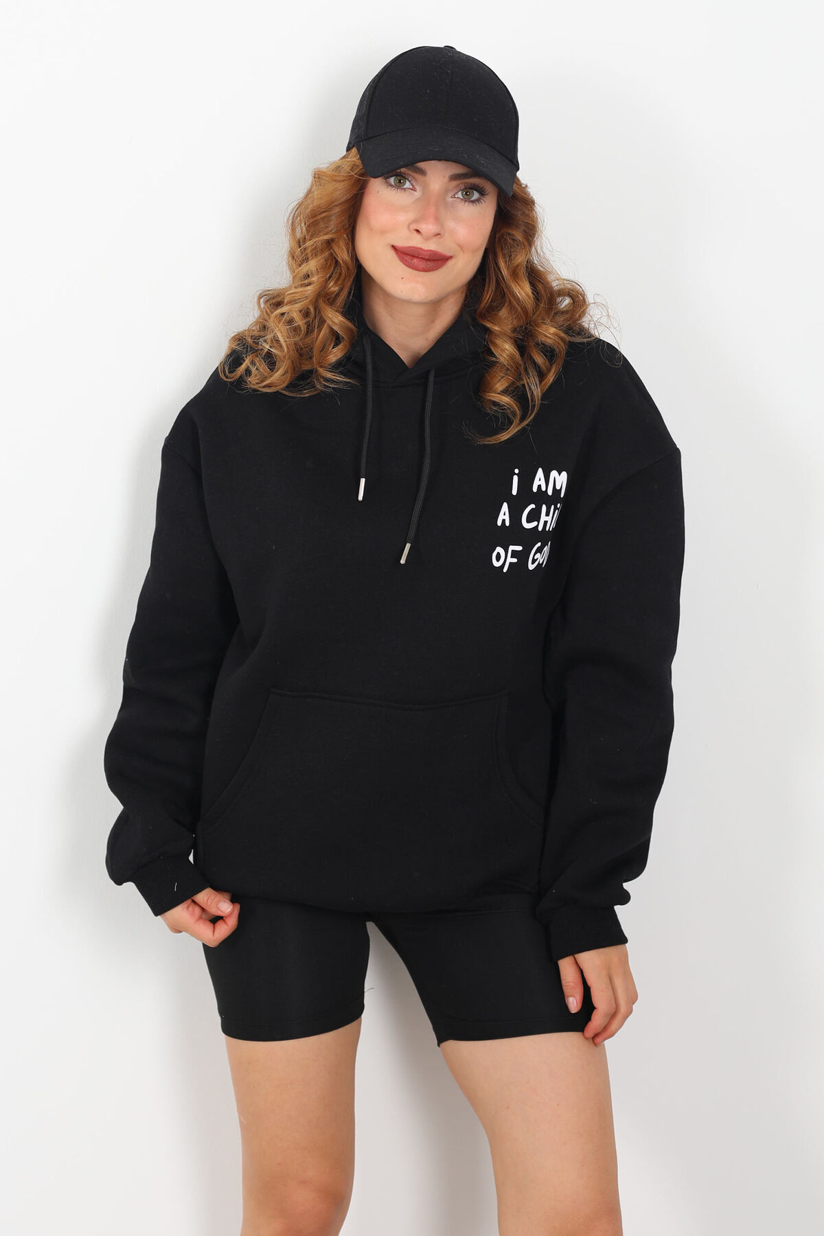 Modern şehir ruhunu yansıtan bu siyah kapüşonlu sweat, sade şıklığı çarpıcı detaylarla birleştiriyor. Hem ön hem arka kısmında yer alan özgün baskılar, tasarımı klasik bir sweatshirt olmaktan çıkarıp stil sahibi bir parçaya dönüştürüyor. Yoğun dokulu üç iplik kumaşıyla sıcak tutarken, oversize kalıbı sayesinde gün boyu konforlu bir kullanım sunar.Rahatlığı ön planda tutan kapüşon detayı ve esnek yapısı ile ister hafta sonu planlarınızda ister sokak stilinizde zahmetsizce yerini alır. Sportif dokunuşlara sahip olsa da şıklığıyla dikkat çeken bu parça, sneakers, bot ya da deri çanta gibi tamamlayıcılarla karakteristik bir görünüme bürünür.