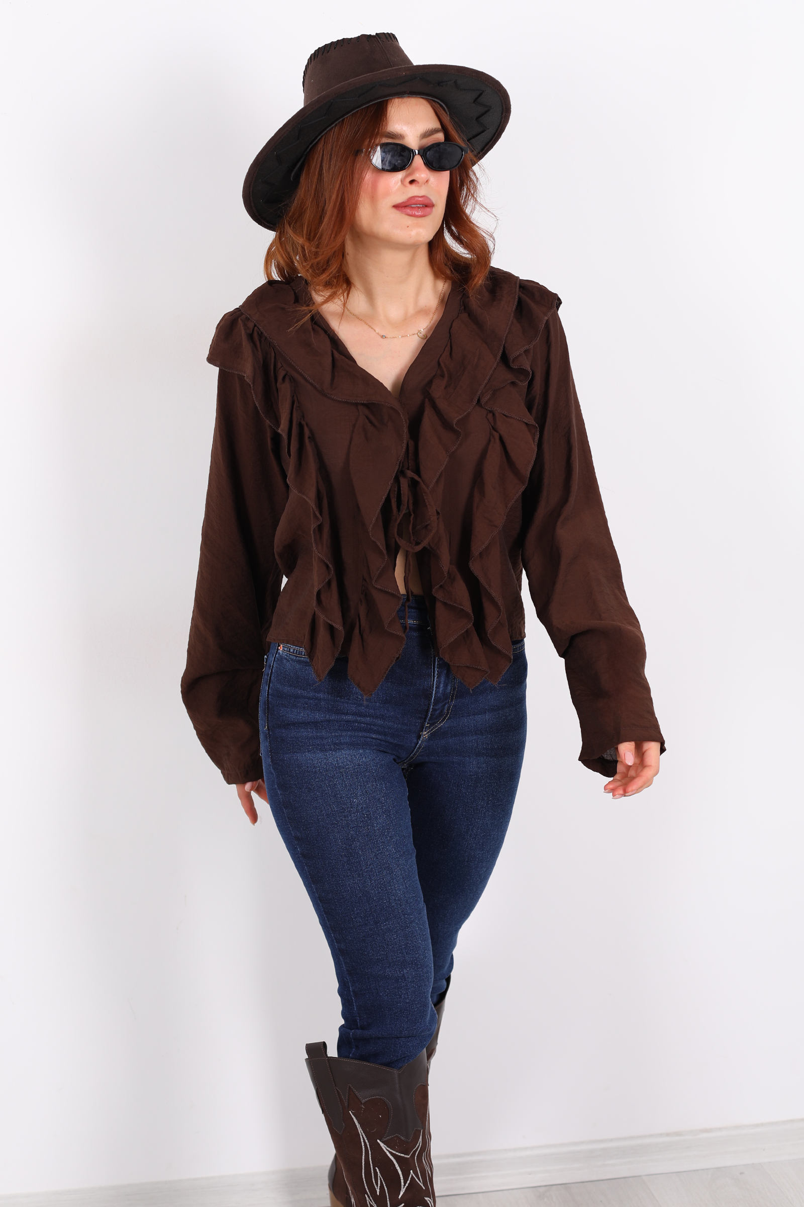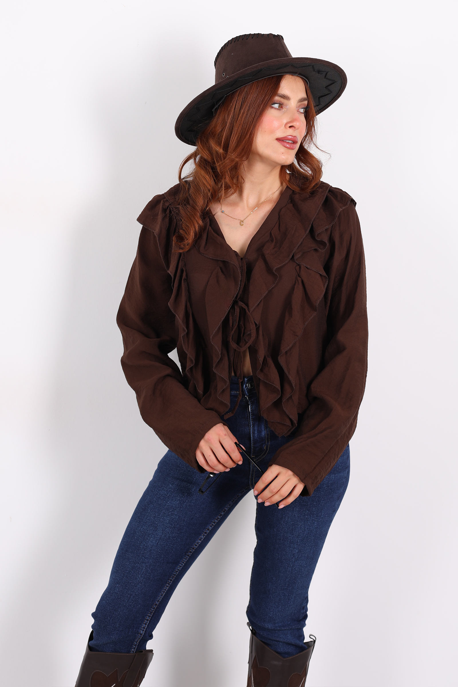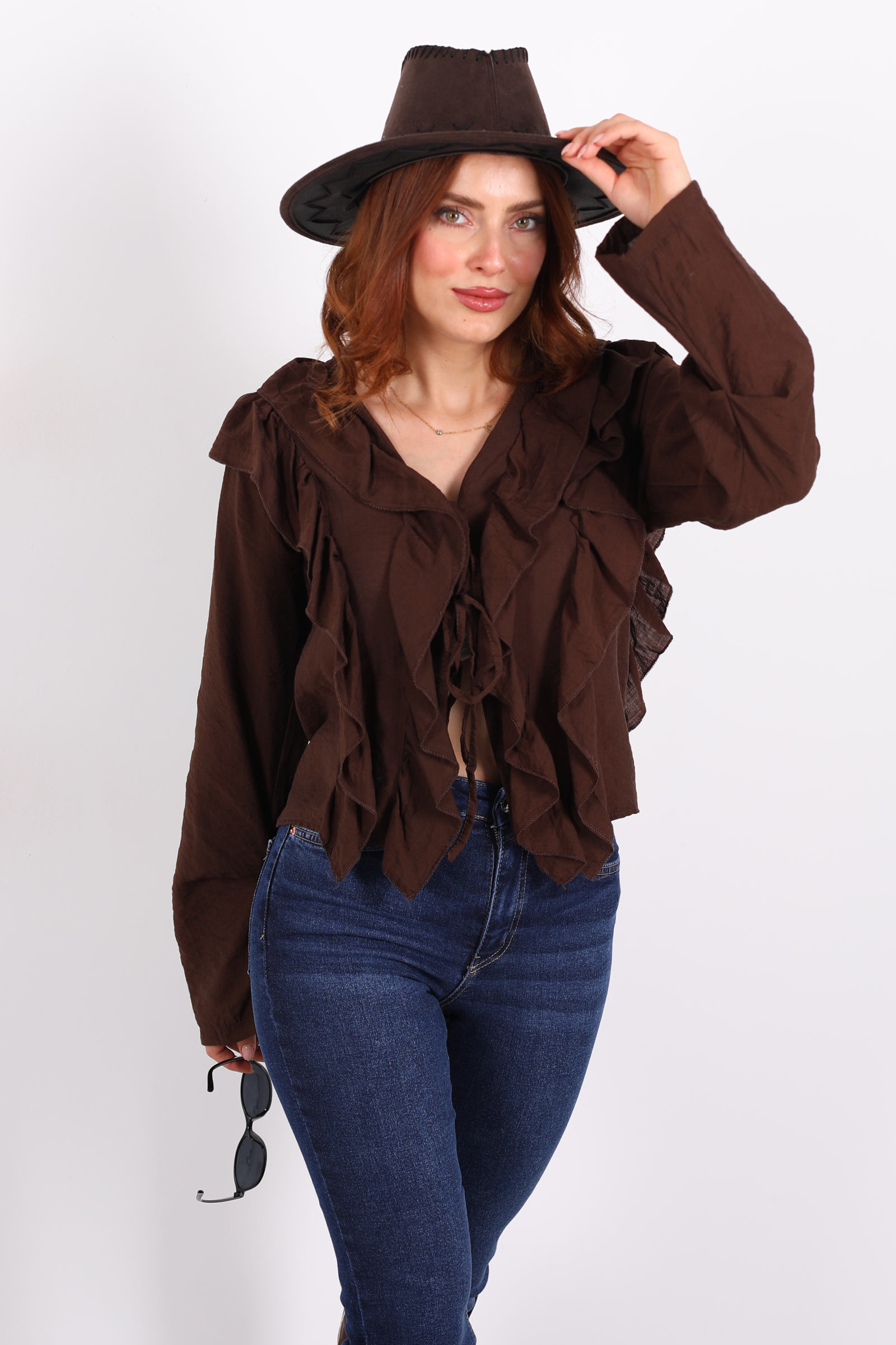 Bu kahverengi fırfırlı bluz, hem bohem zarafeti hem de hafif bir romantizmi muhteşem şekilde harmanlıyor. Göğüs ve yakada yer alan toka detayı, bluzun stiline modern bir dokunuş katarken bağlama detayı, hem bel hatını nazikçe vurgular hem de siluete feminen bir akıcılık kazandırır. Yanlardaki fırfır volanlar hareketle oynayan bir hacim oluşturur, bu da bluzu her mevsim enerjik ve hayat dolu bir hâle getirir.