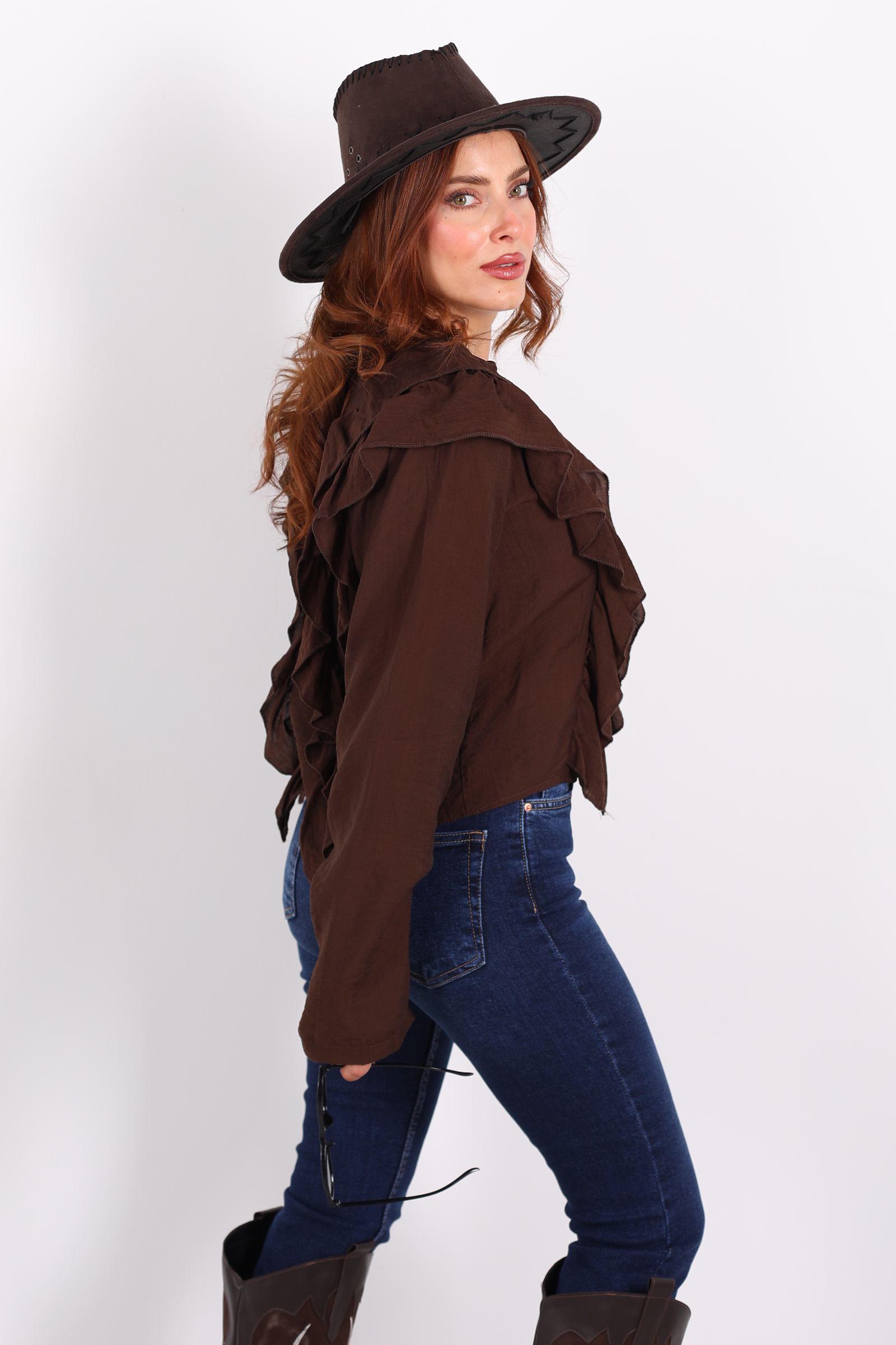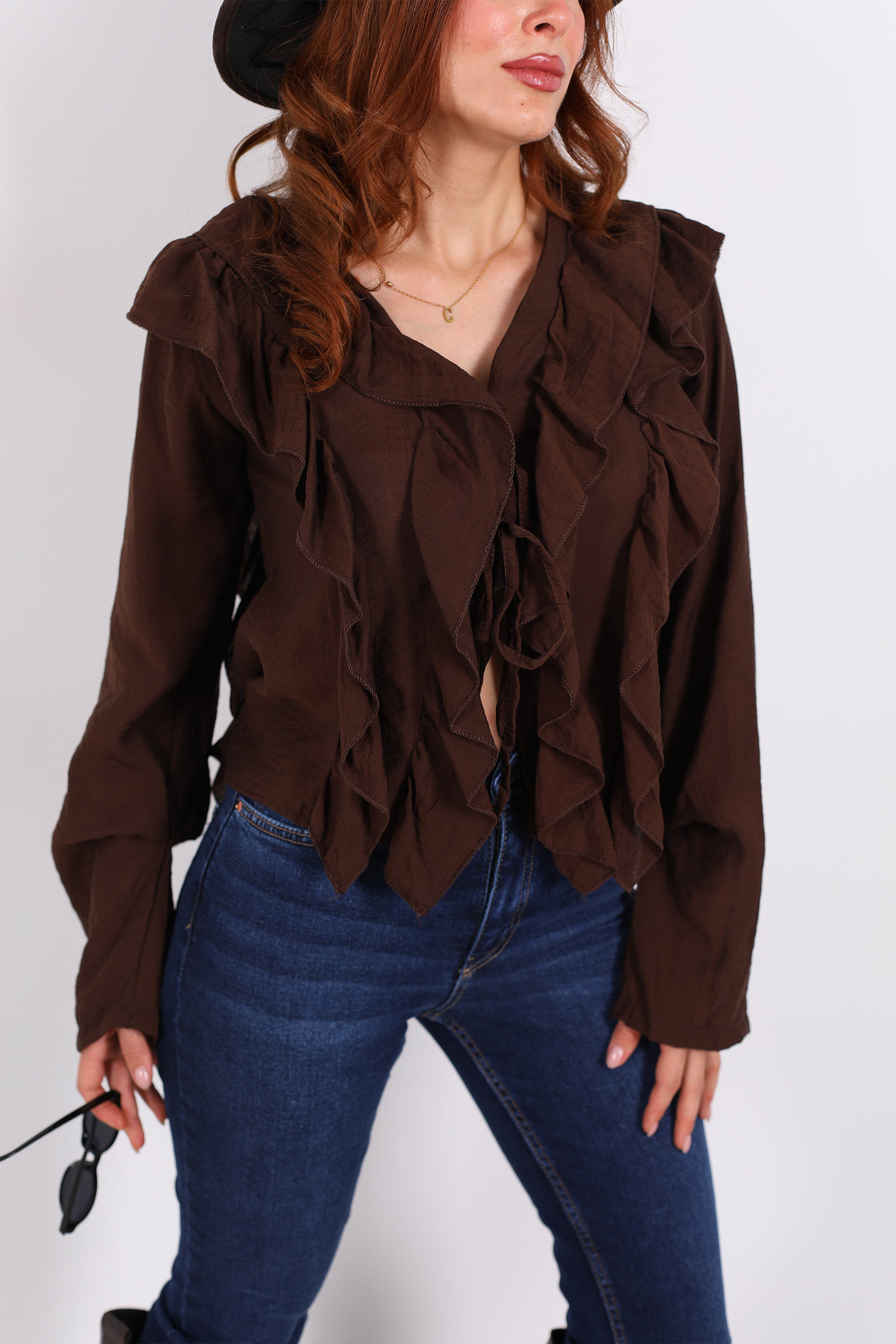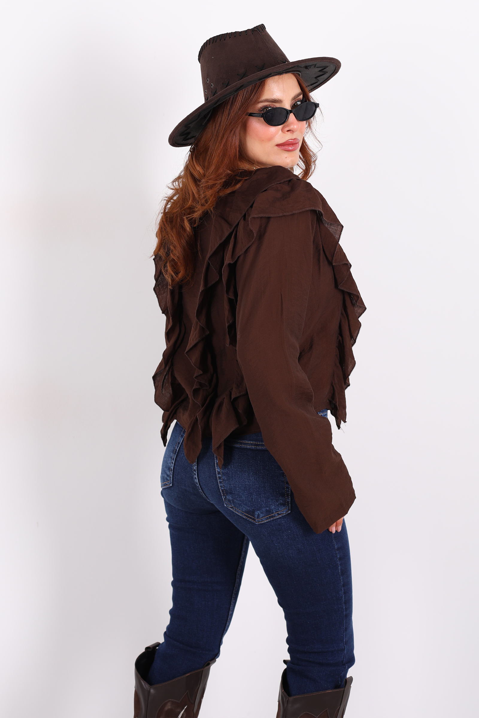Bu kahverengi fırfırlı bluz, hem bohem zarafeti hem de hafif bir romantizmi muhteşem şekilde harmanlıyor. Göğüs ve yakada yer alan toka detayı, bluzun stiline modern bir dokunuş katarken bağlama detayı, hem bel hatını nazikçe vurgular hem de siluete feminen bir akıcılık kazandırır. Yanlardaki fırfır volanlar hareketle oynayan bir hacim oluşturur, bu da bluzu her mevsim enerjik ve hayat dolu bir hâle getirir.