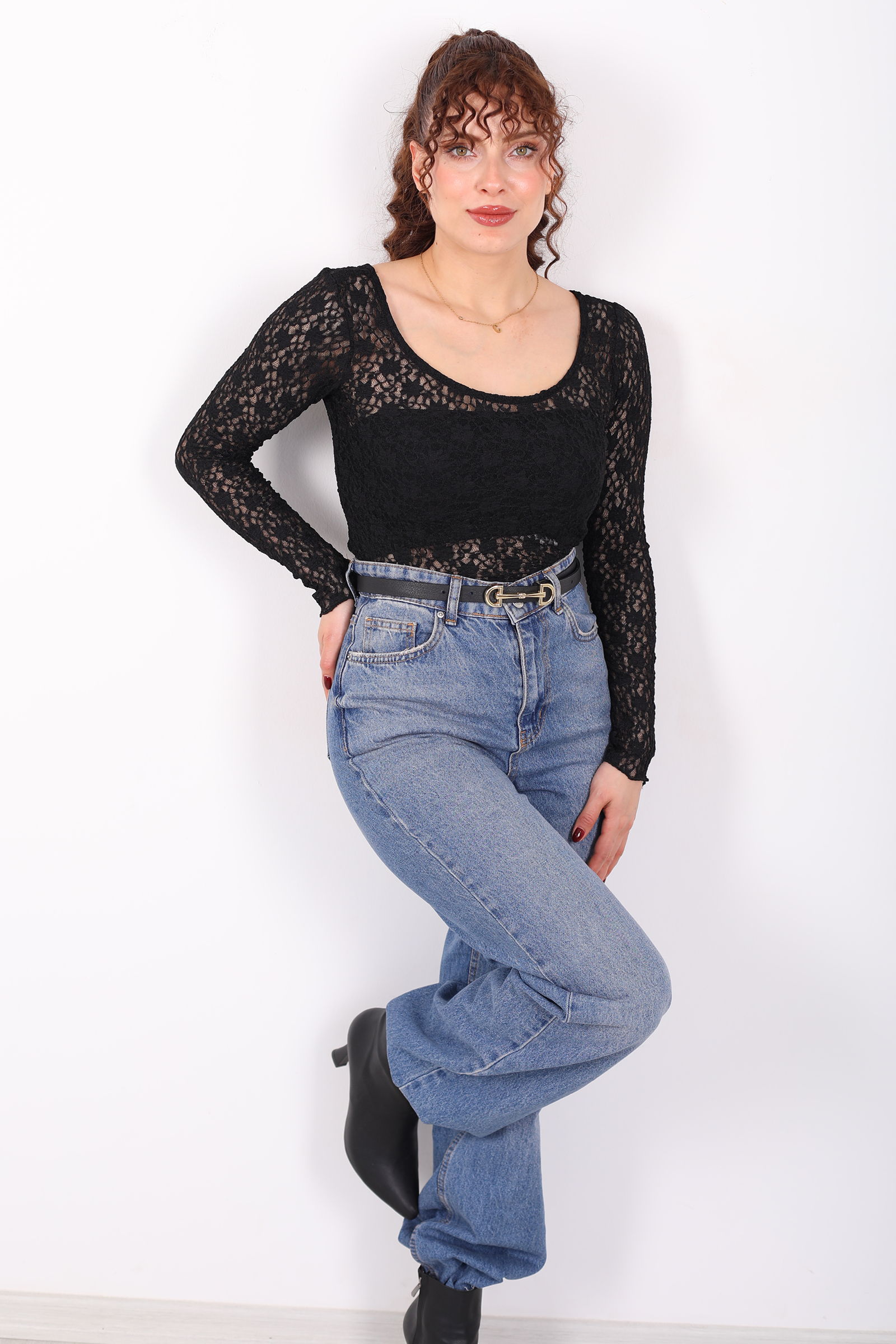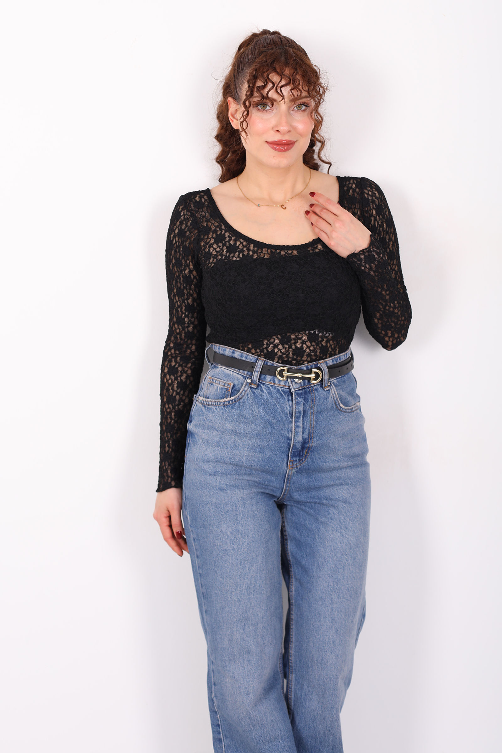 Feminen detayların cesur yorumu: ön-arka U-yaka dantel siyah kadın crop bluz, gece stilinden özel buluşmalara kadar dikkat çeken bir parça olmak için tasarlandı. Derin siyah tonu, zarif U-yaka kesimi ve ince dantel dokusu ile sofistike bir duruş sunar. Crop uzunluk, modern ve enerjik bir siluet yaratarak görünümünü anında canlılaştırır.