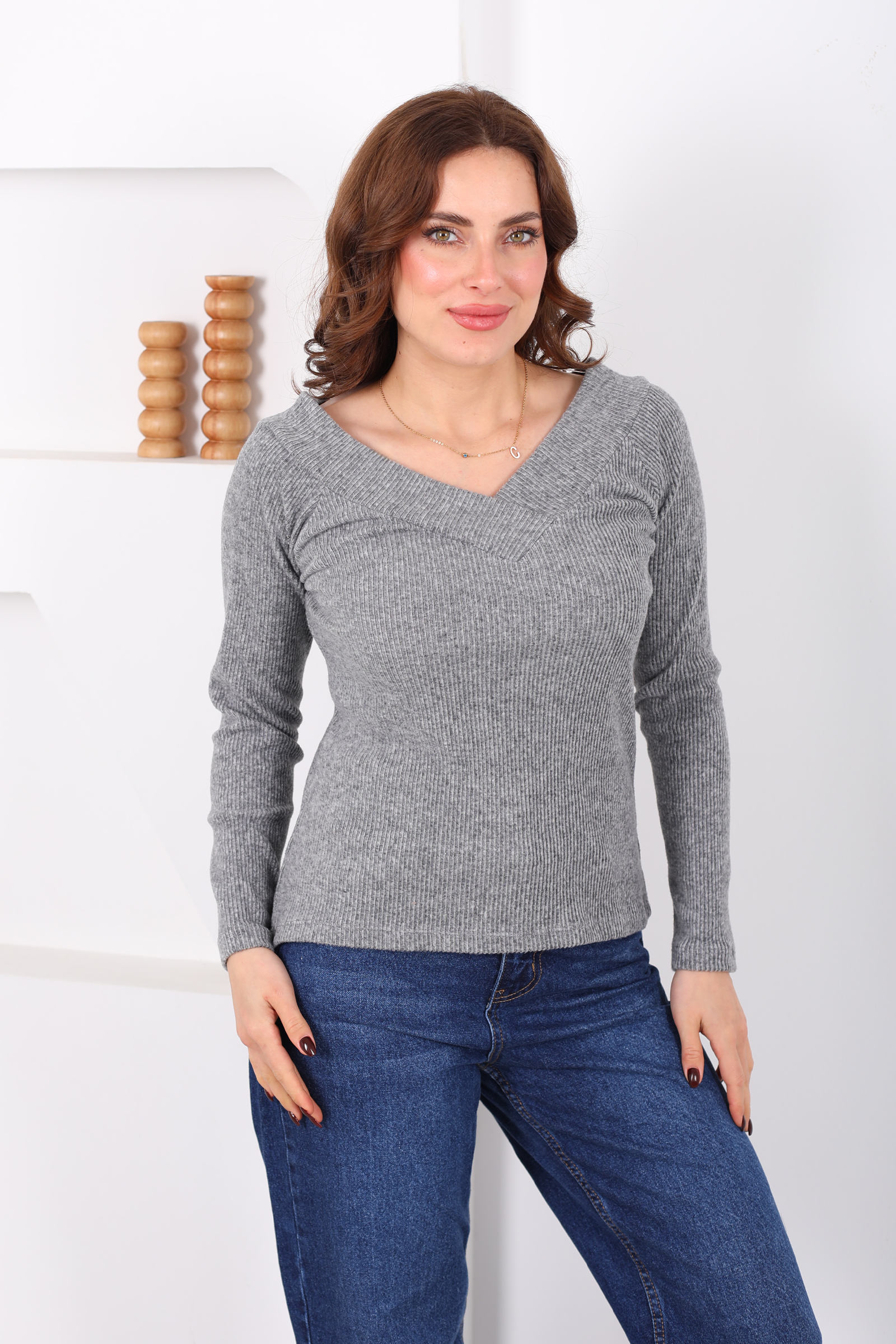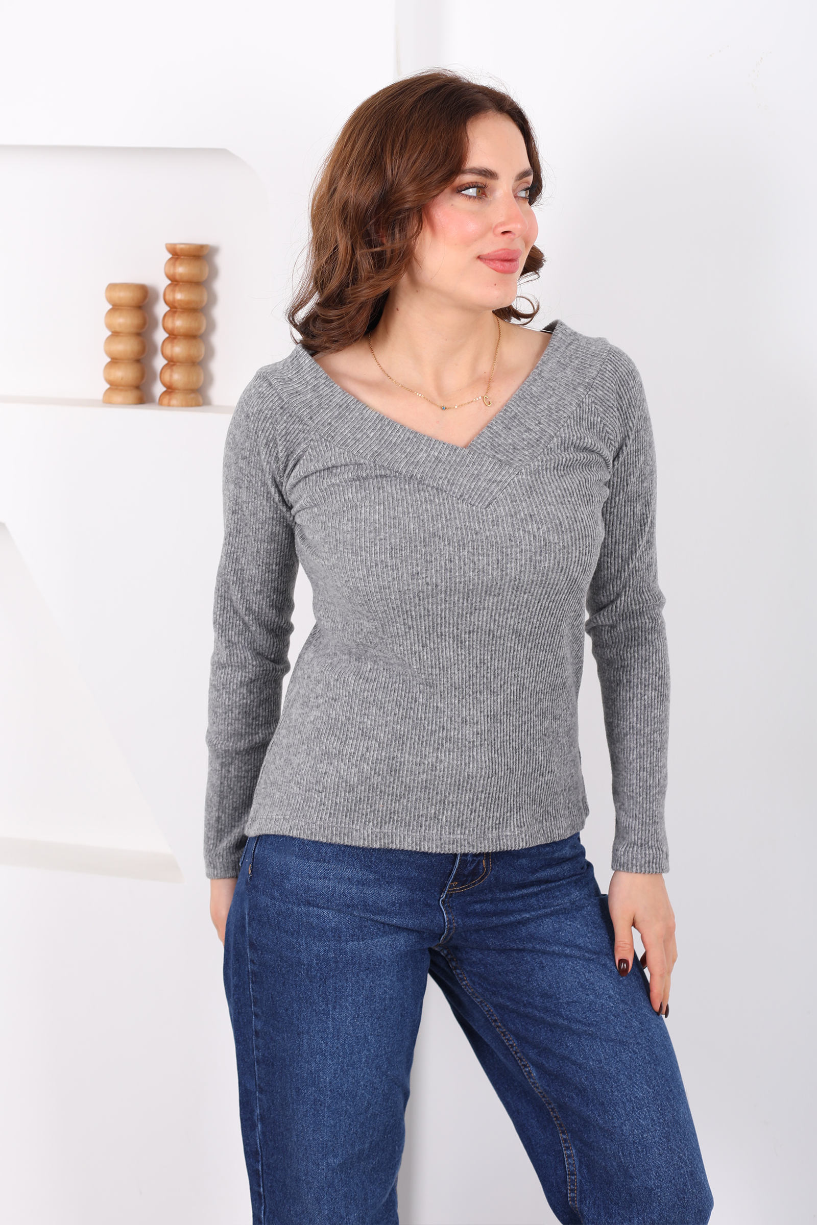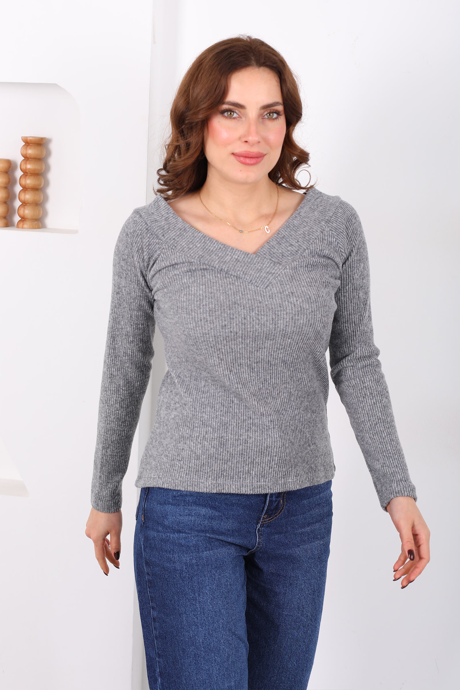 Ön Arka V - Yaka Kadın Antrasit Triko Kazak